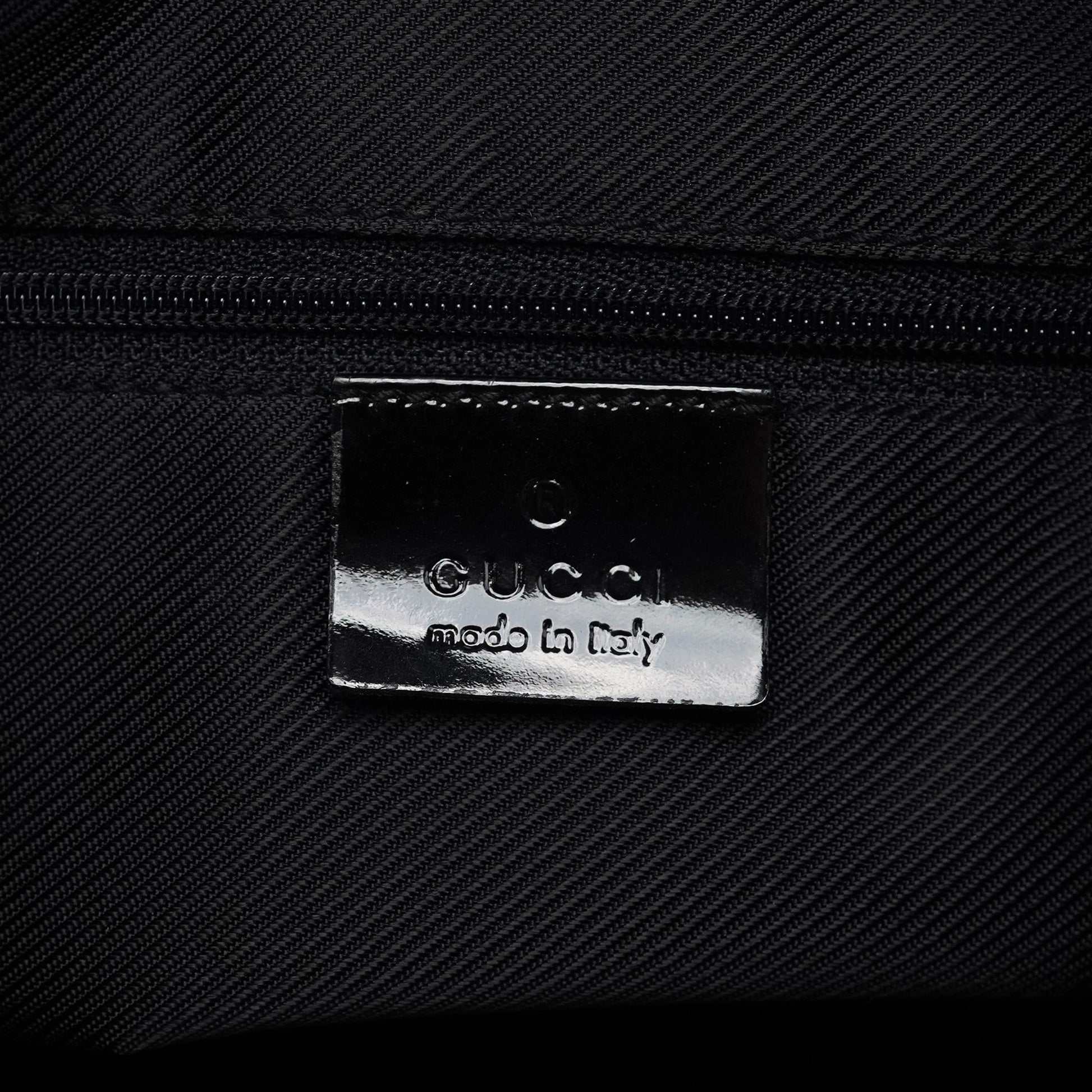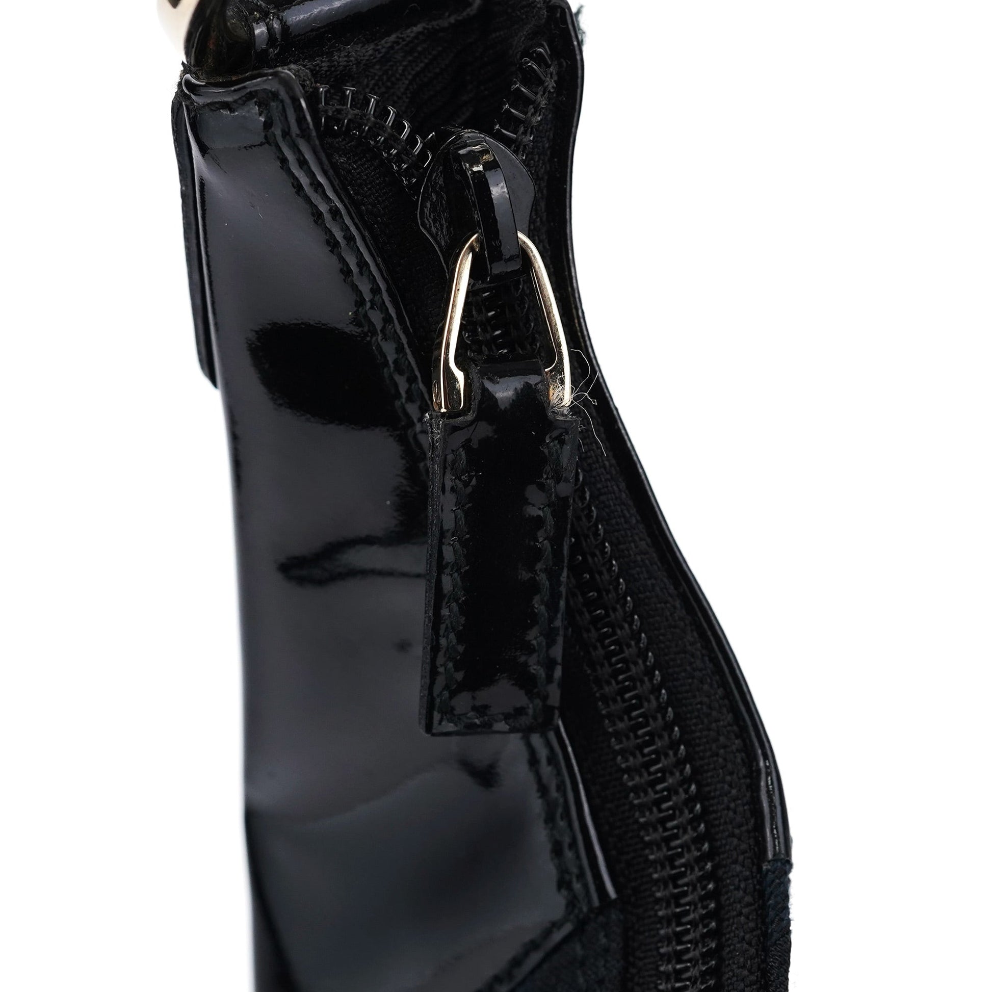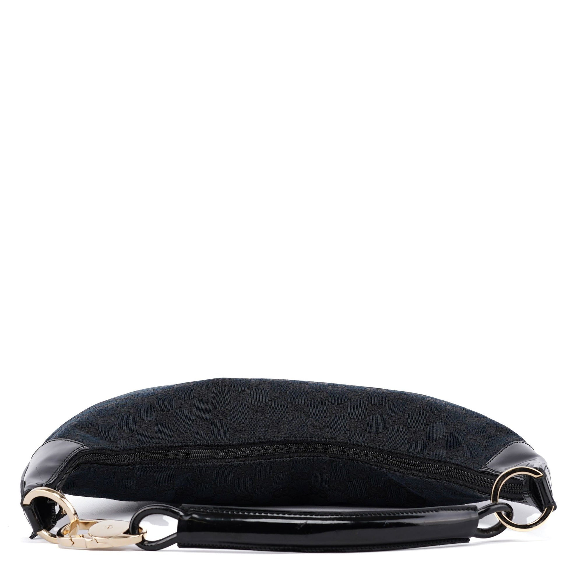 This Gucci GG shoulder bag, designed by Tom Ford in the late 1990s, combines black GG monogram canvas with black patent leather trim and gold-tone Gucci-engraved hardware. It features a satin-lined interior with a zip pocket and zipper closure.
