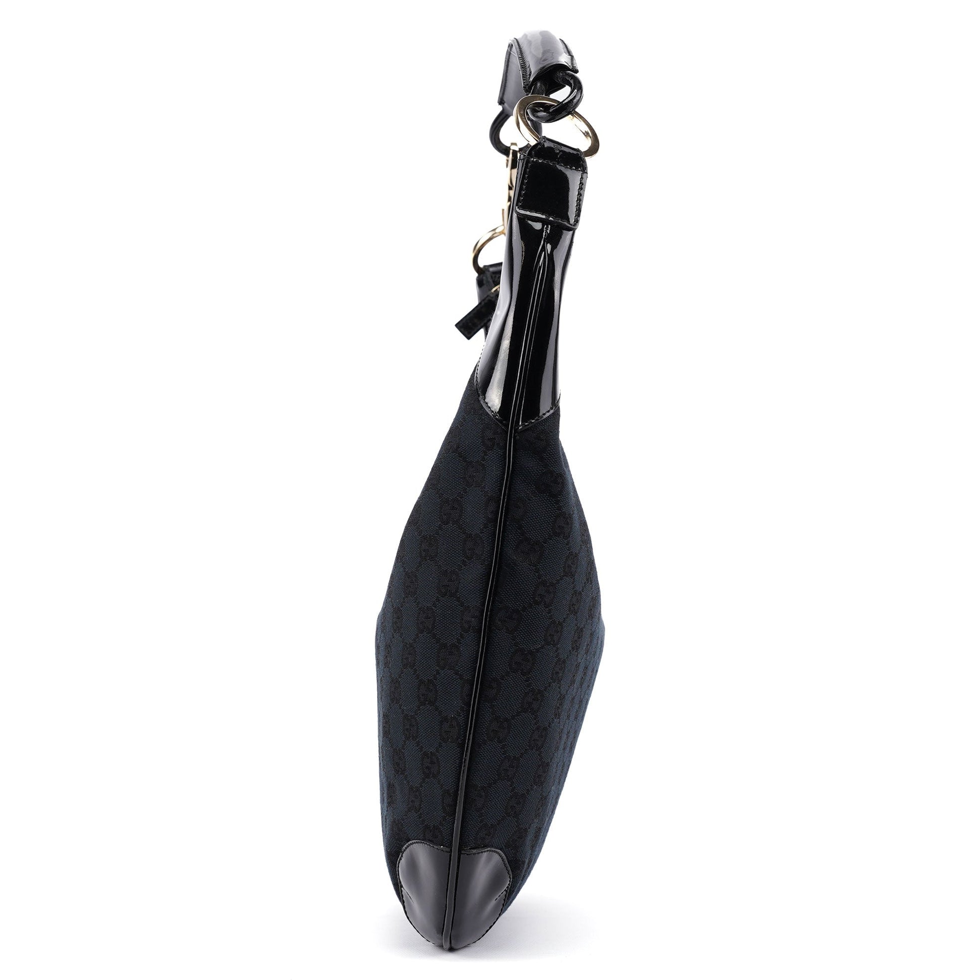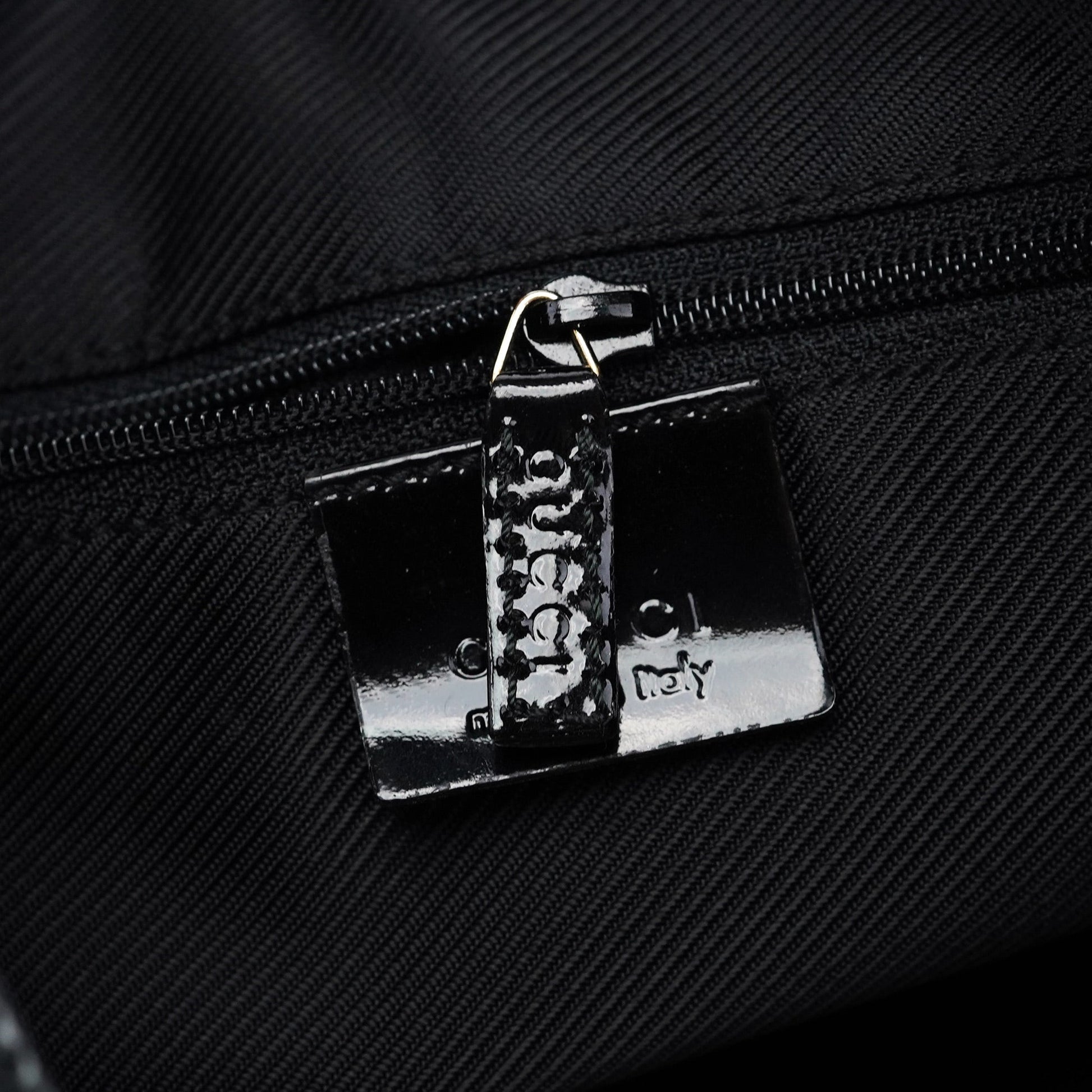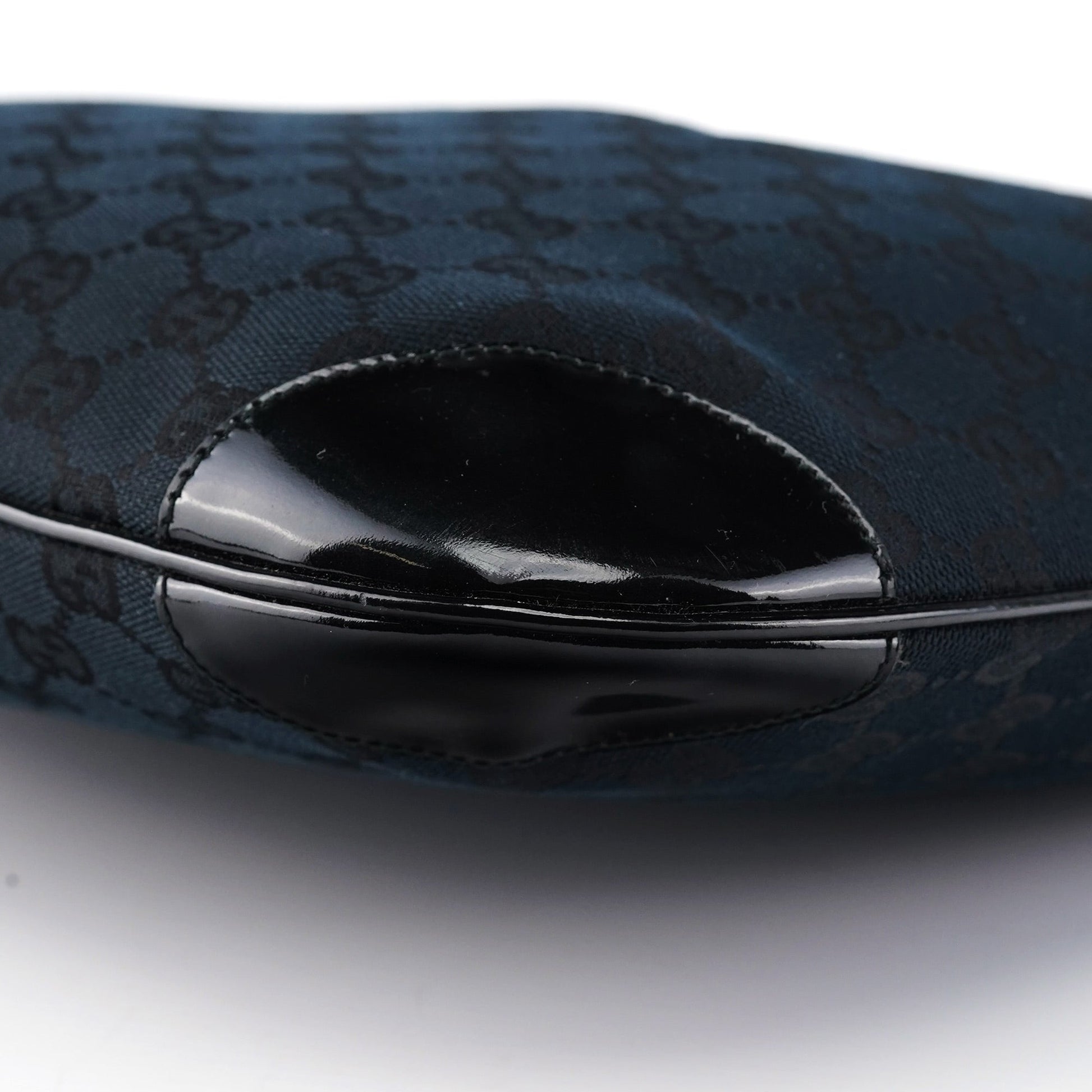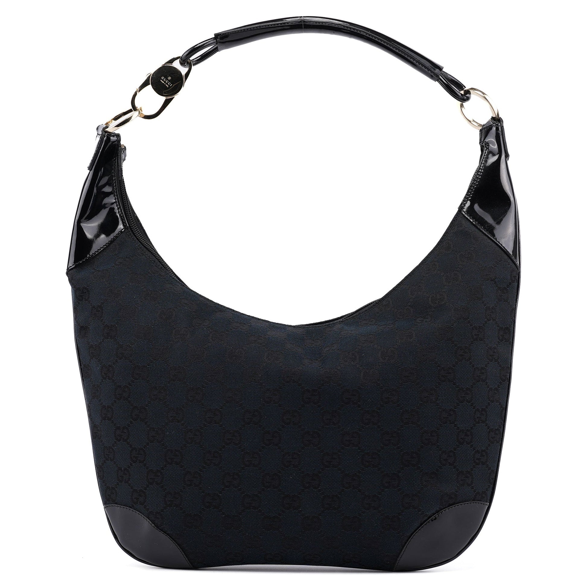 This Gucci GG shoulder bag, designed by Tom Ford in the late 1990s, combines black GG monogram canvas with black patent leather trim and gold-tone Gucci-engraved hardware. It features a satin-lined interior with a zip pocket and zipper closure.