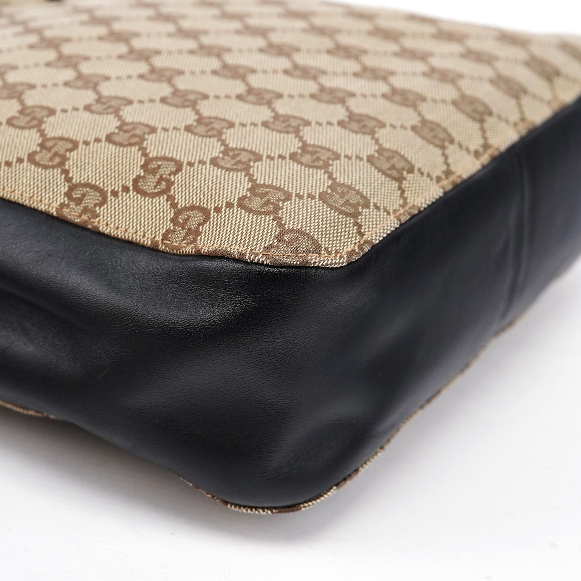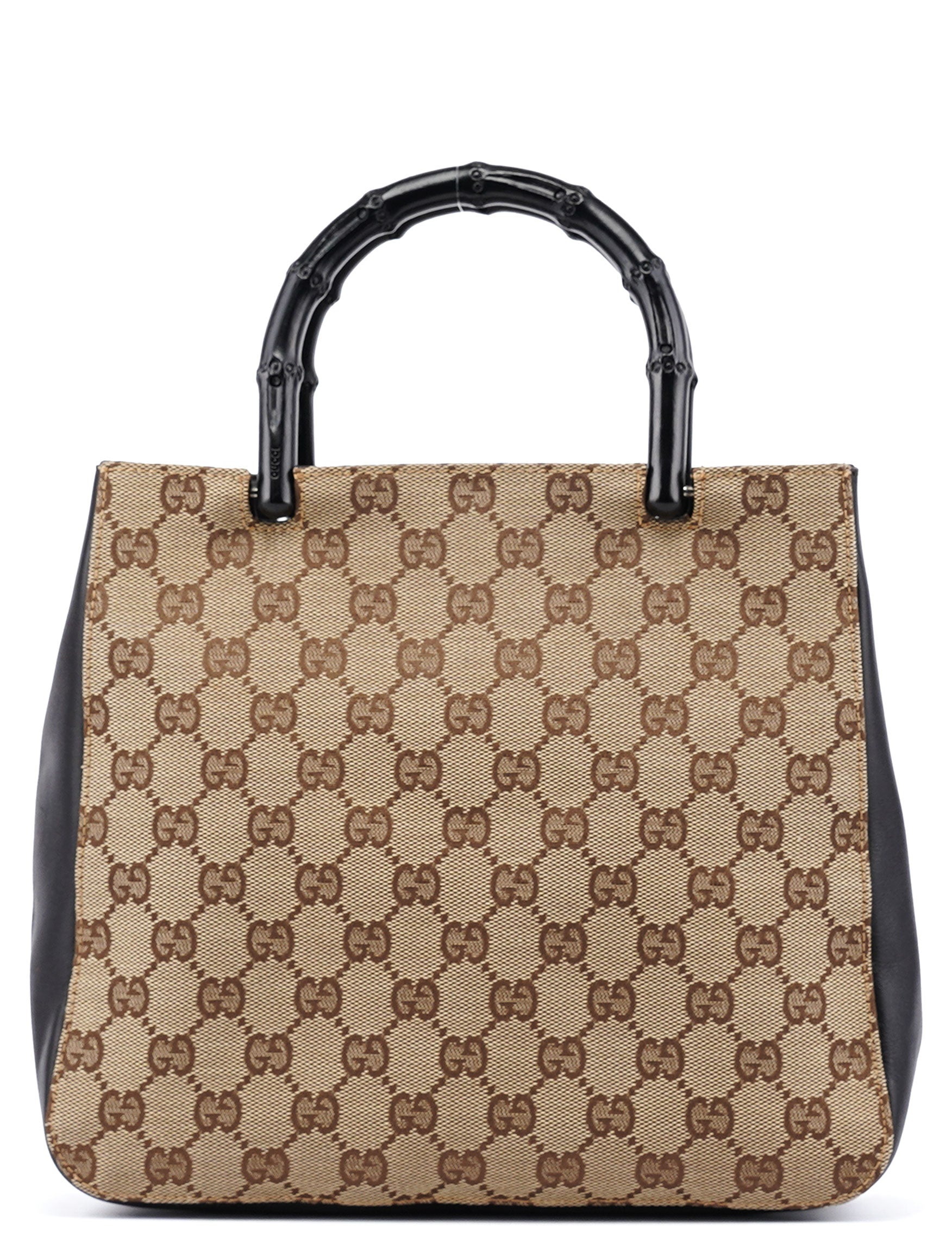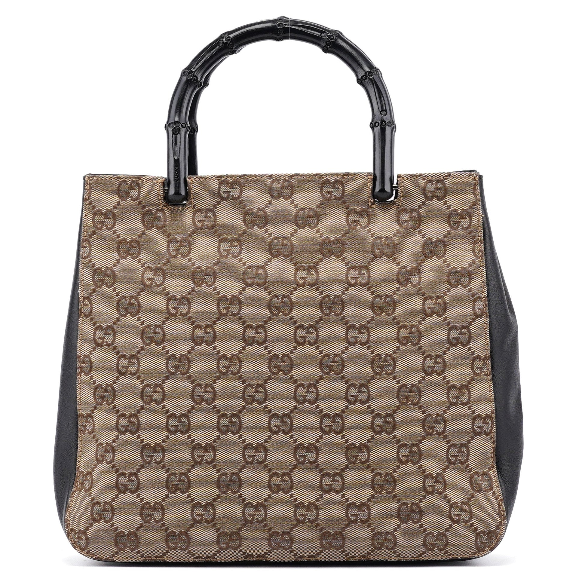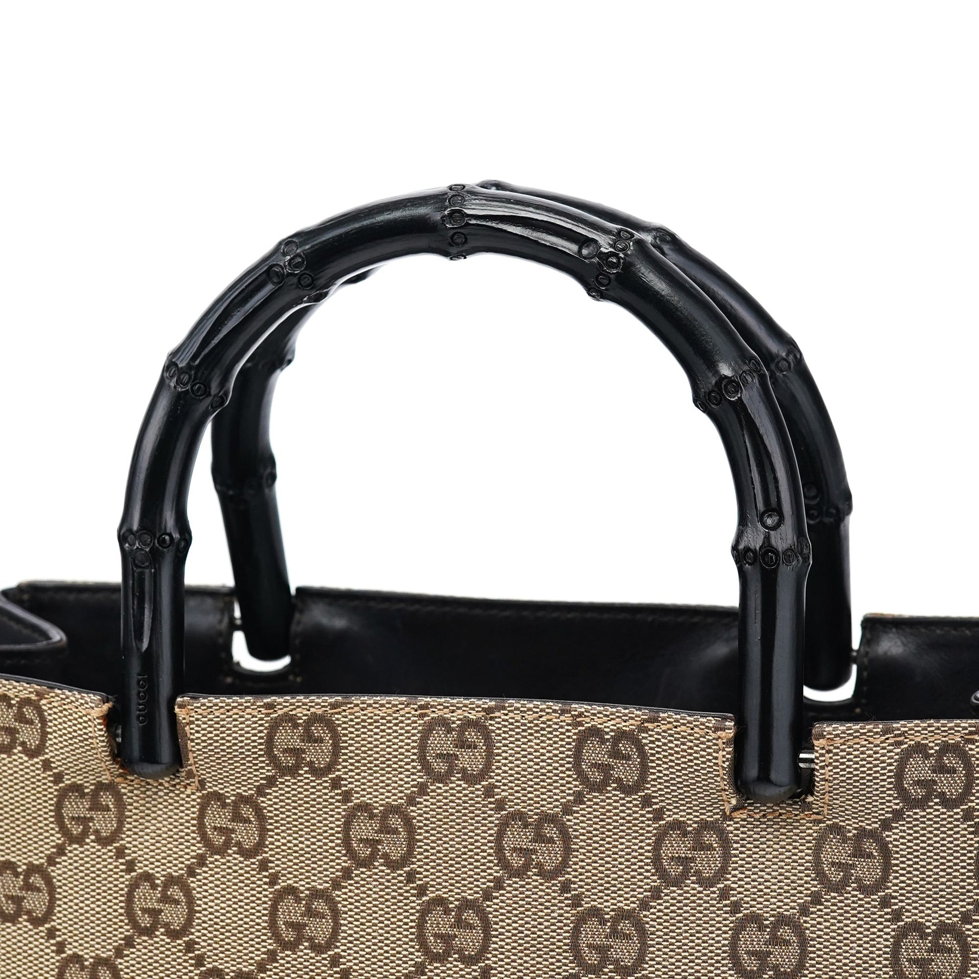 Designed by Tom Ford in the late 1990s, this Gucci Bamboo GG tote bag showcases two elegant gloss black bamboo handles engraved with the Gucci logo. Crafted from iconic beige GG monogram canvas and brown leather, it features two satin-lined interior compartments, including a zipper pocket for organized storage. A perfect blend of luxurious design and practical functionality.