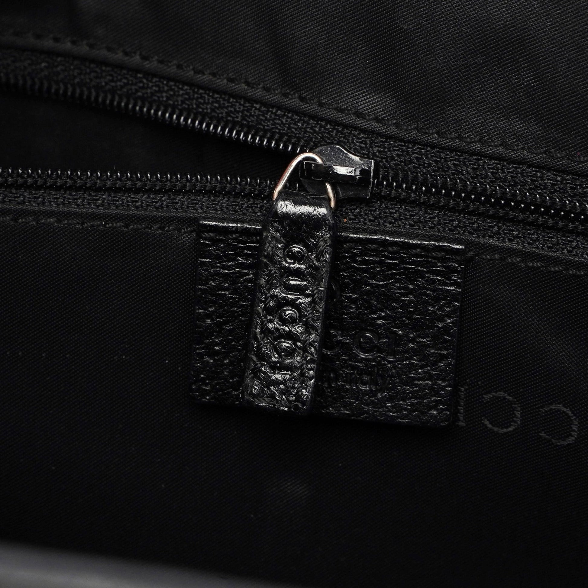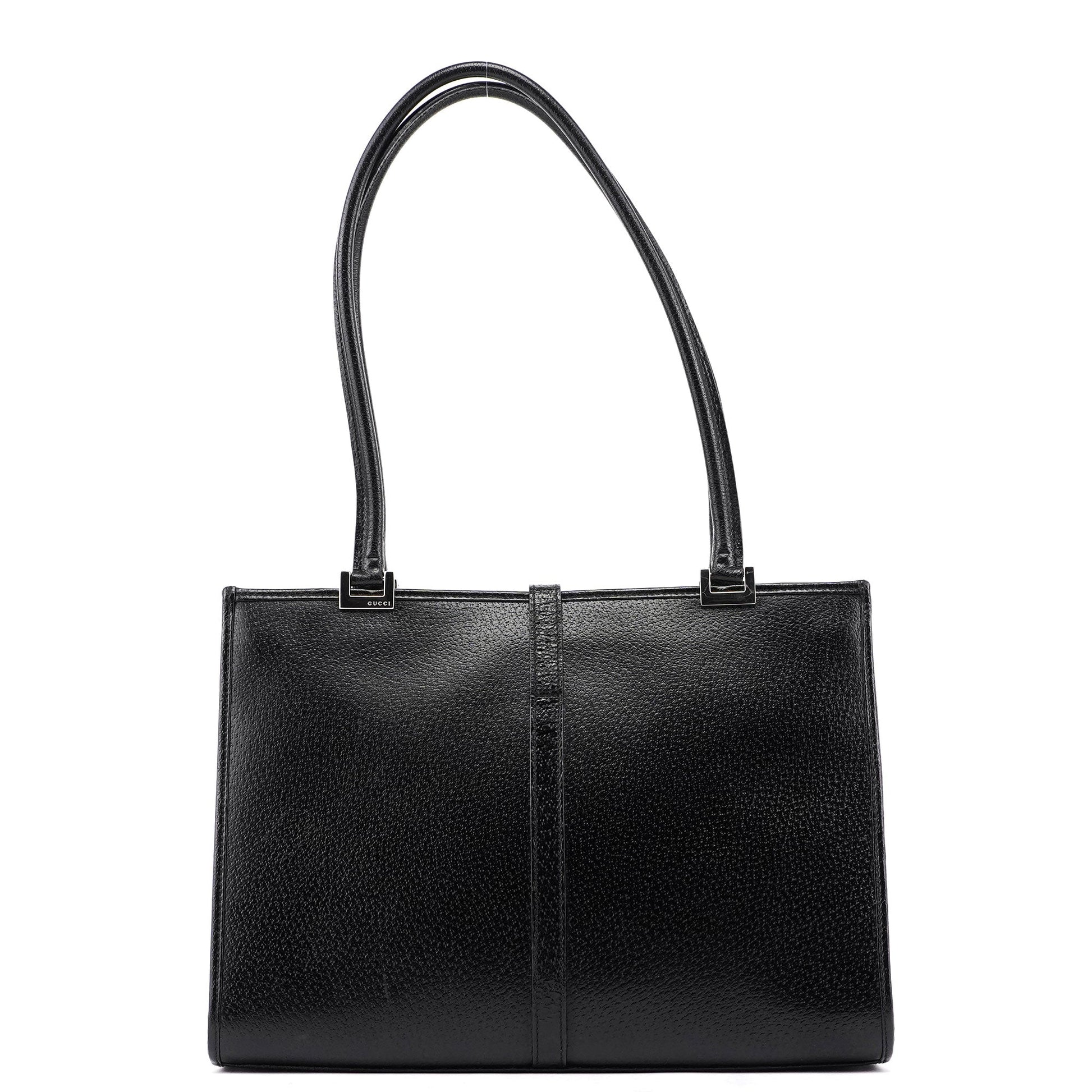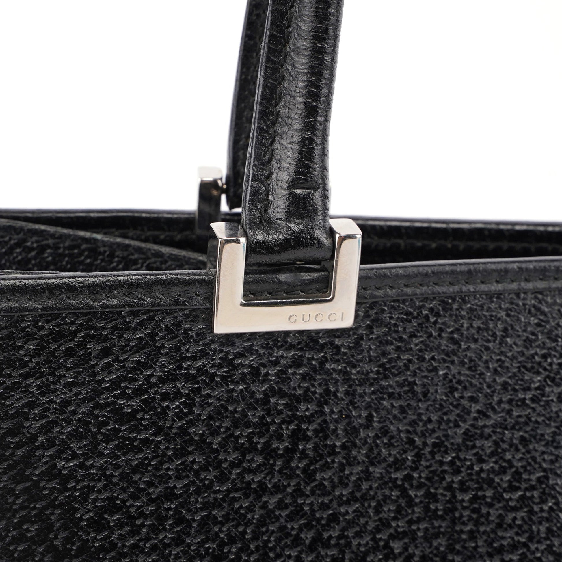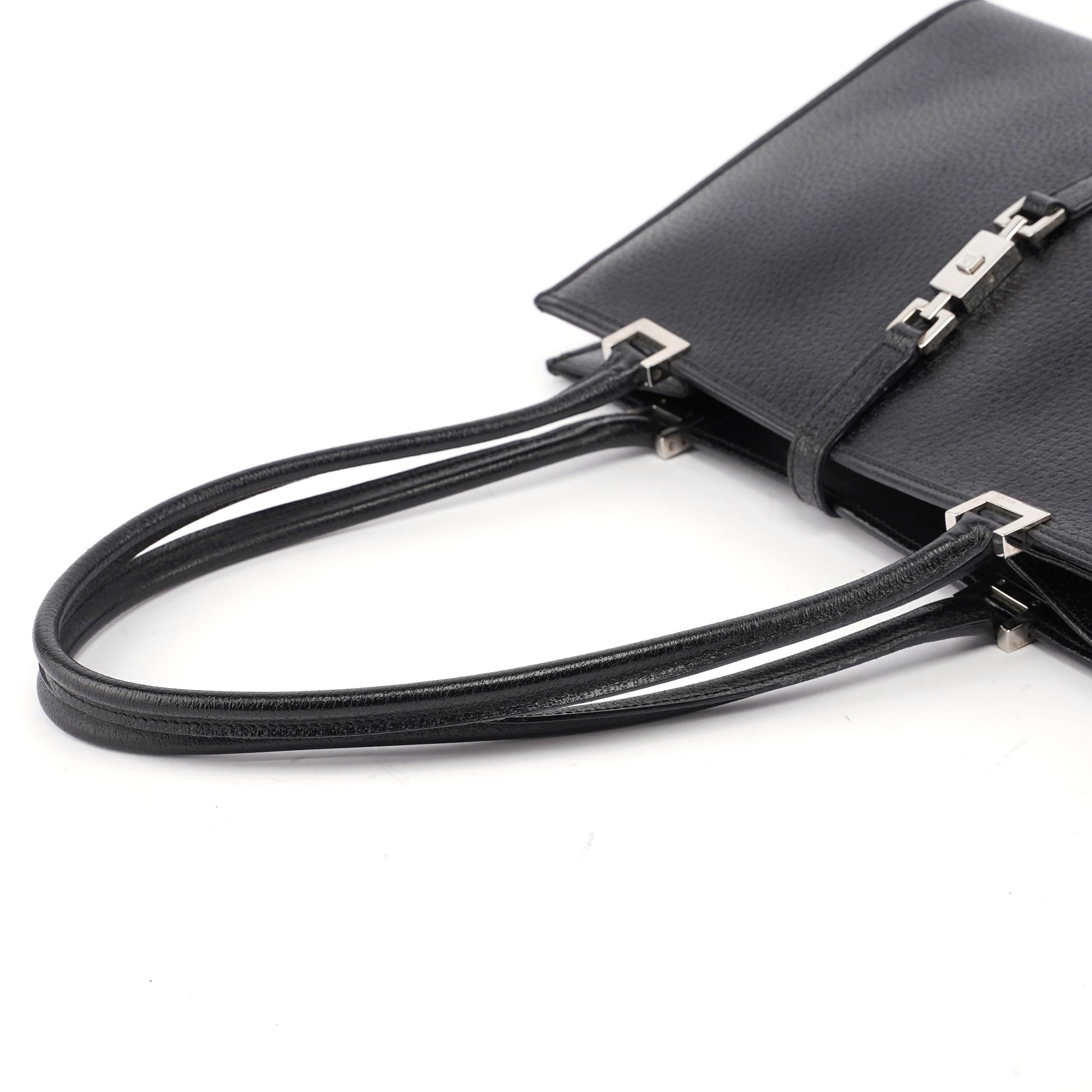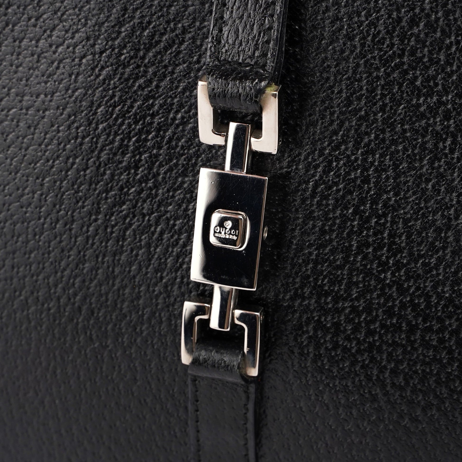Designed by Tom Ford in the late 1990s, the Gucci Jackie tote is handcrafted from black textured leather and features silver-tone hardware engraved with the Gucci logo. It has a signature Jackie closure, a satin-lined interior, and an interior zipper pocket, showcasing timeless elegance.
