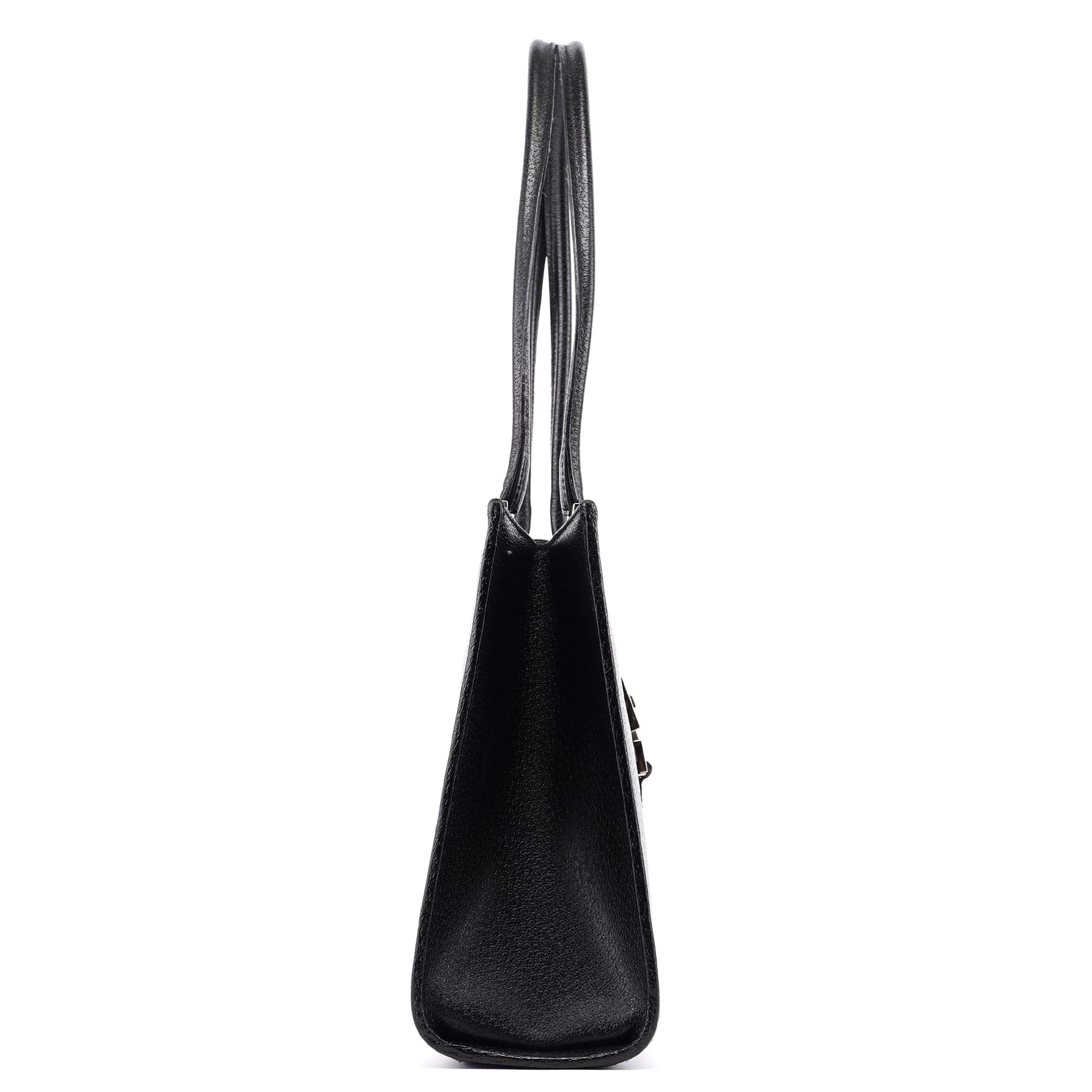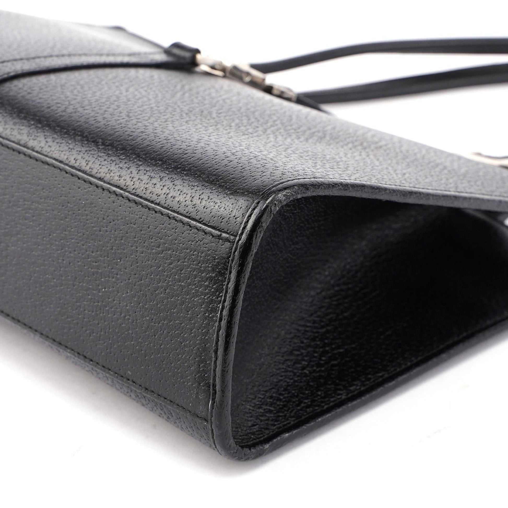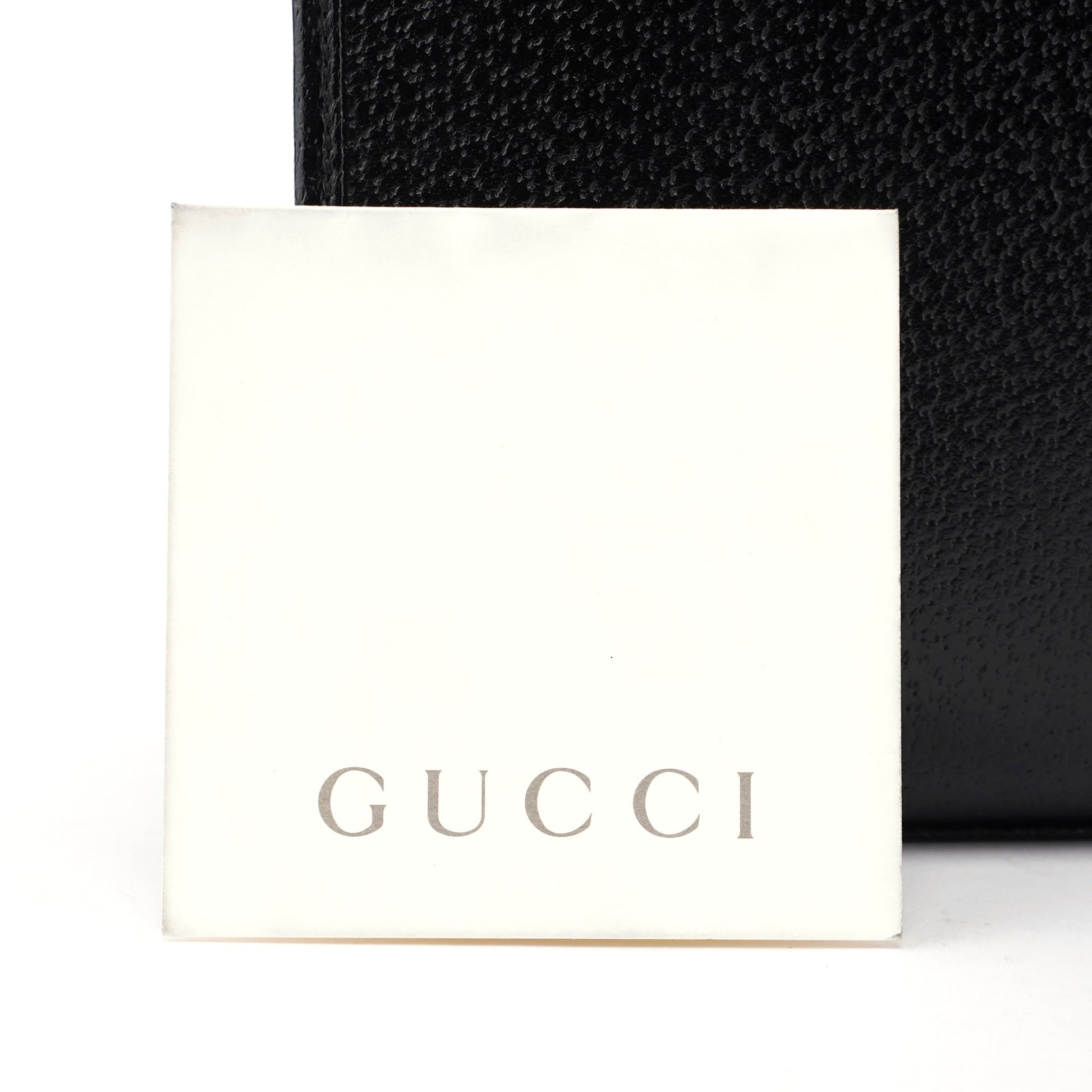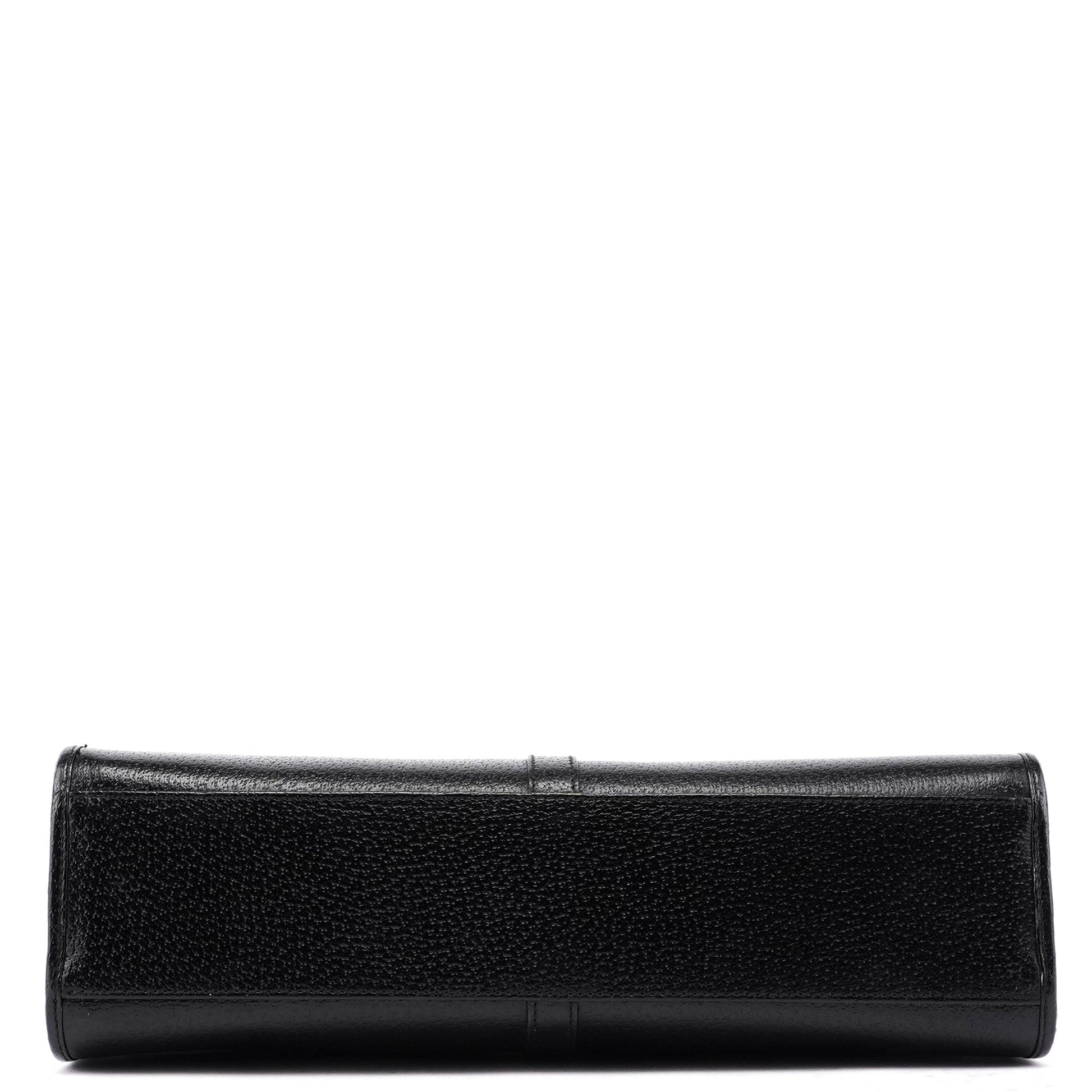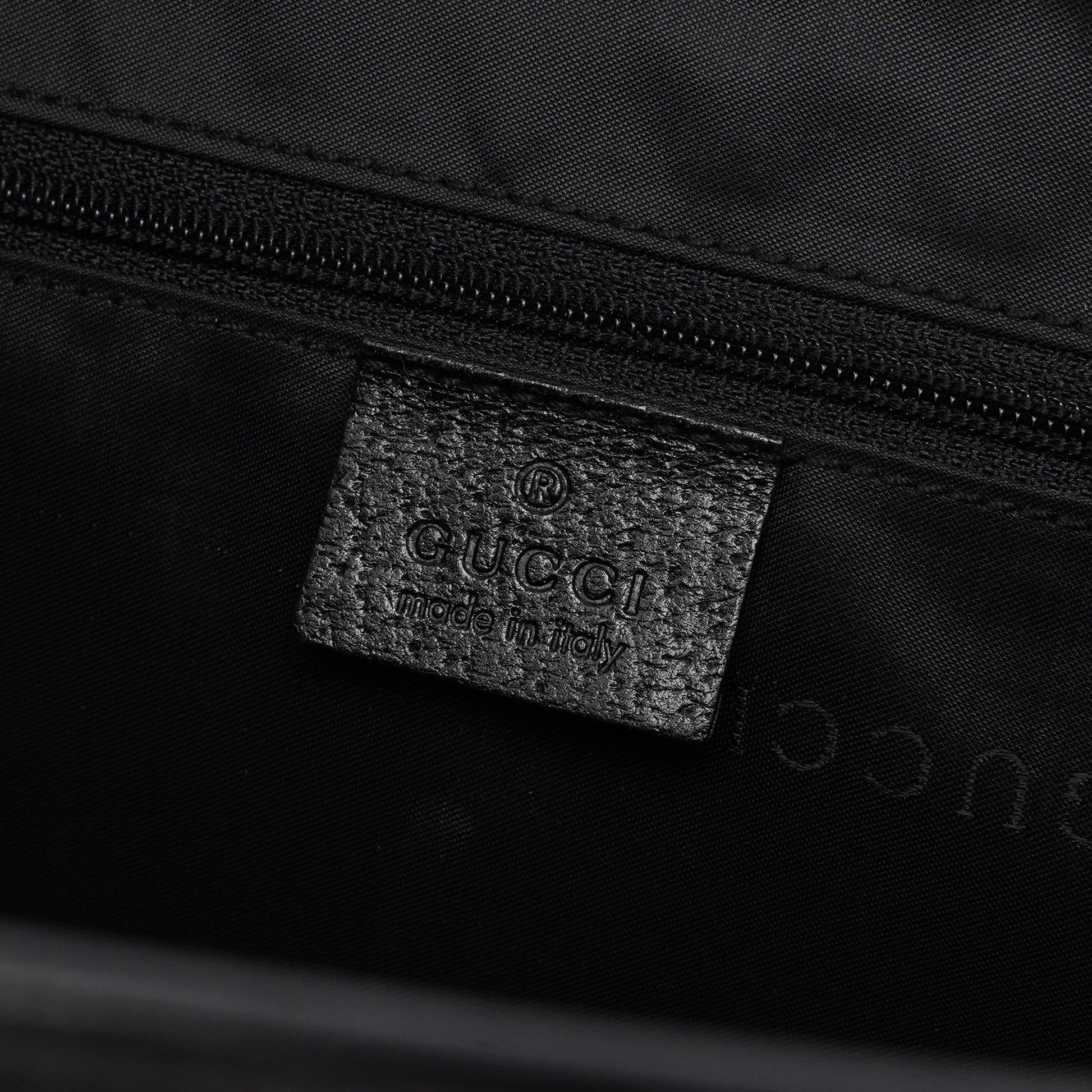 Designed by Tom Ford in the late 1990s, the Gucci Jackie tote is handcrafted from black textured leather and features silver-tone hardware engraved with the Gucci logo. It has a signature Jackie closure, a satin-lined interior, and an interior zipper pocket, showcasing timeless elegance.