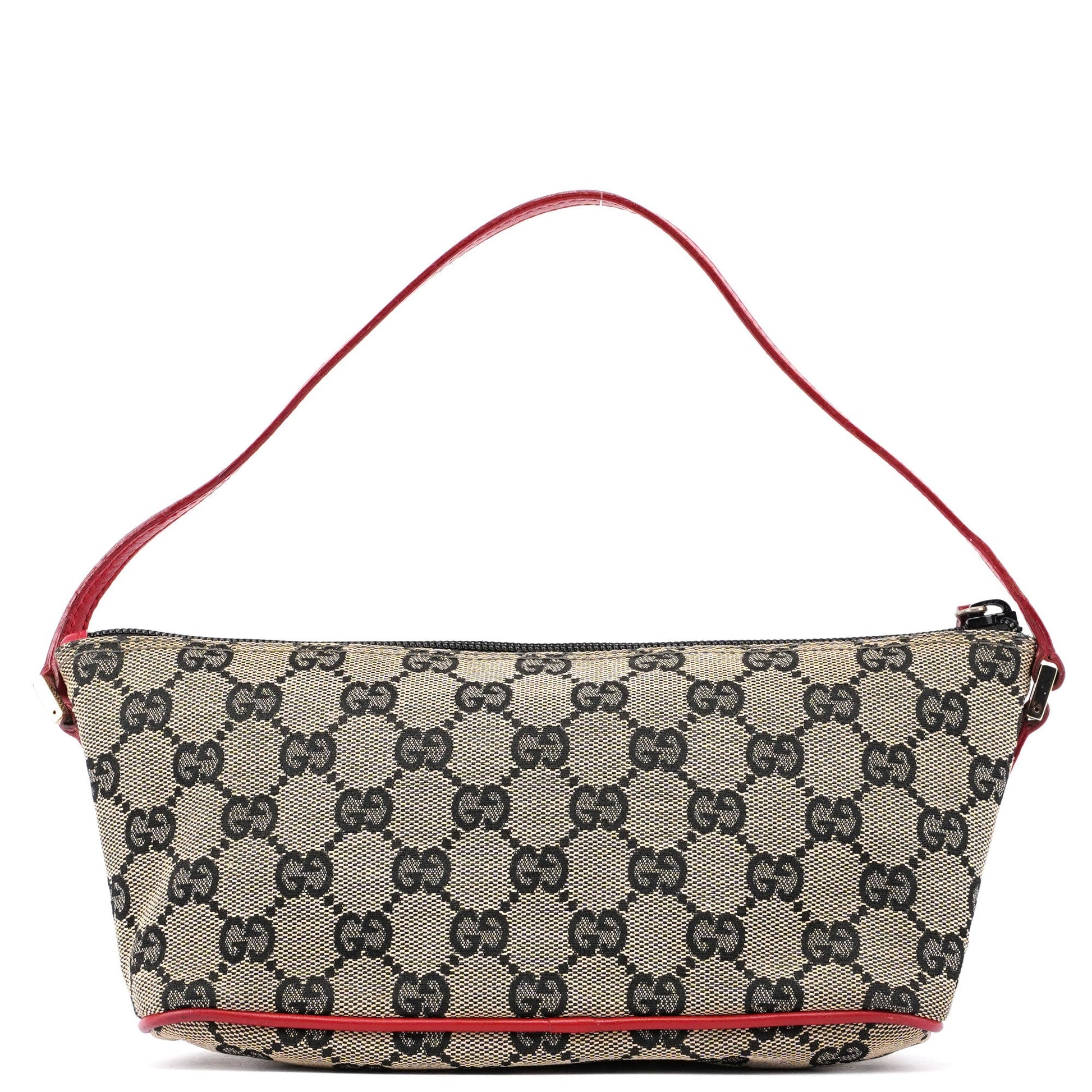 Explore timeless elegance with the Gucci GG Boat pochette by Tom Ford, circa late 1990s. This exquisite piece combines beige GG canvas with red leather trim and gold-tone hardware. Its secure zip closure and satin-lined interior offer luxury and practicality, while the subtle Gucci plaque adds a touch of heritage.