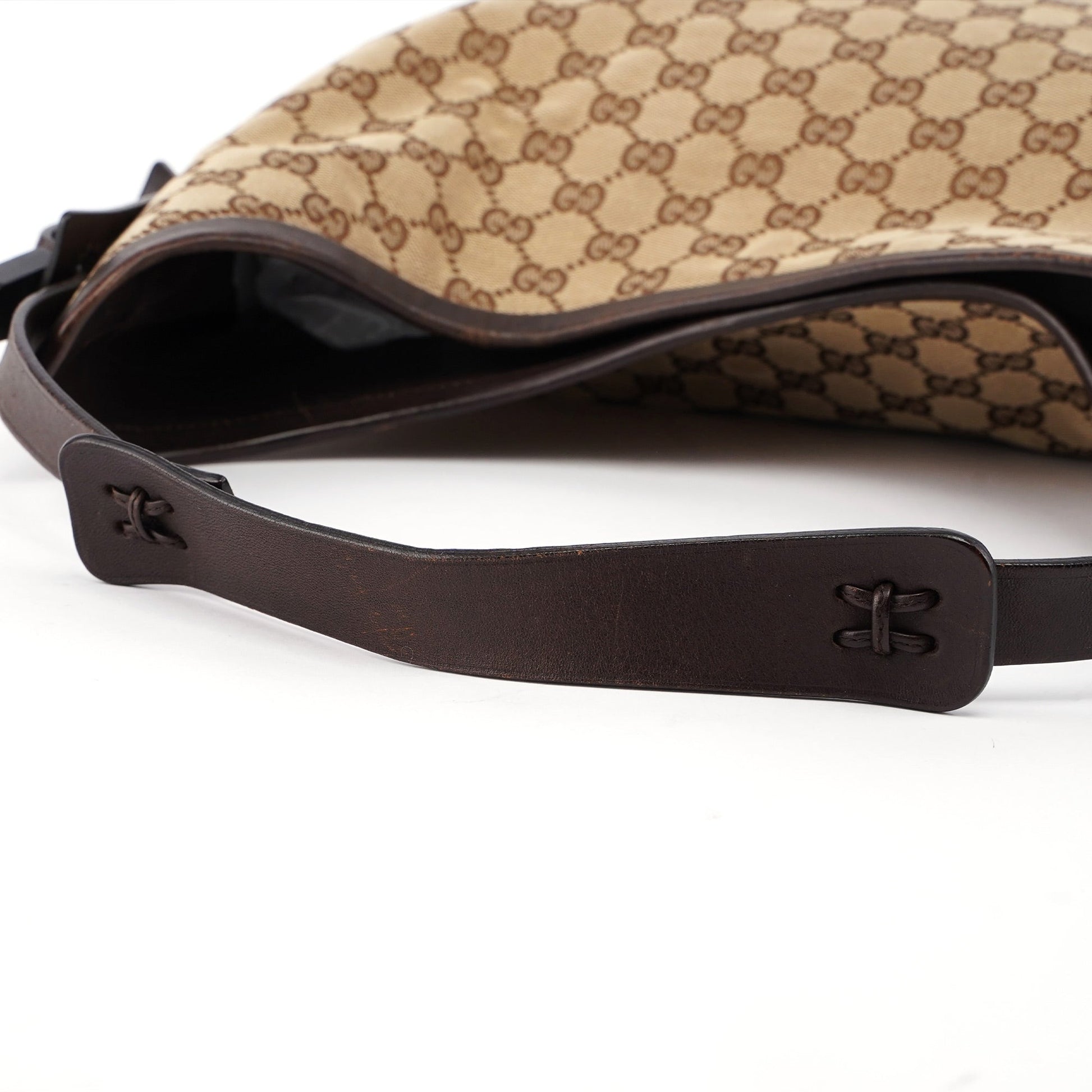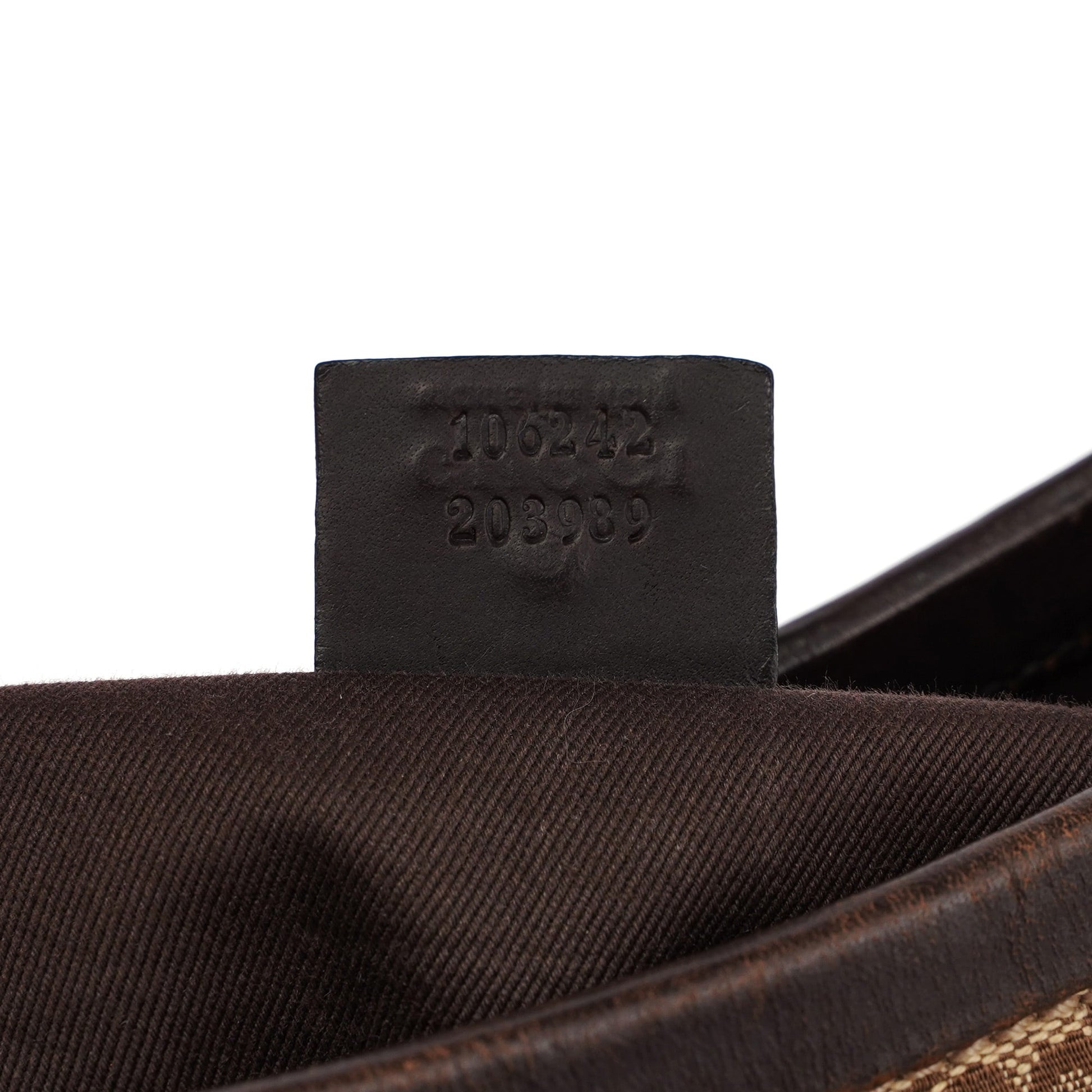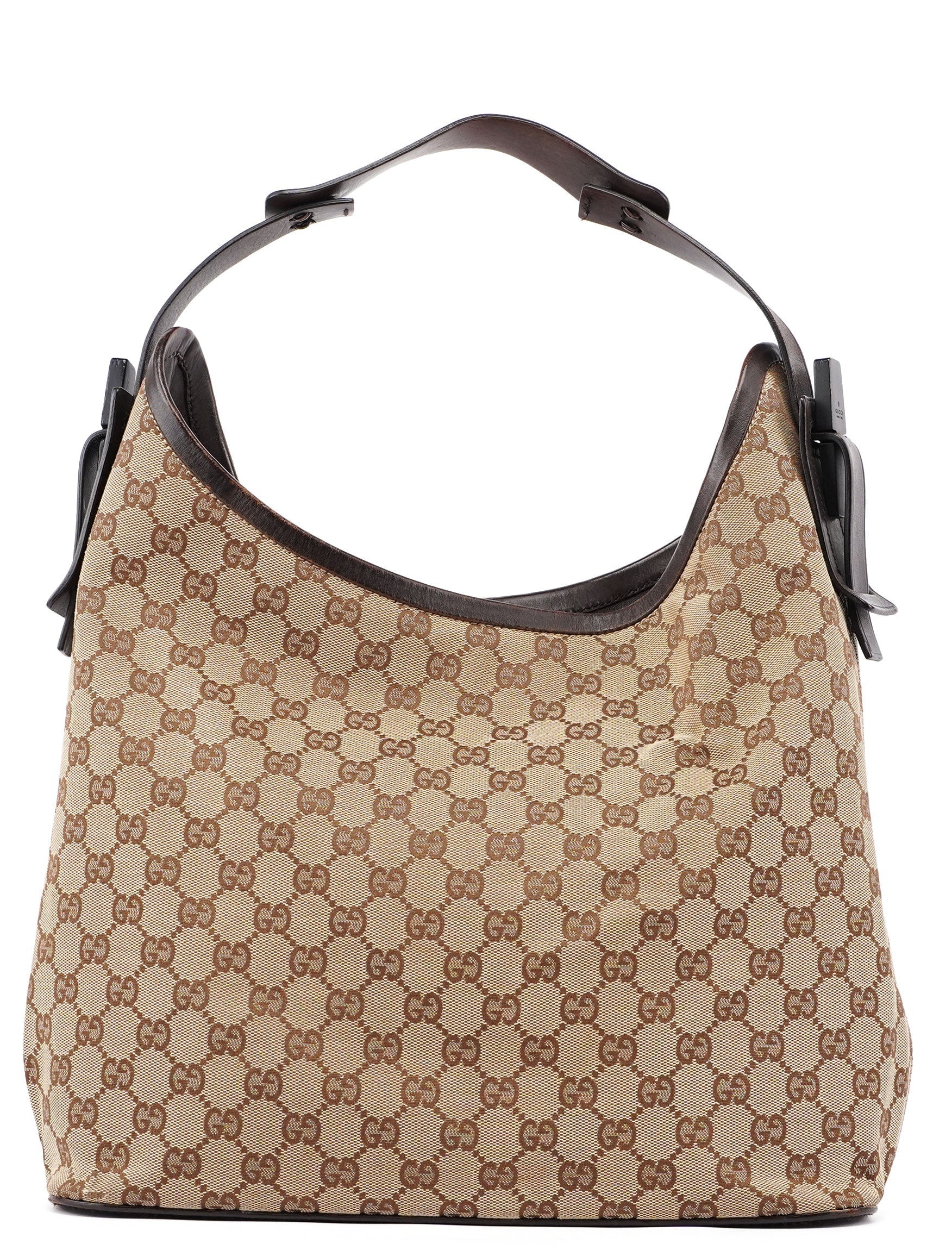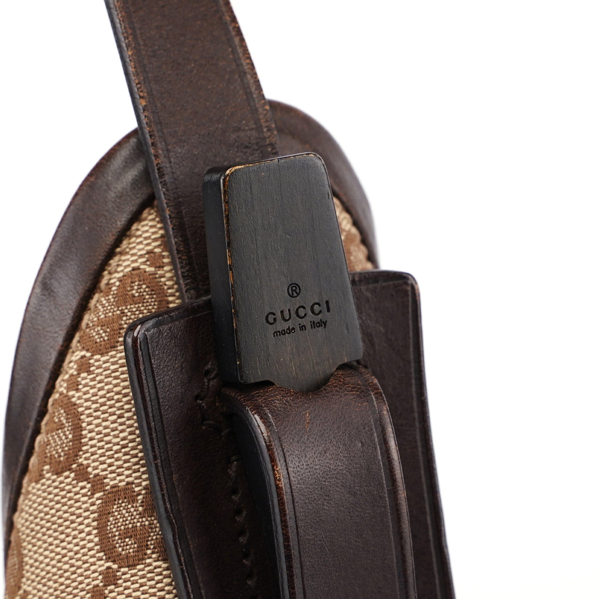 Designed by Tom Ford in the mid 1990s, this Gucci GG hobo shoulder bag is handcrafted in brown GG monogram canvas with tonal leather trim. It features a wooden detail with Gucci logo engraved. The cotton-lined interior features a convenient zipper pocket and magnetic closure.
