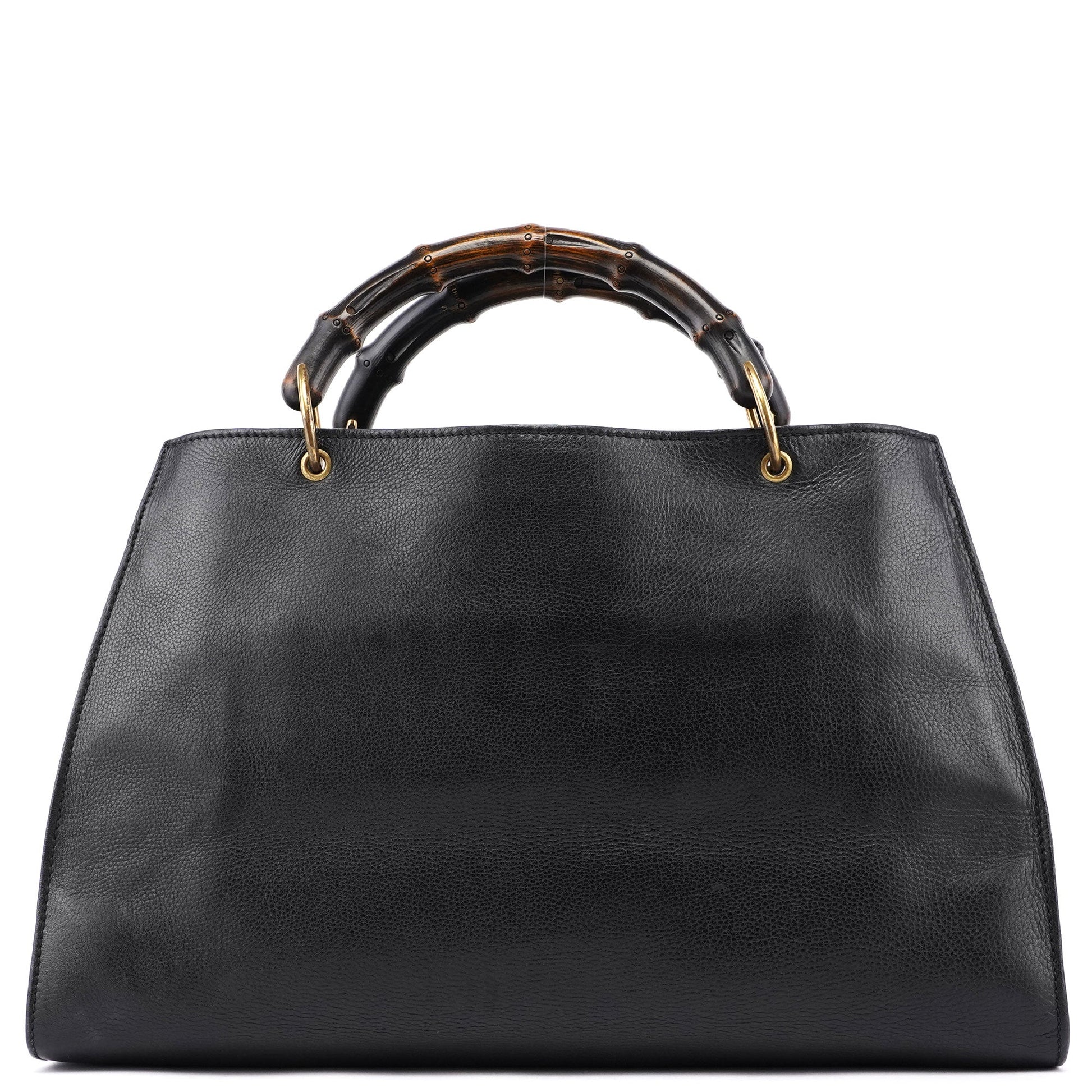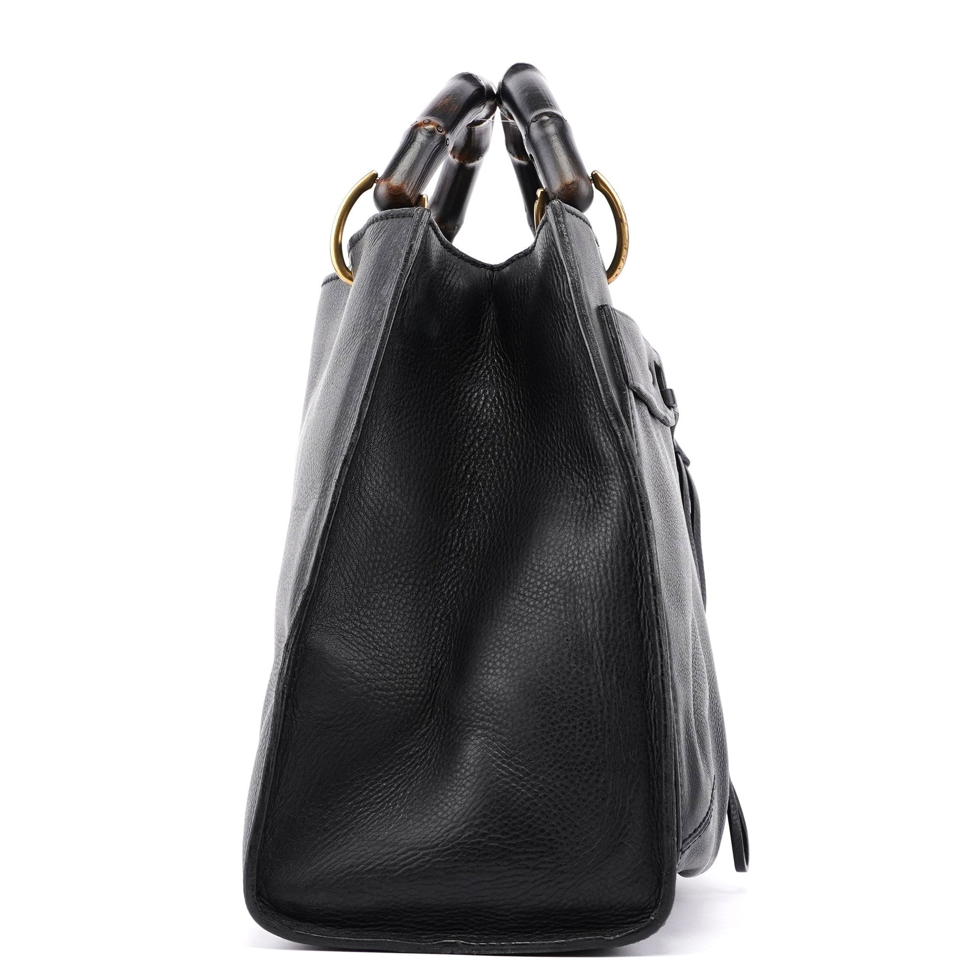Designed by Tom Ford in 2002, the Gucci Bamboo bag boasts black leather and iconic bamboo handles. Gold-tone hardware complements the front pocket. Inside, cotton lining envelops three compartments, one secured by a zipper, alongside an interior zipper pocket.