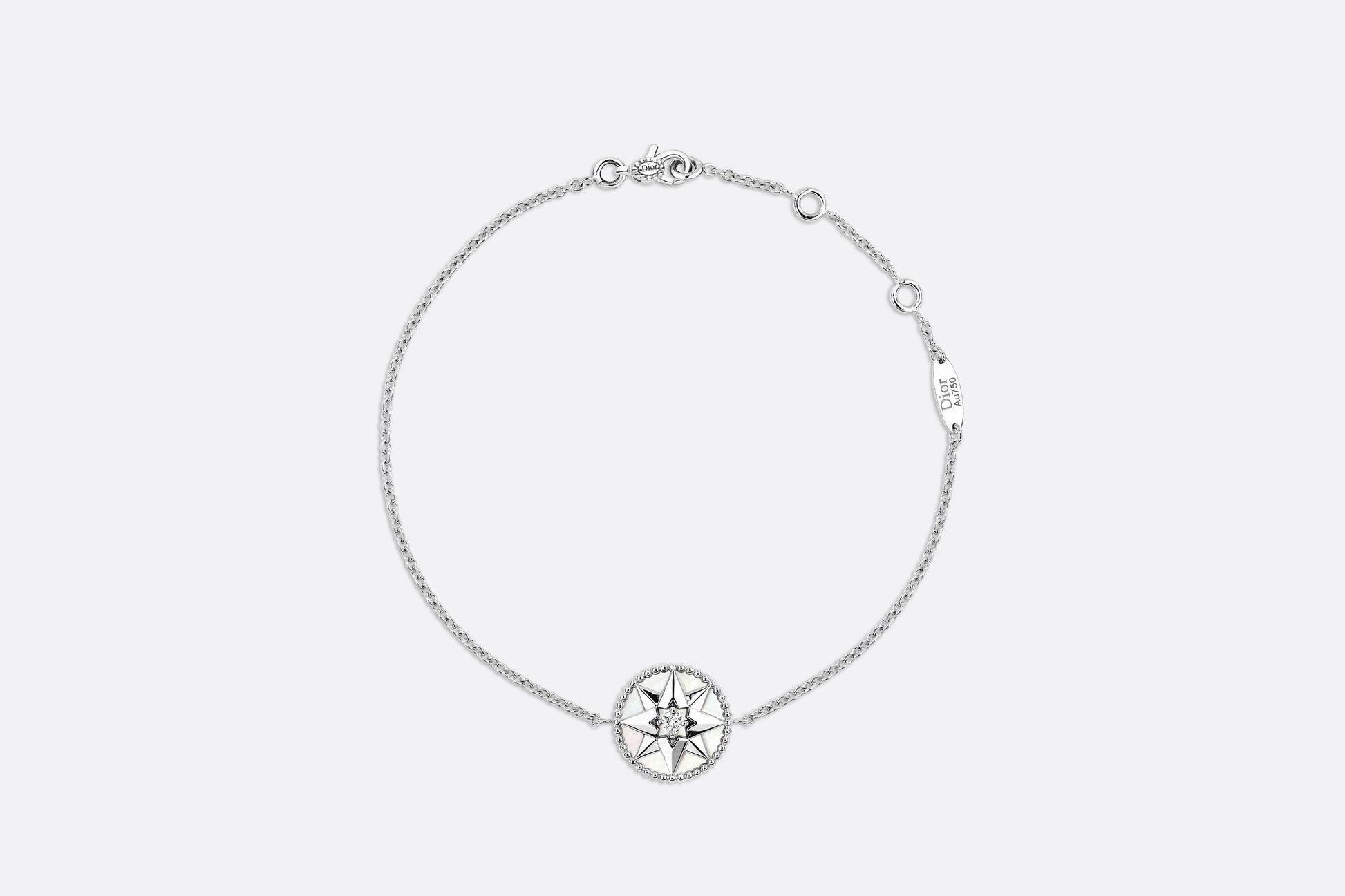 18K white gold Diamond (0.045 ct*) Mother-of-pearl 17.5 cm in length with small rings to adjust the chain to either 15.5 cm or 16.5 cm Motif diameter: 12 mm