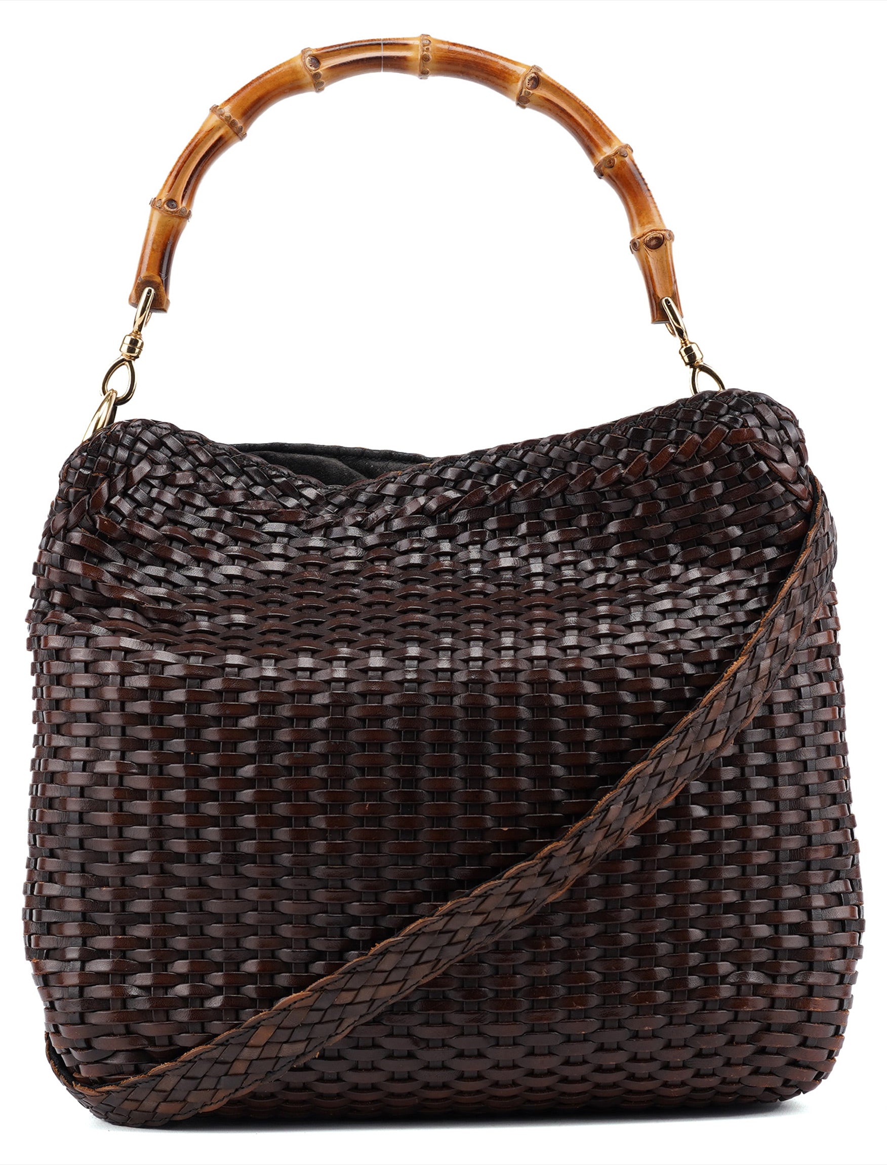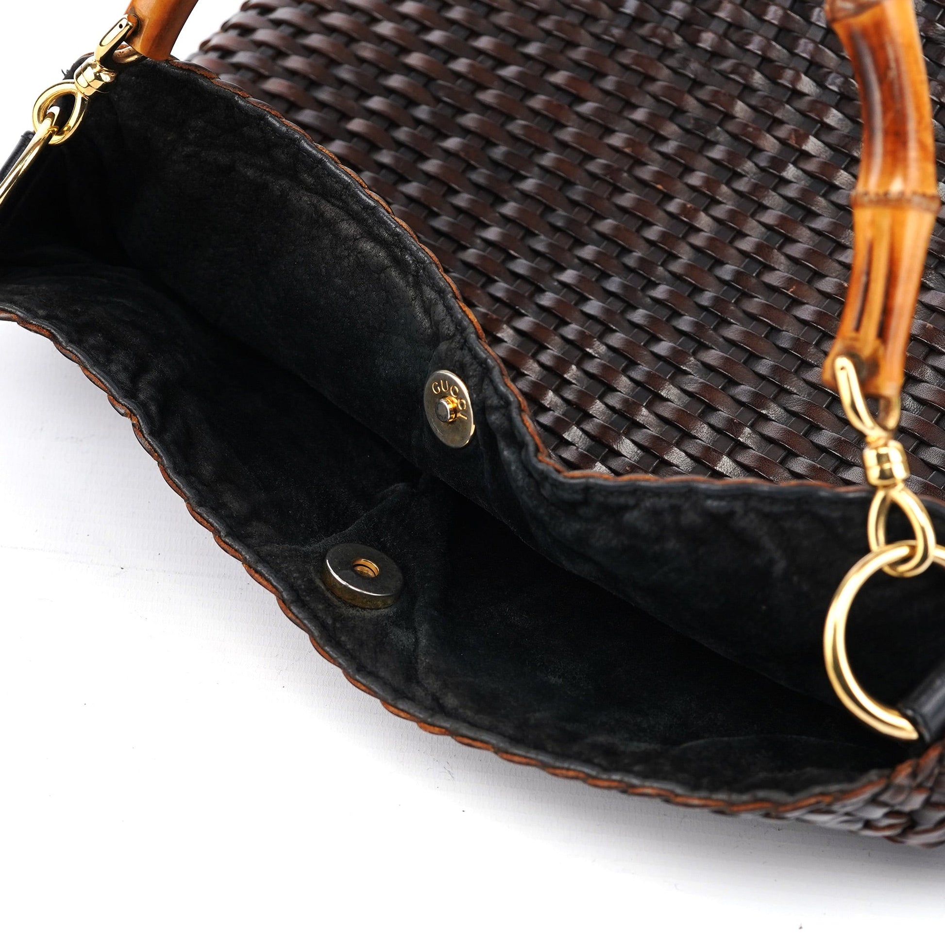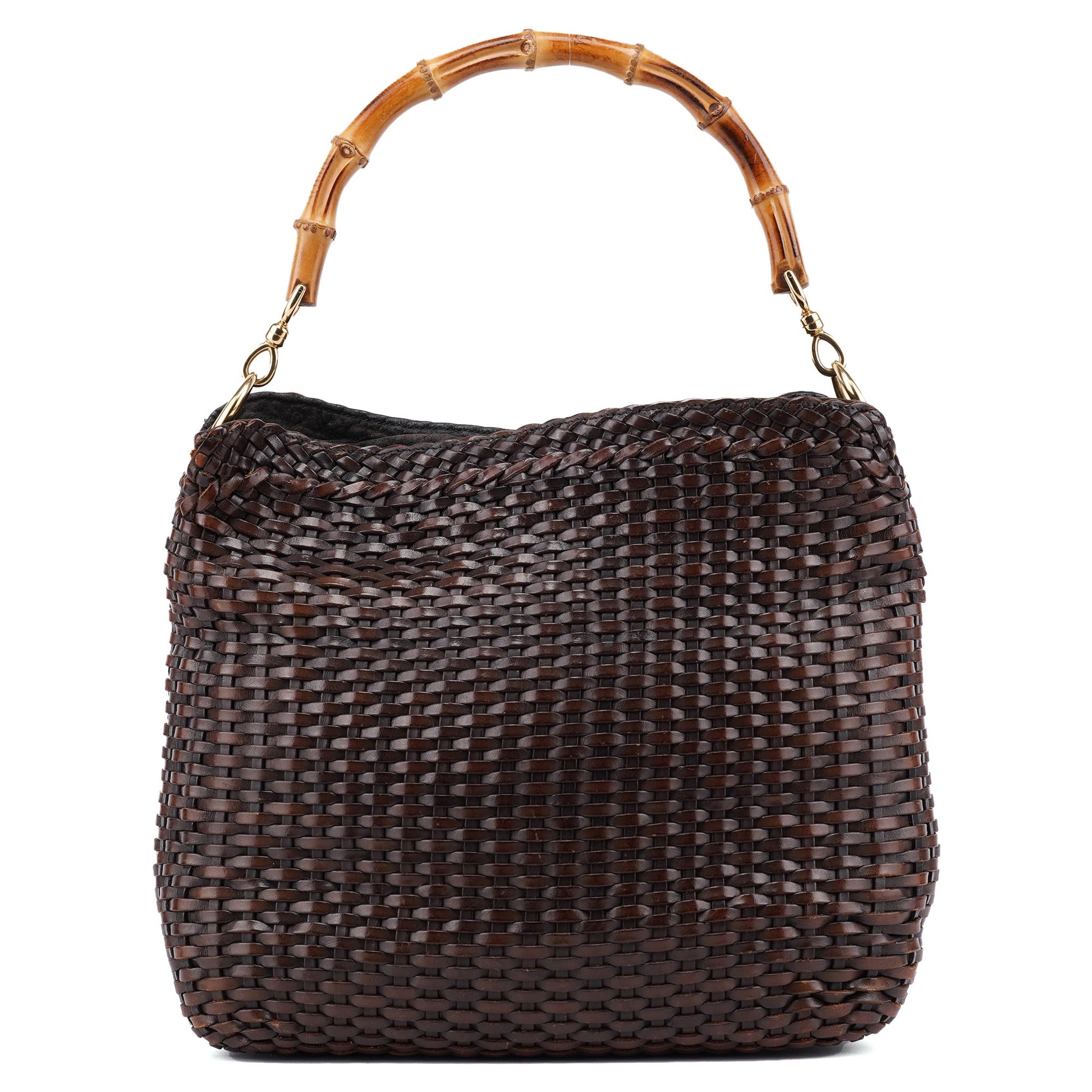 Designed by Tom Ford for Gucci's 1996 collection, this Bamboo bag is a testament to artisanal craftsmanship, handwoven in rich brown leather. It features a bamboo handle and luxurious gold-tone hardware, complemented by a magnetic closure for secure storage. The interior, elegantly lined with suede, includes an interior zipper pocket, blending functionality with Gucci's iconic elegance.