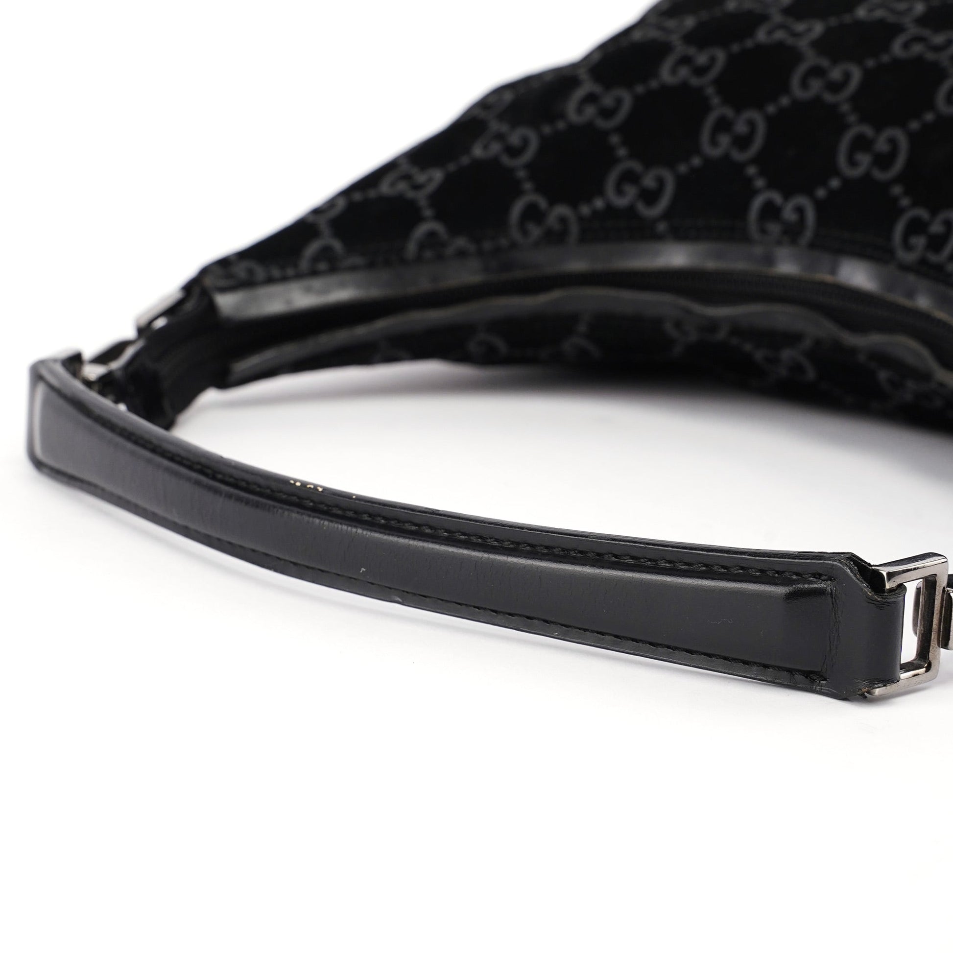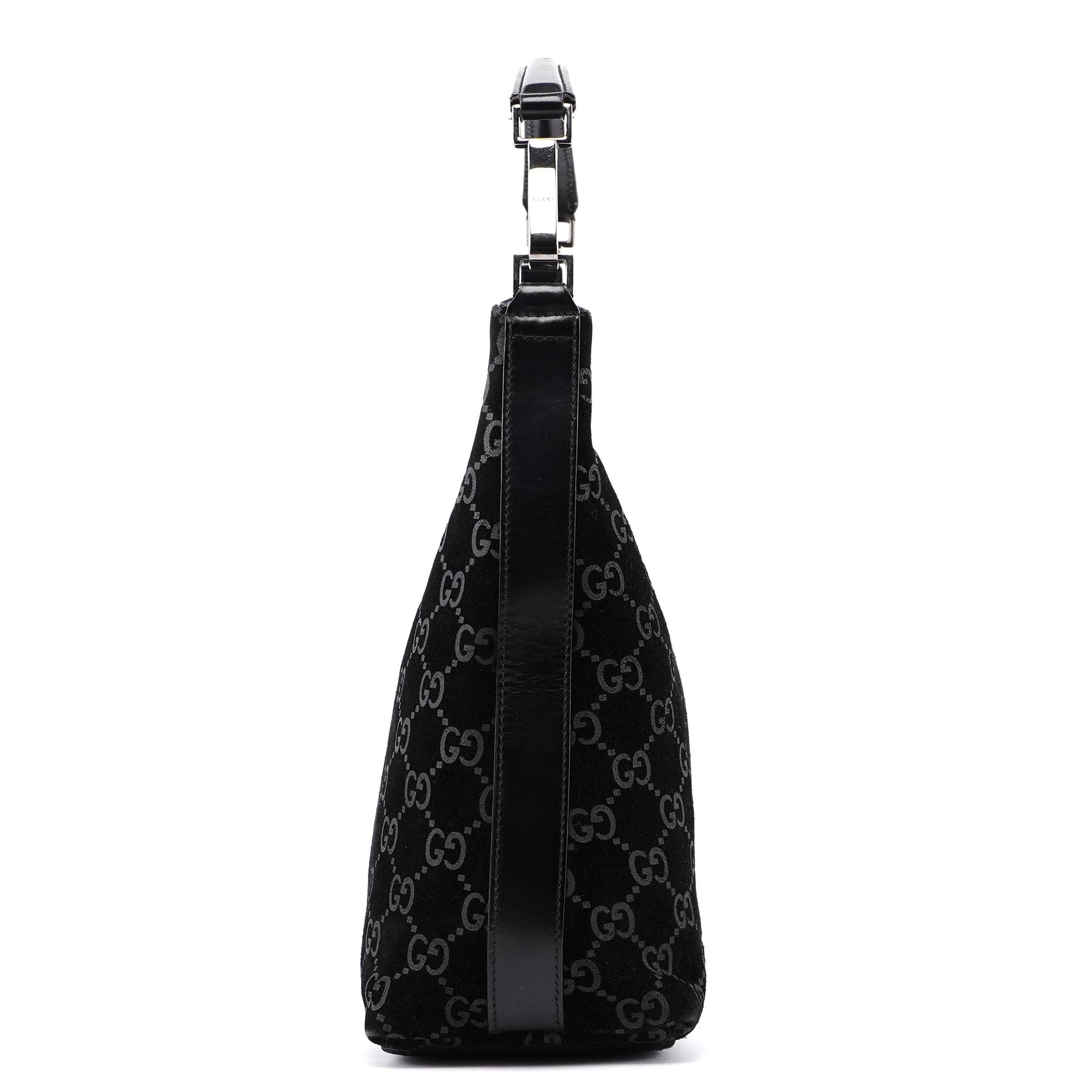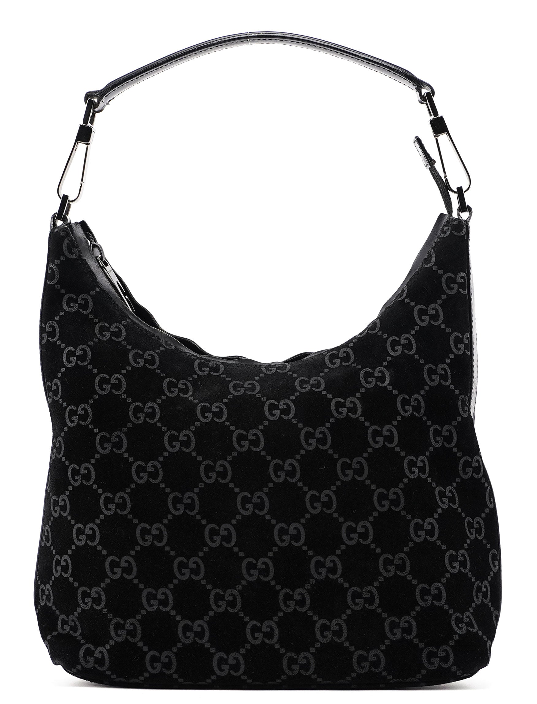 Unveil the elegance of the Gucci GG suede shoulder bag, designed by Tom Ford in 1997. This luxurious piece features silver-tone hardware with engraved Gucci logo, complemented by black calfskin leather trim. A zipper closure secures the satin-lined interior.