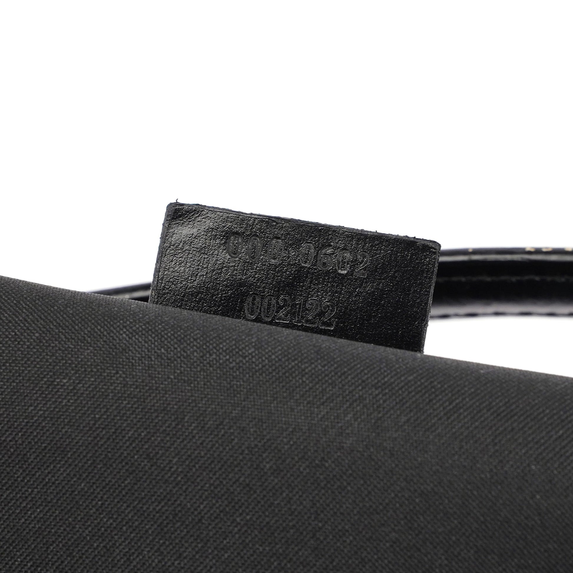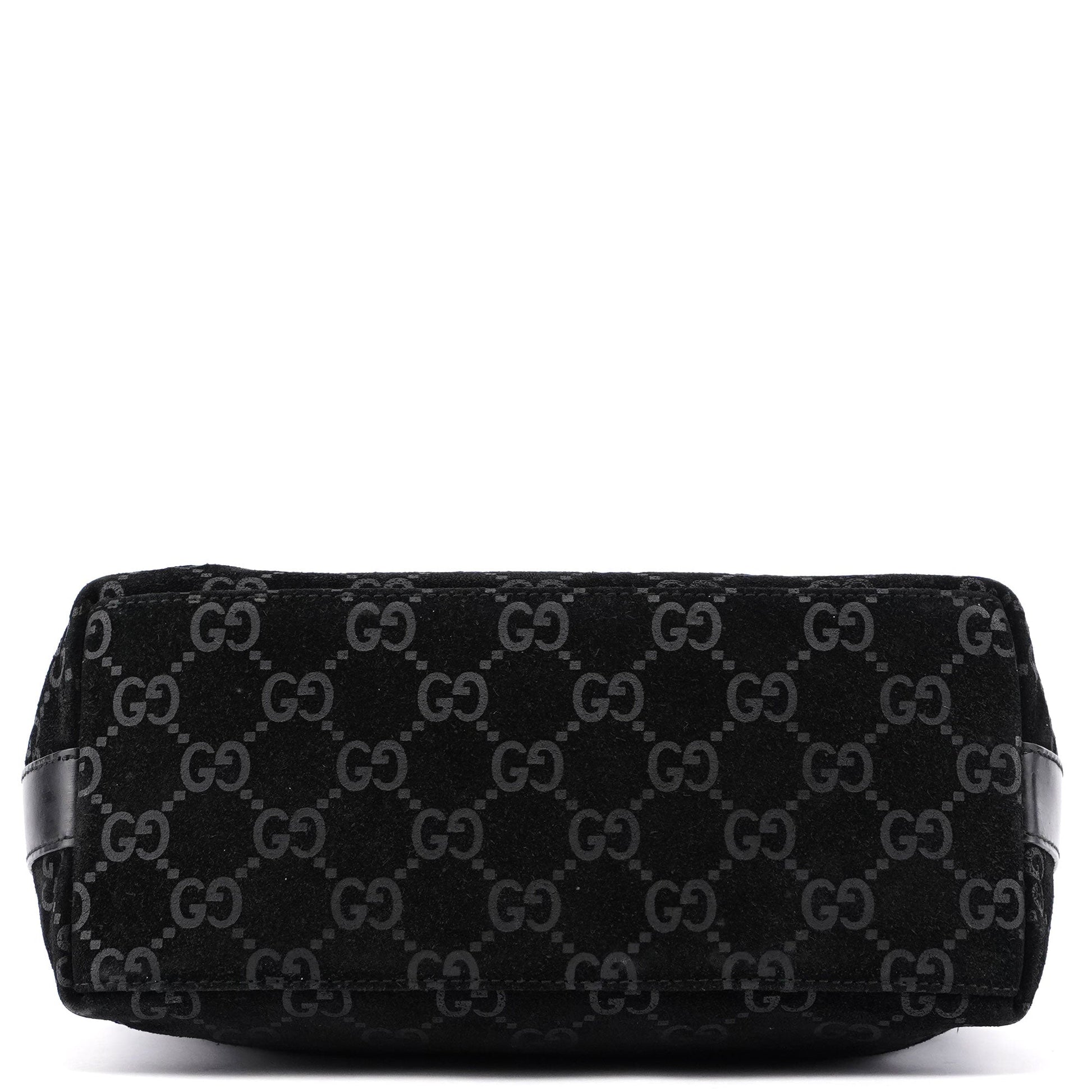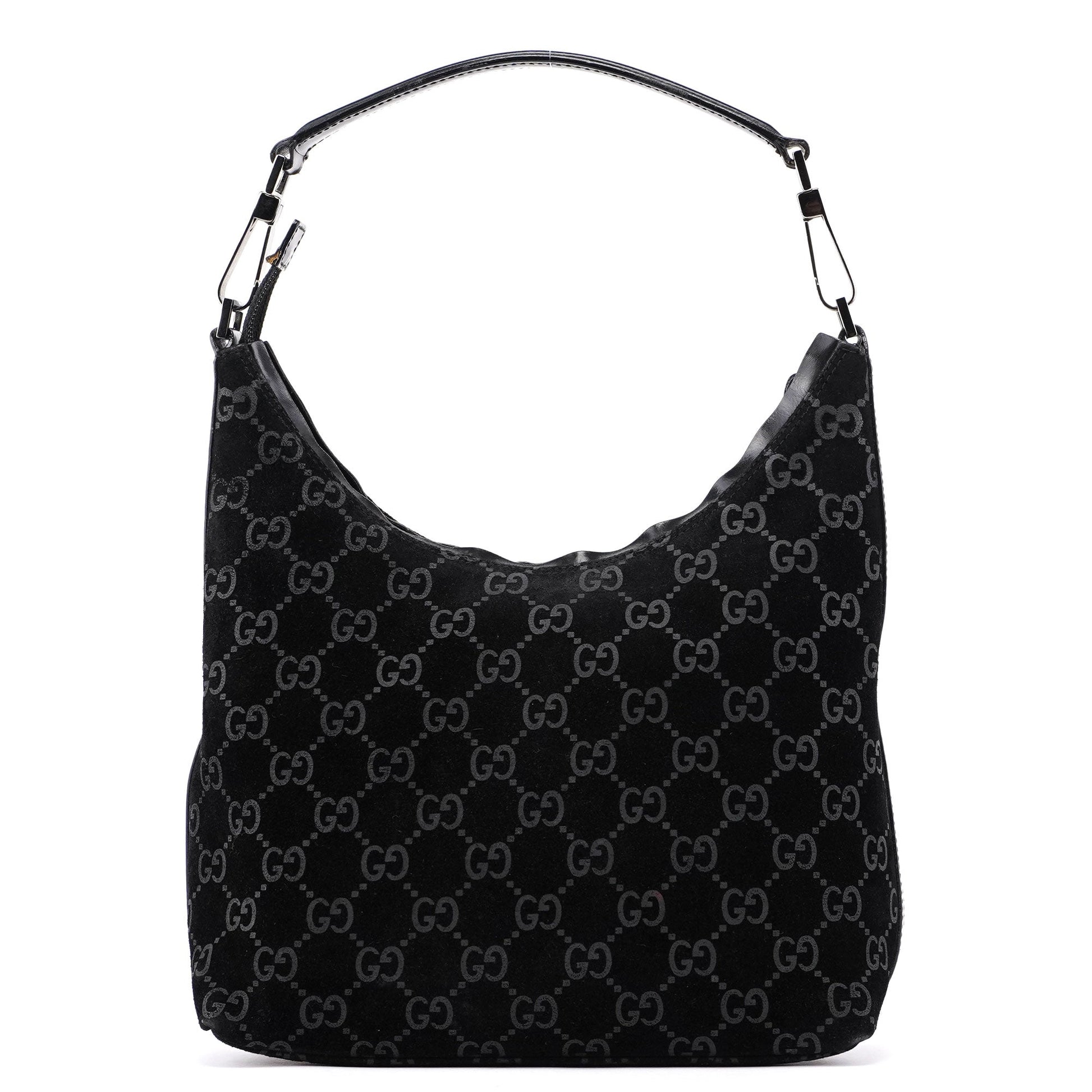 Unveil the elegance of the Gucci GG suede shoulder bag, designed by Tom Ford in 1997. This luxurious piece features silver-tone hardware with engraved Gucci logo, complemented by black calfskin leather trim. A zipper closure secures the satin-lined interior.