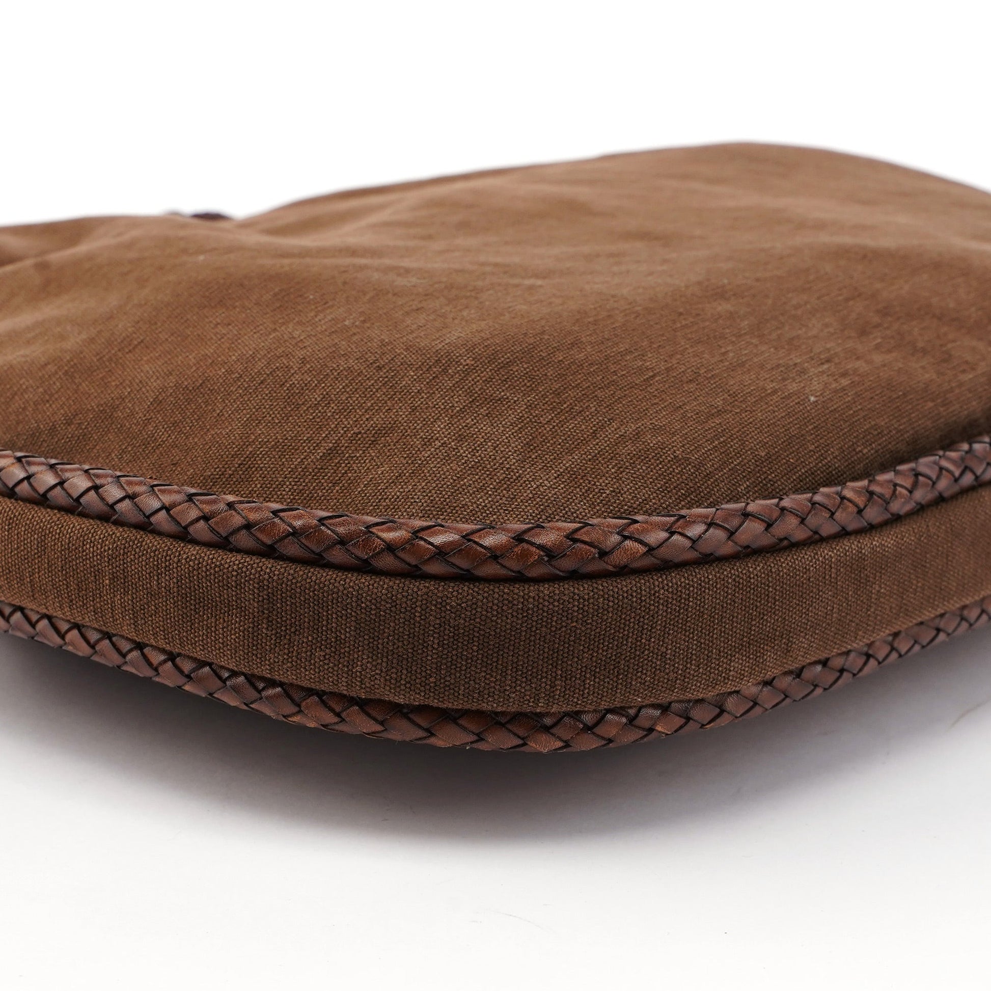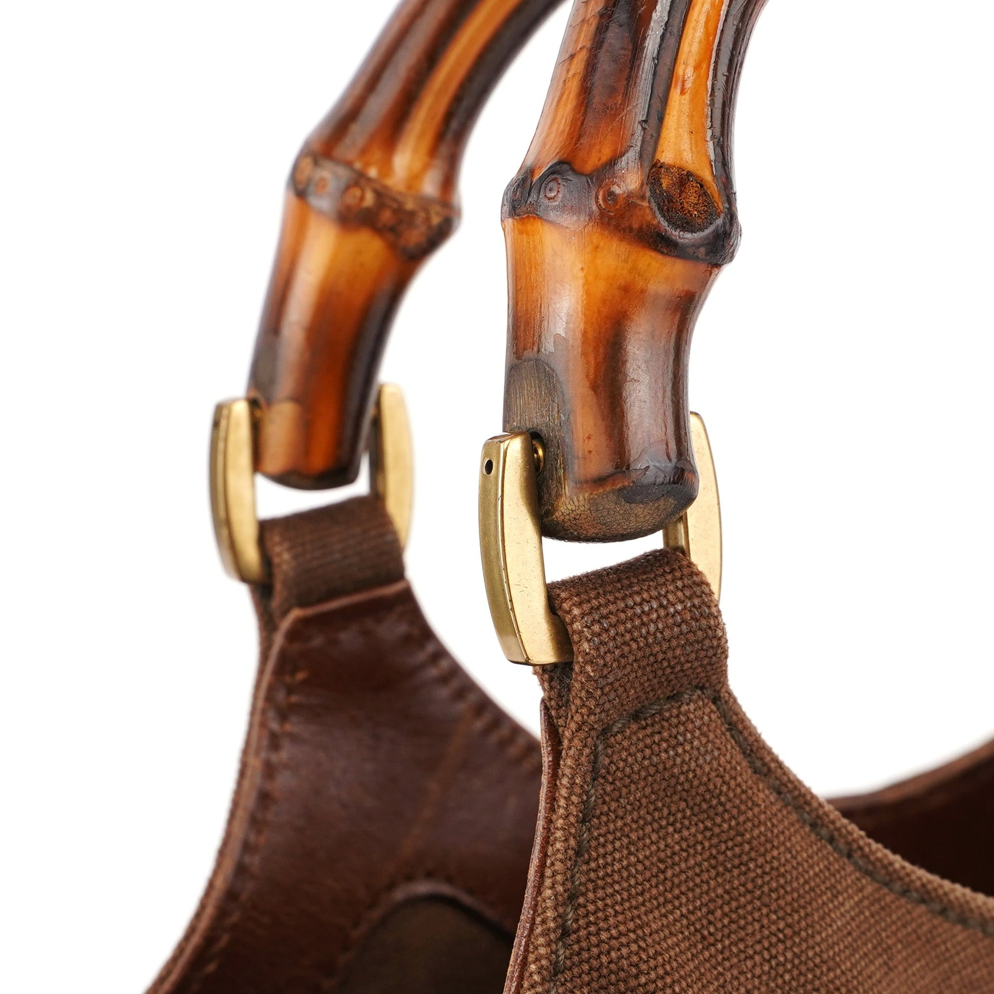 Designed by Tom Ford for the iconic 2003 collection, this Gucci Bamboo bag is handcrafted from beige canvas and woven brown leather trim, featuring gold-tone hardware and two bamboo handles. The interior, also lined in canvas, includes a zipper pocket, merging classic elegance with functional design. A leather Gucci logo bangle graces the front.