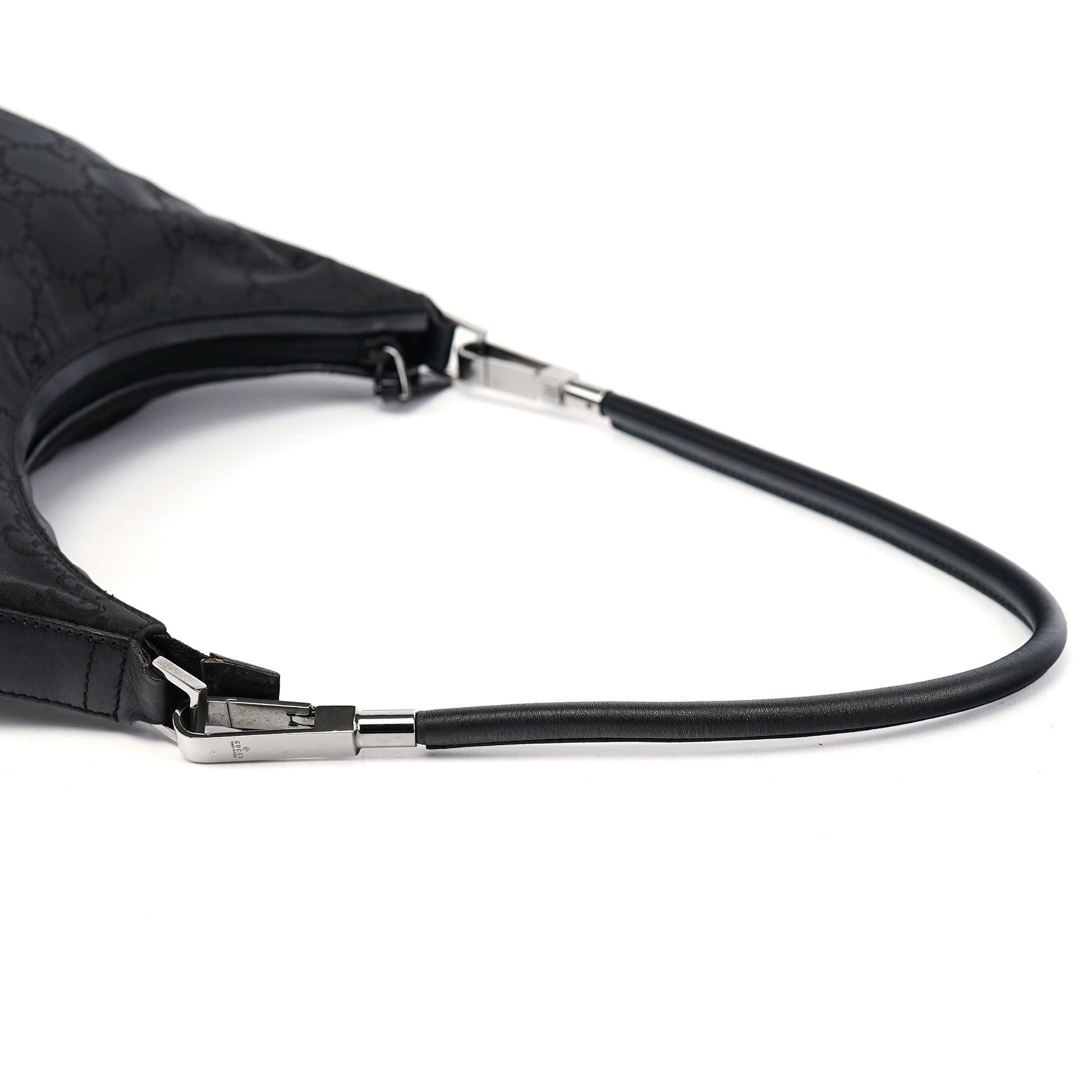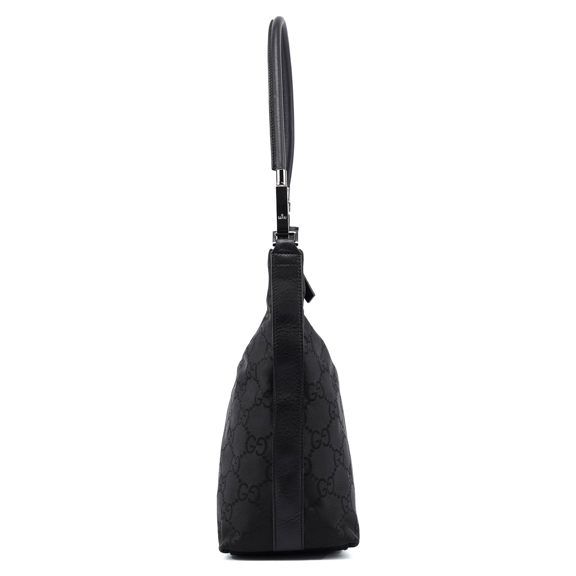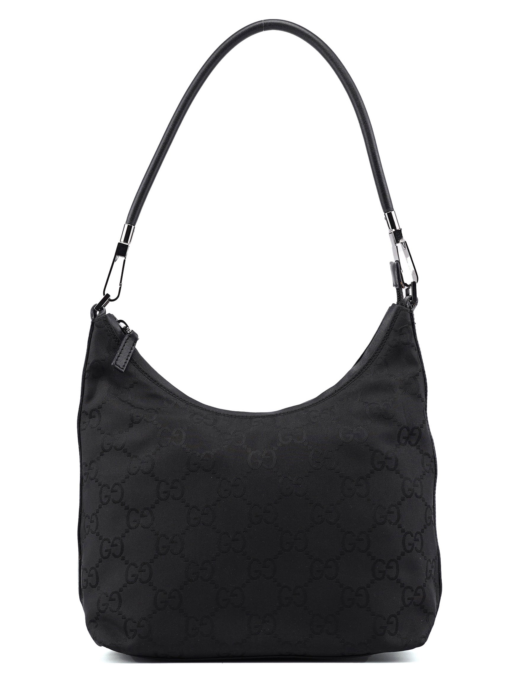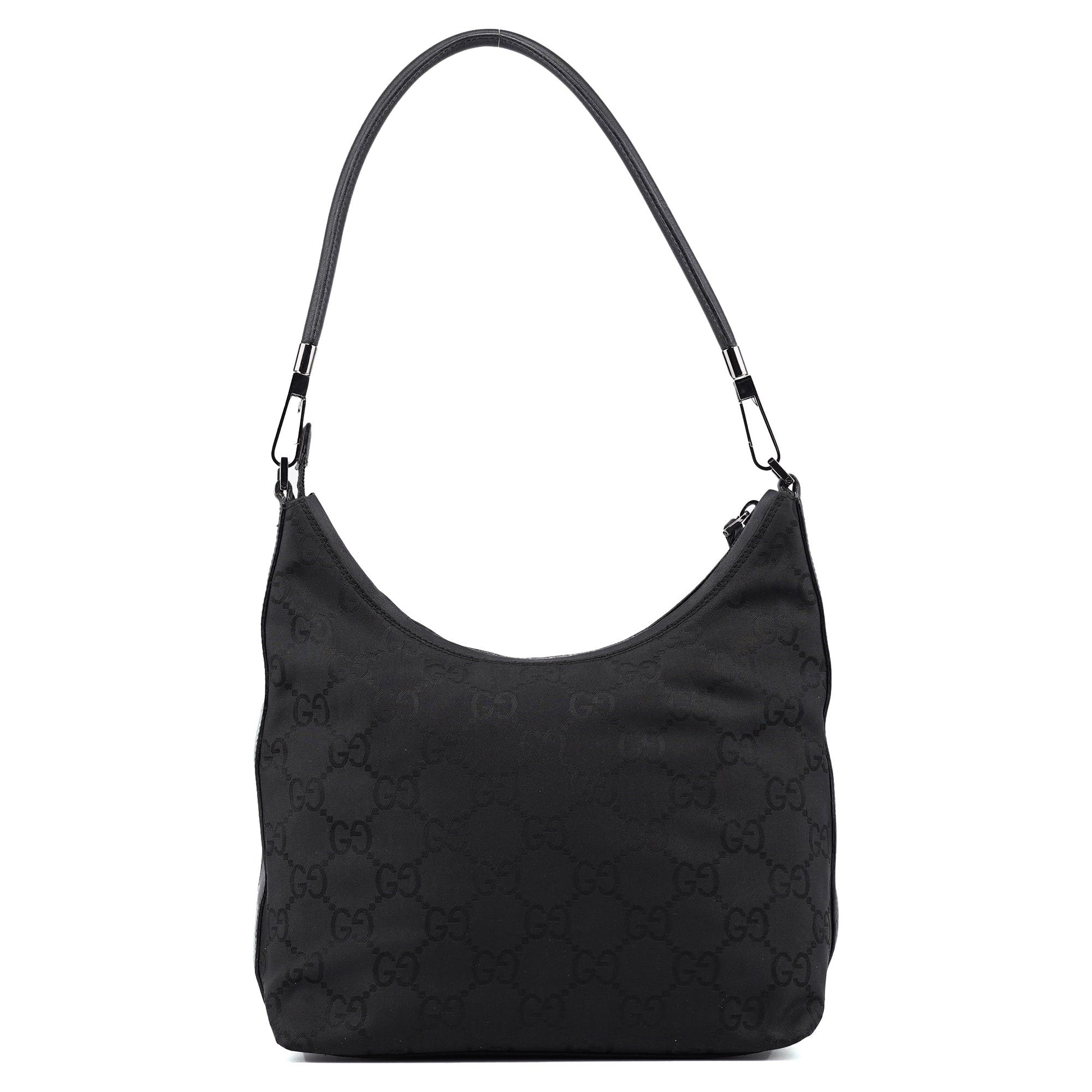 Designed by Tom Ford in the late 1990s, the Gucci GG canvas shoulder bag exudes timeless elegance. Featuring silver-tone hardware engraved with the Gucci logo and complemented by black leather trim, it has a secure zipper closure leading to a satin-lined interior. This piece seamlessly blends luxury with practical sophistication.