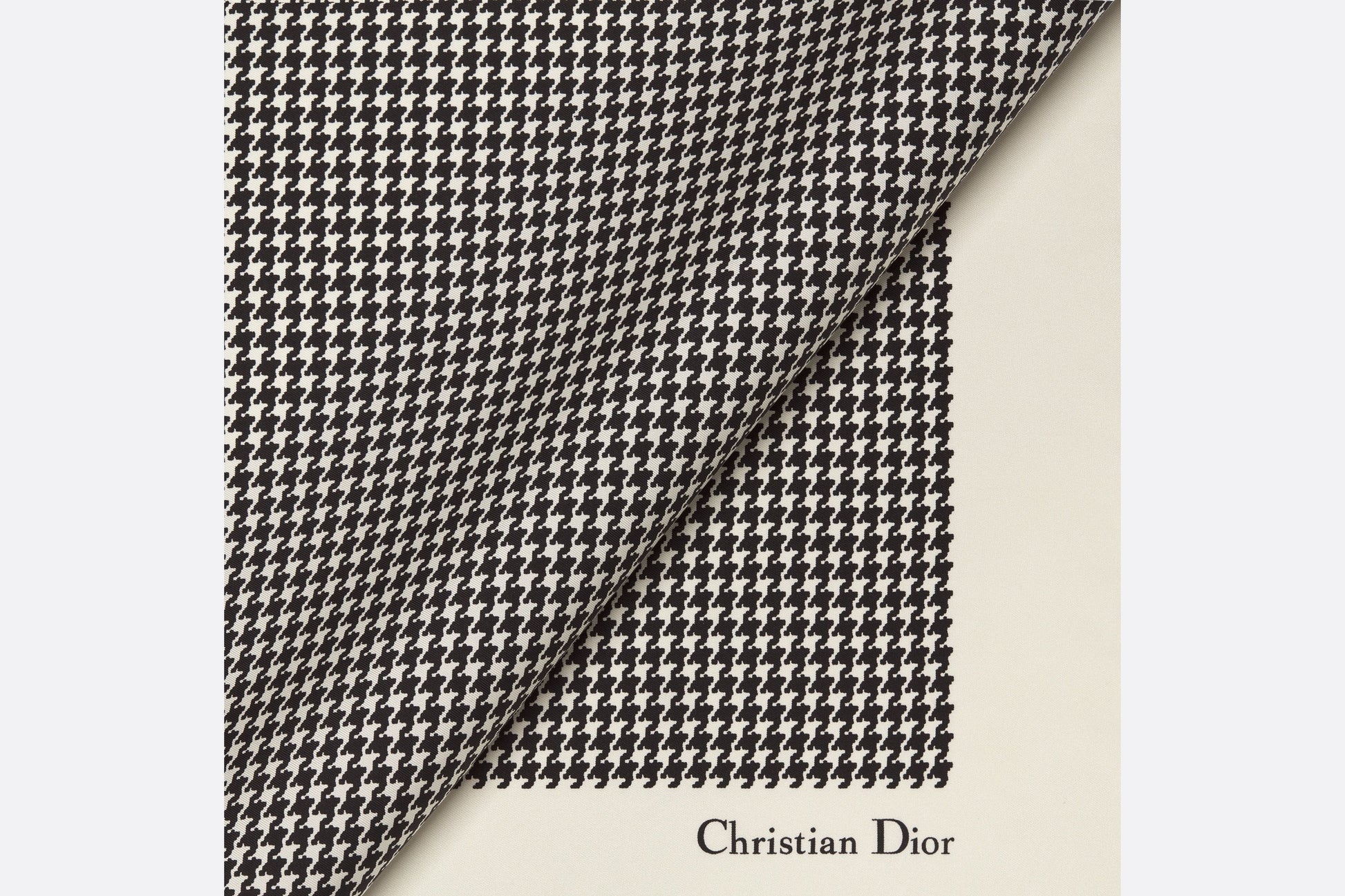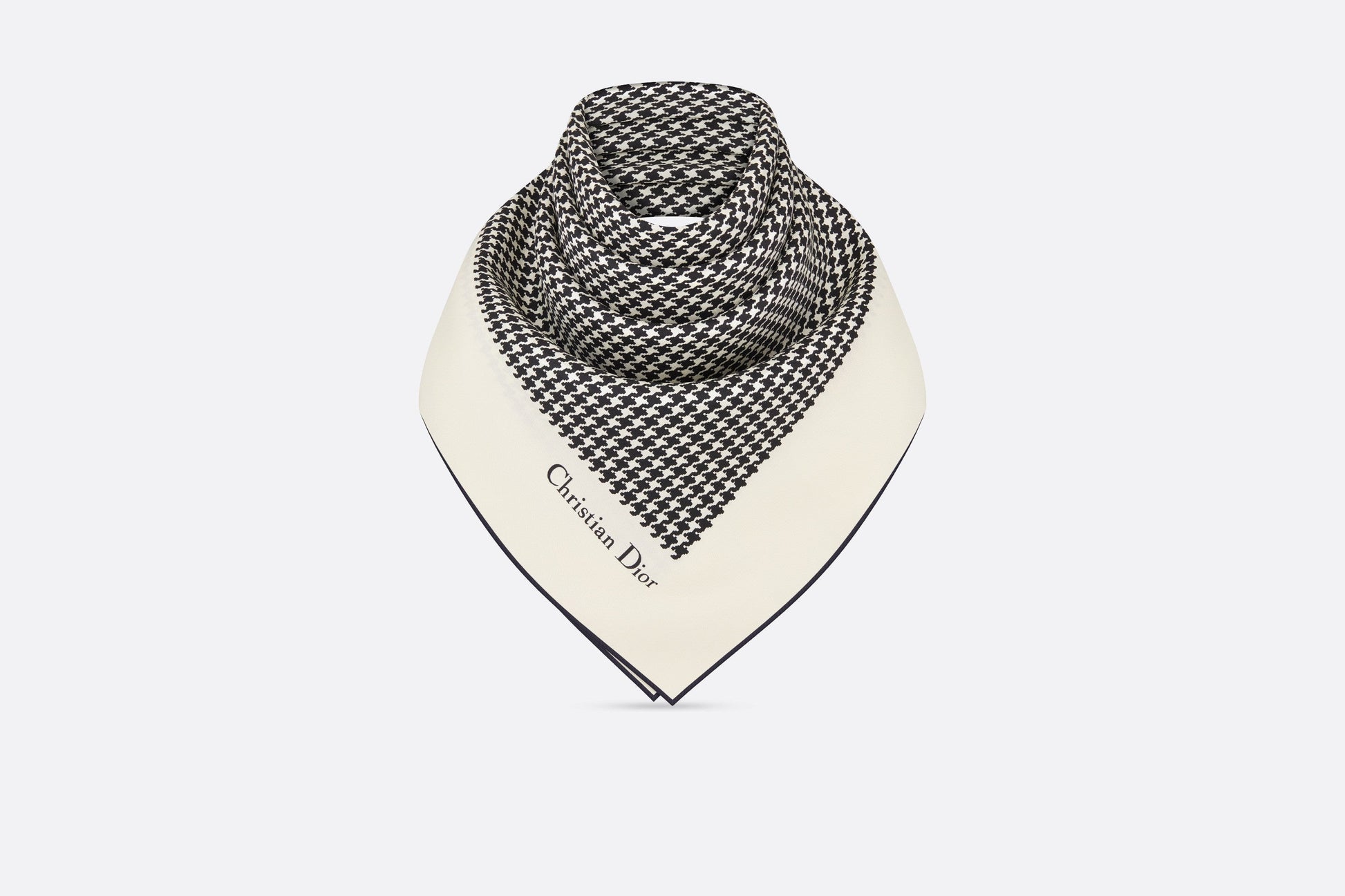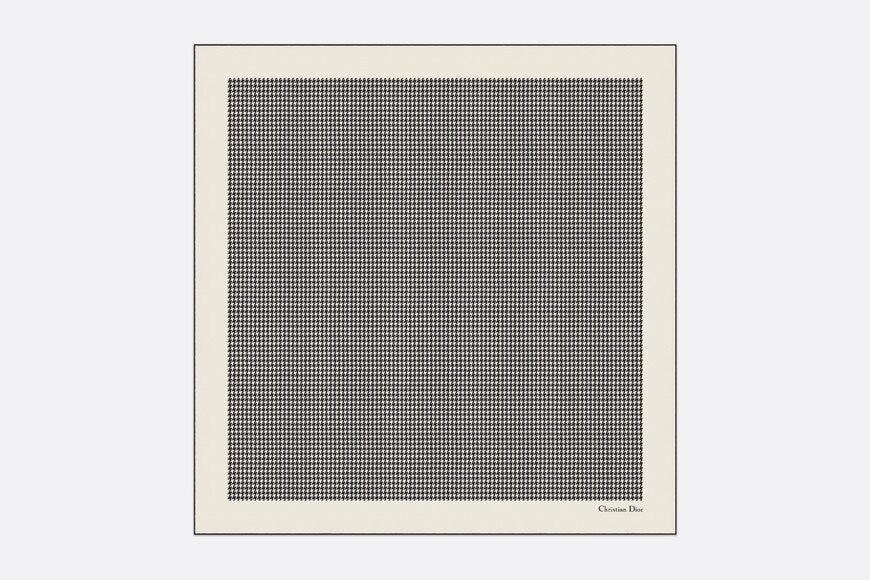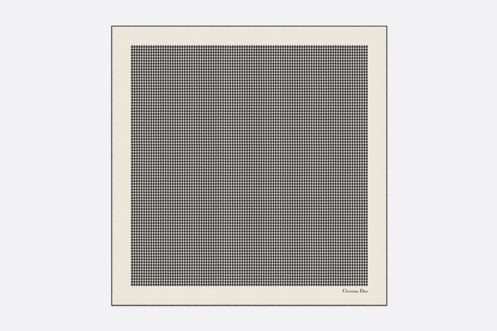 Inspired by the hallmark House address, the 30 Montaigne square scarf is embellished with the Houndstooth motif. Crafted in ivory and black silk twill, the style has hand-fringed edges and a Christian Dior signature. Elegant and timeless, the square scarf may be tied around the neck or head to complete a Dior look.