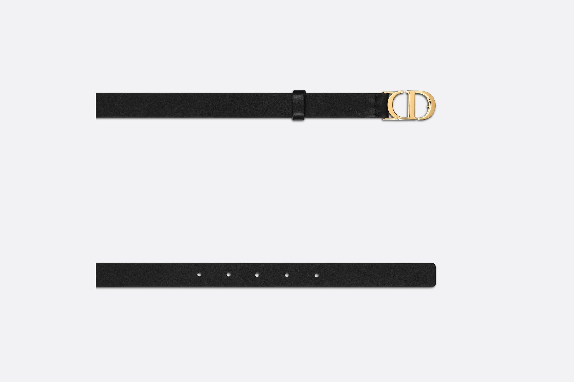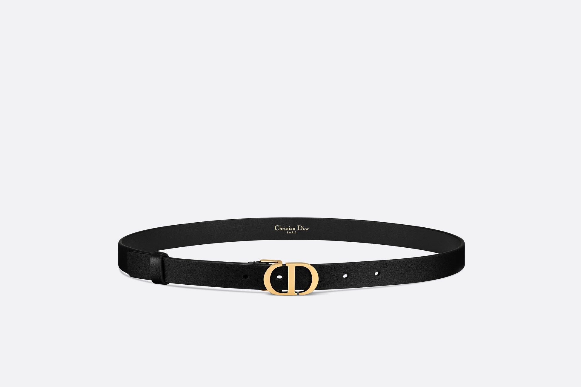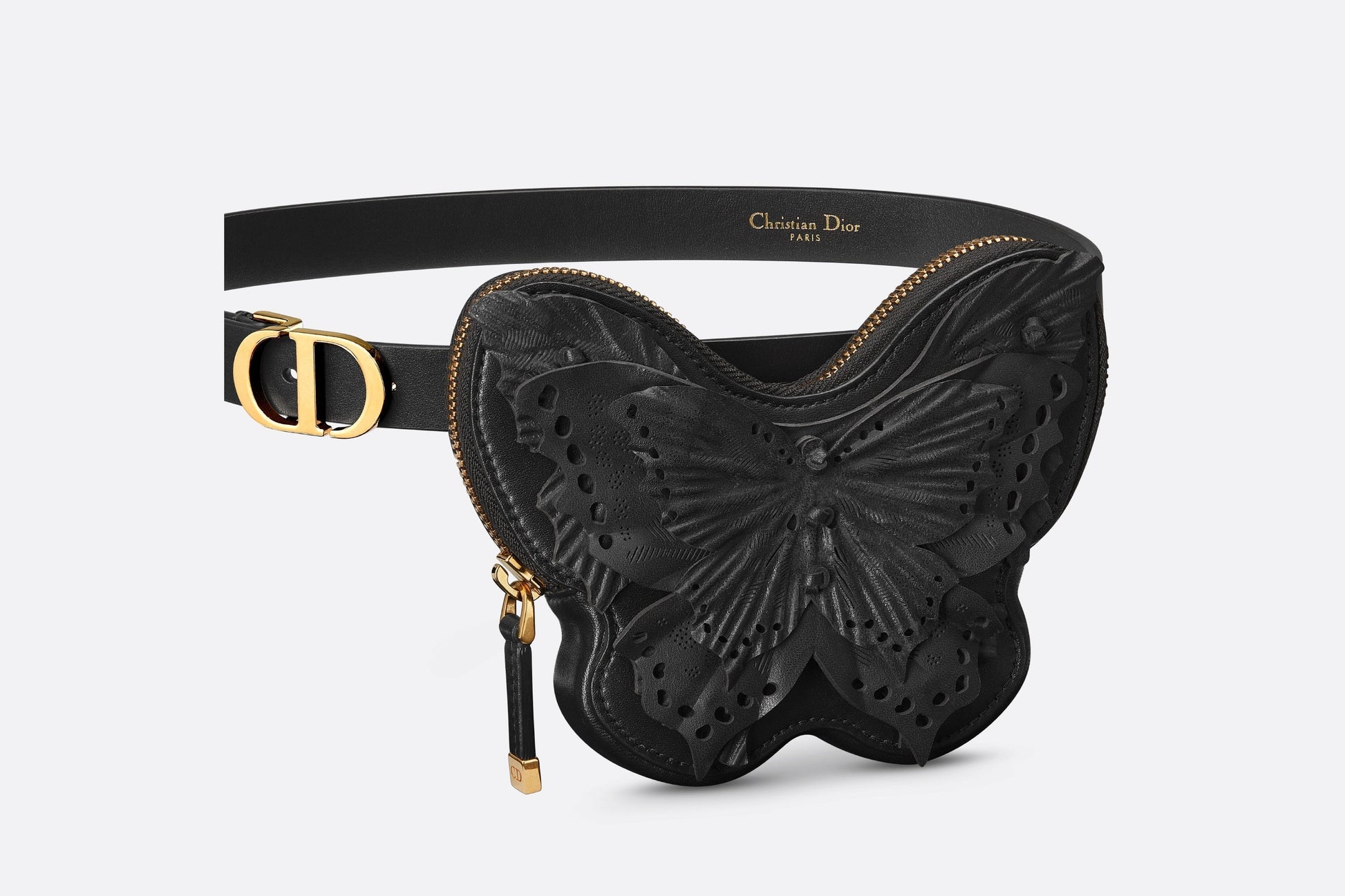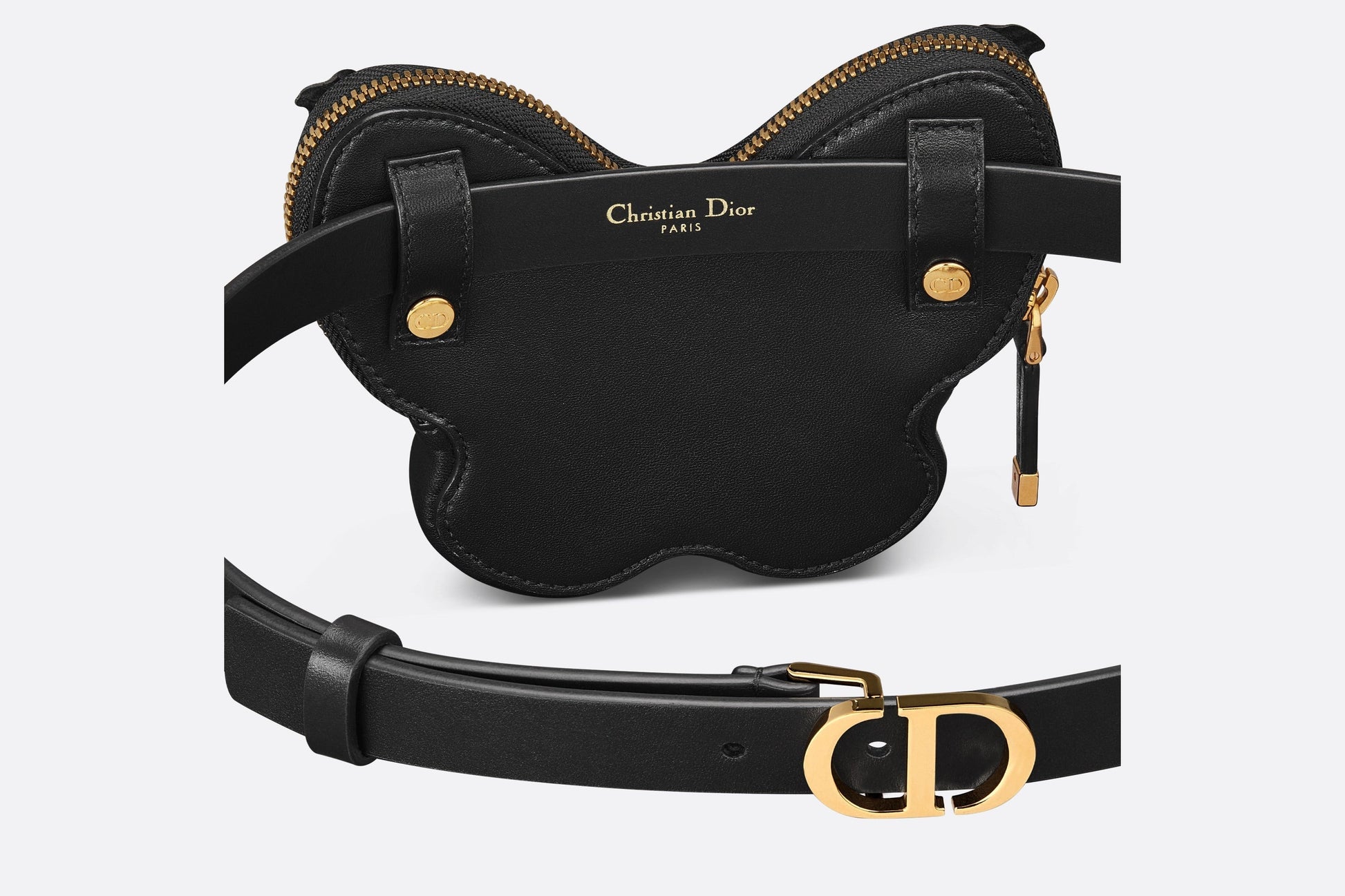 New for the Cruise 2024 collection, the belt with removable pouch creates an elegant, couture addition to the 30 Montaigne line. Crafted in black smooth calfskin, its thin silhouette is enhanced by the iconic shiny gold-finish metal CD buckle. Featuring loops to attach its removable butterfly pouch in tonal goatskin, it can hold cards and small essentials. The belt will pair effortlessly with jeans, a skirt or a dress.