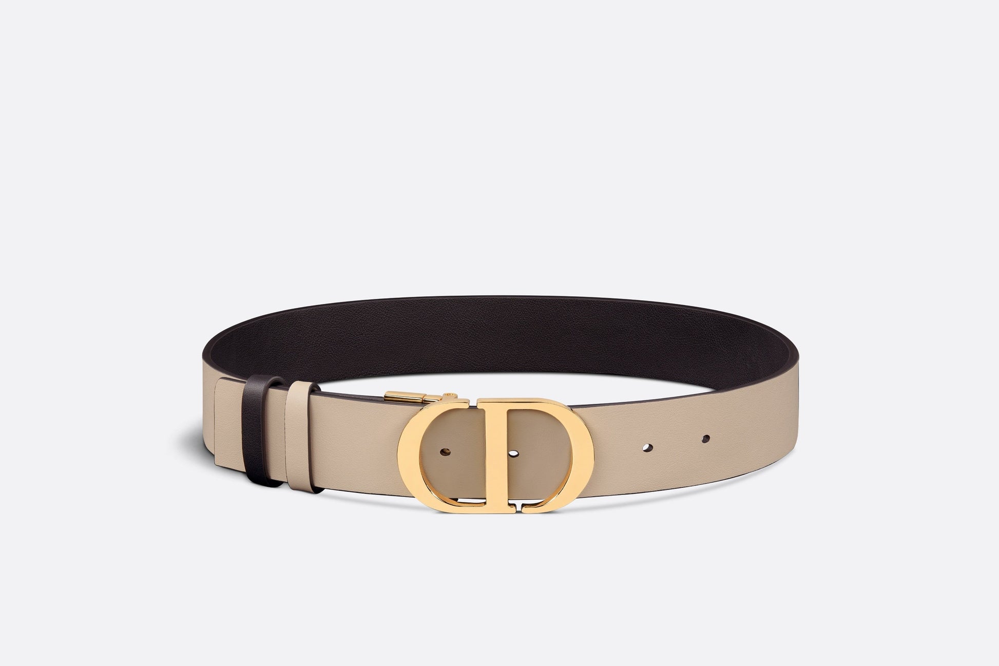 Inspired by the hallmark namesake bag, the 30 Montaigne belt is offered in a reversible variation, thanks to its swivel feature. Crafted in black smooth calfskin on one side and powder beige on the other, it is embellished with the iconic shiny gold-finish metal CD buckle. The design also features two removable loops that can be worn in an either tonal or contrasting fashion. The timeless accessory elegantly highlights the waist and will coordinate well with jeans, a skirt or a dress.