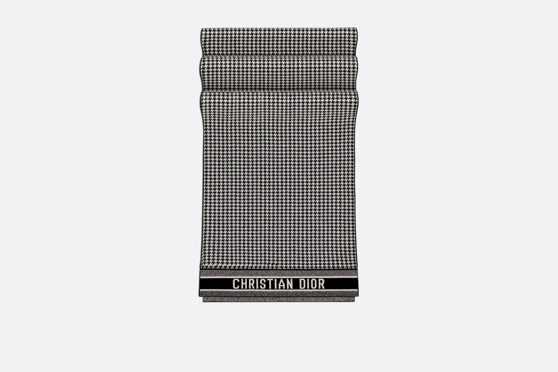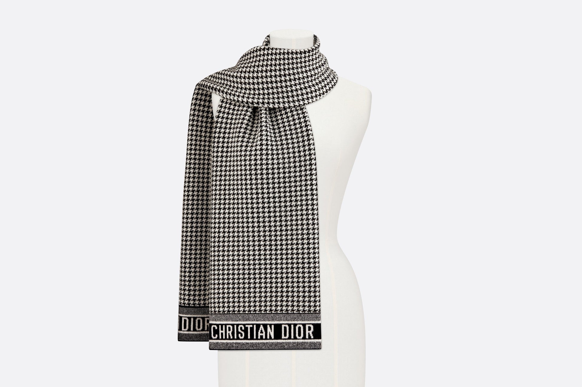 Inspired by the hallmark House address, the 30 Montaigne scarf is embellished with a black and white Houndstooth motif. Crafted in blended cashmere knit, the design is enhanced by contrasting 'CHRISTIAN DIOR' signature jacquard bands. The scarf can be worn around the neck for the finishing touch on all modern looks.