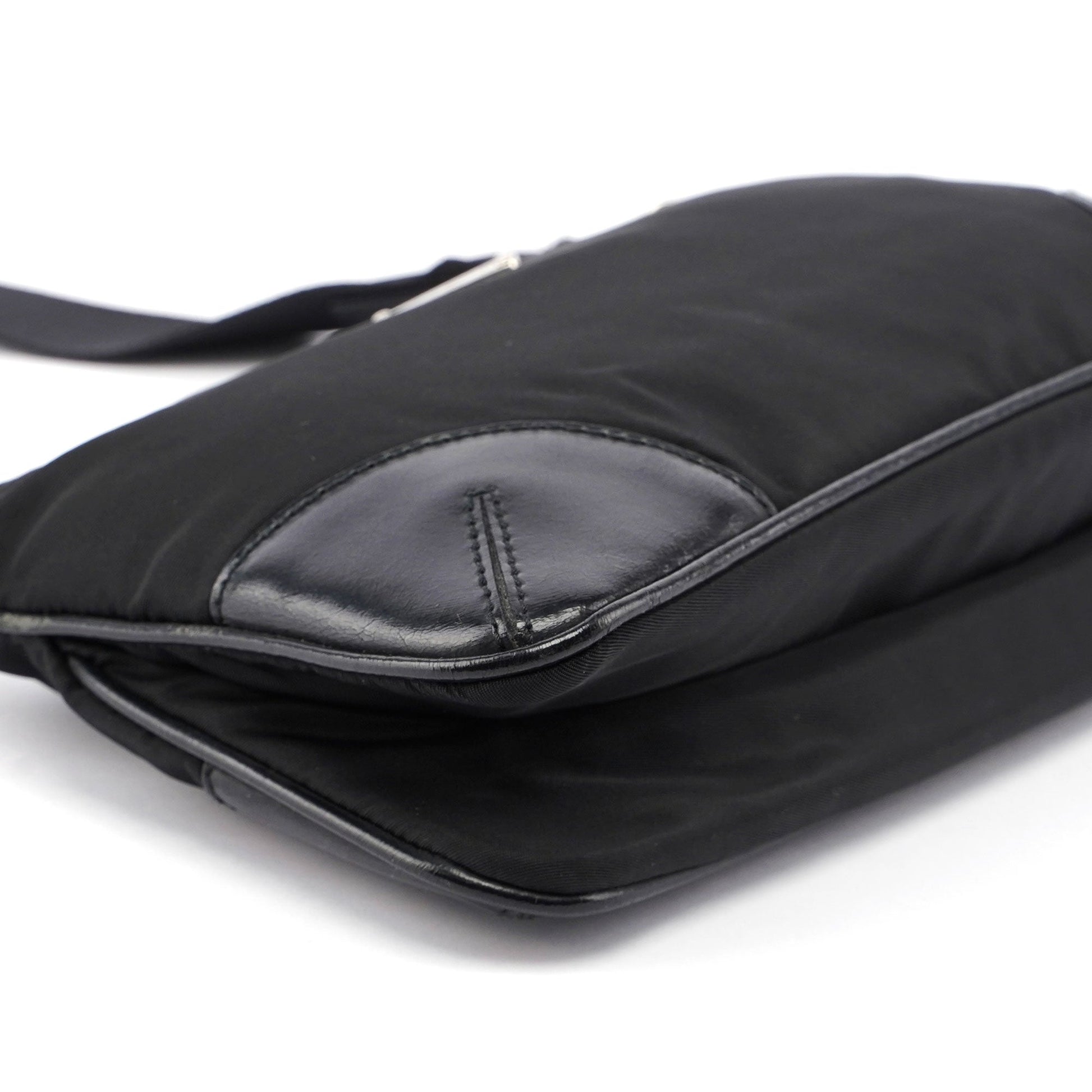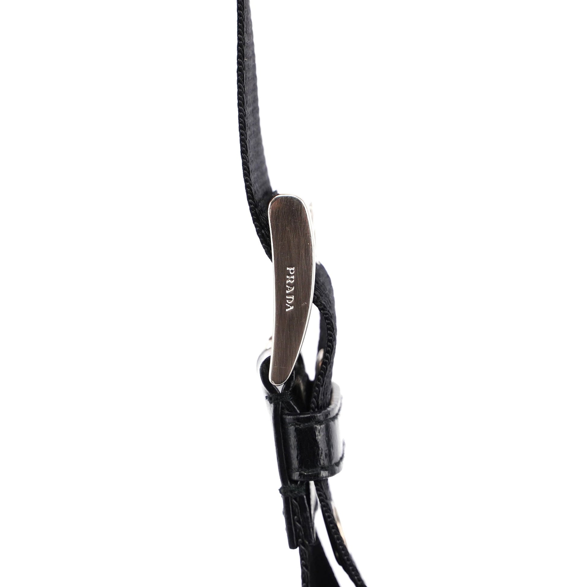 Designed in the late 1990s by Miuccia Prada, the Prada Tessuto mini hobo bag is handcrafted in classic black nylon with tonal leather trim. Its silver-tone hardware, engraved with the Prada logo, adds a touch of sophistication. The bag features an adjustable belt handle, a convenient zipper closure and a satin-lined interior with an interior zipper pocket. A Prada triangle logo plate adorns the front for added elegance.