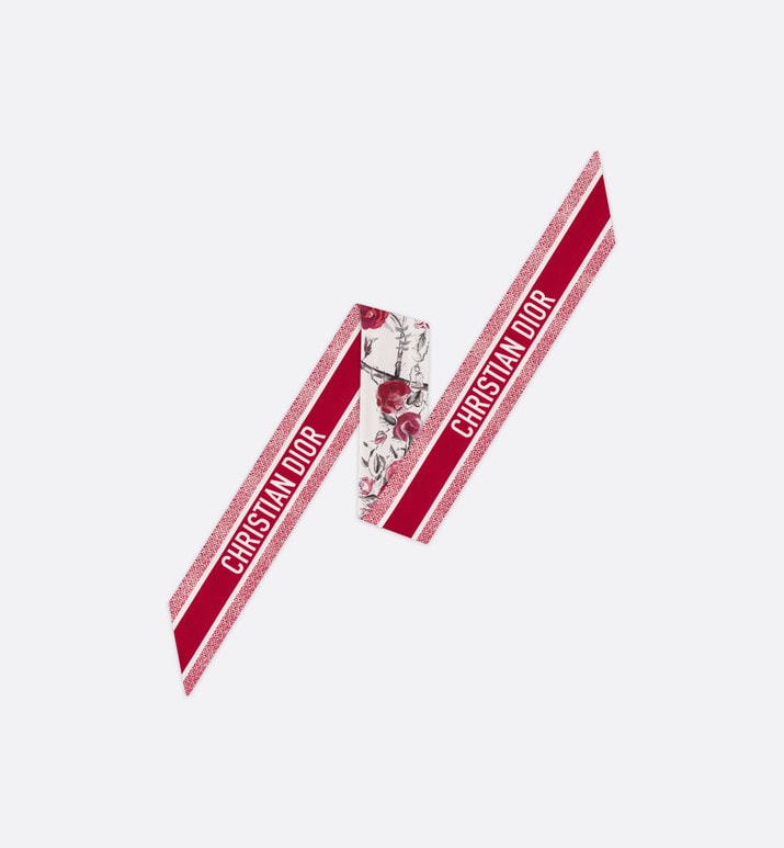 The ABCDior Mitzah scarf, crafted in silk twill, showcases one of 26 flowers that represent Christian Dior's love of nature. A passion that flourishes like never before upon Maria Grazia Chiuri's delicate creations in a celebration of botanical beauty. Escaped from a sunny rose garden, small roses climb to the window of two lovers before swirling in the space of a clear sky. Enhanced by a contrasting Christian Dior signature jacquard band on the back, the ivory multicolor Mitzah scarf adds the finishing touch to any look and may be tied around the neck, at the wrist or on a bag.