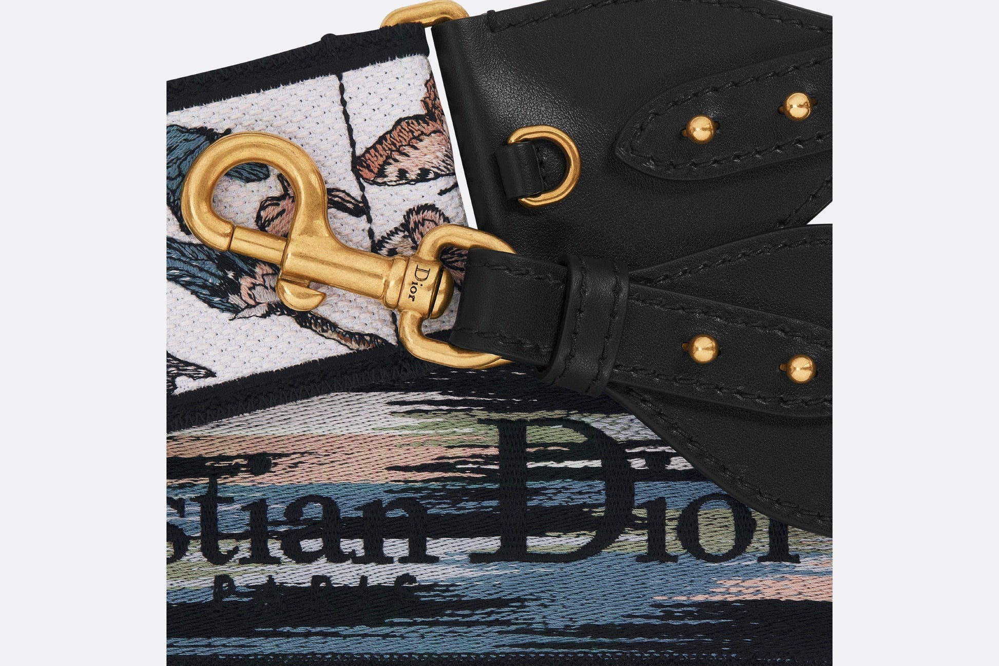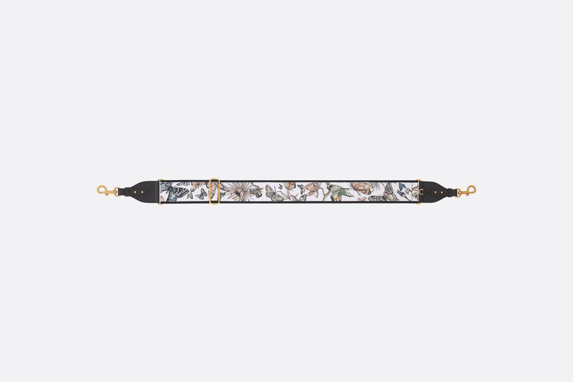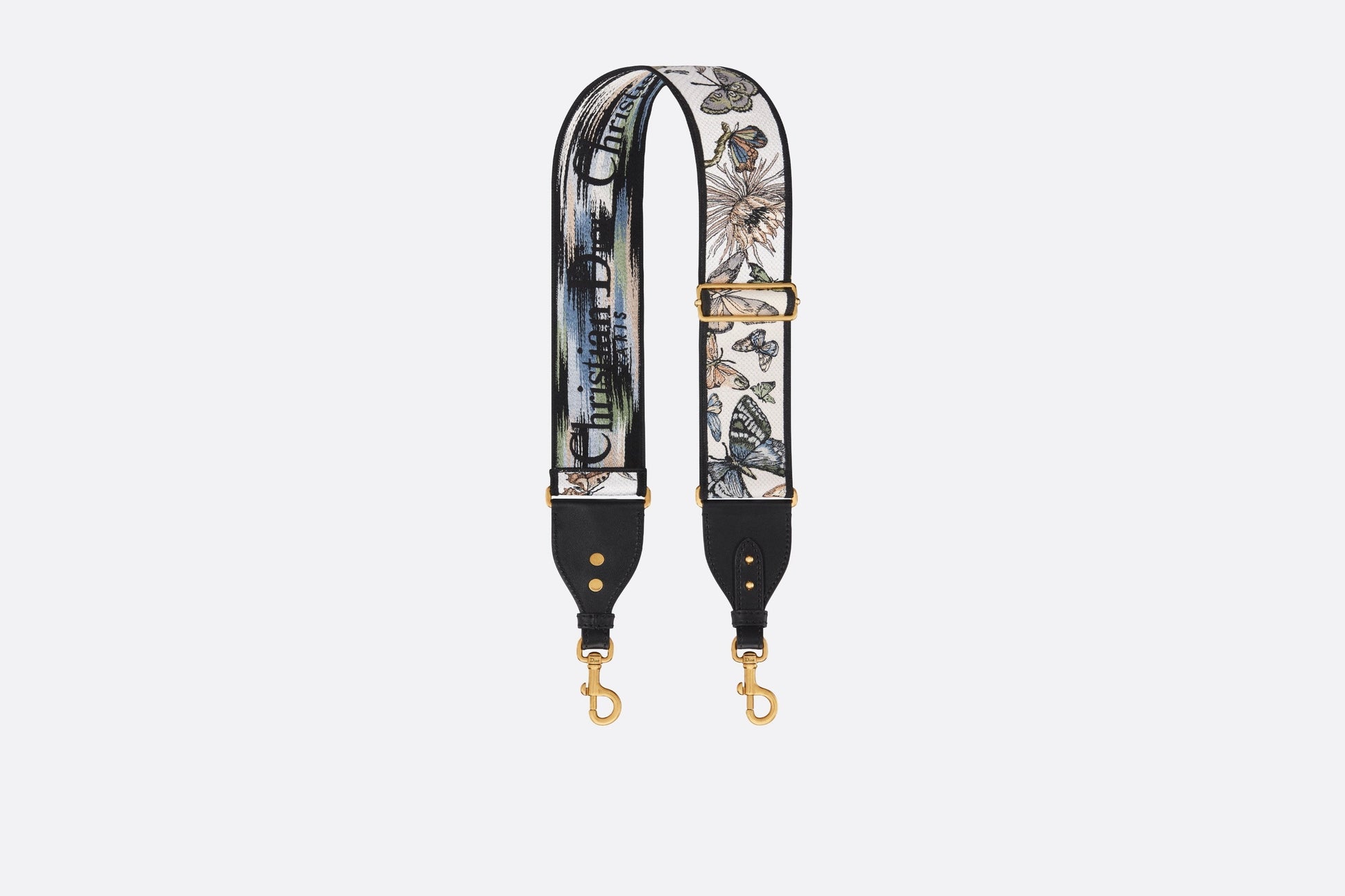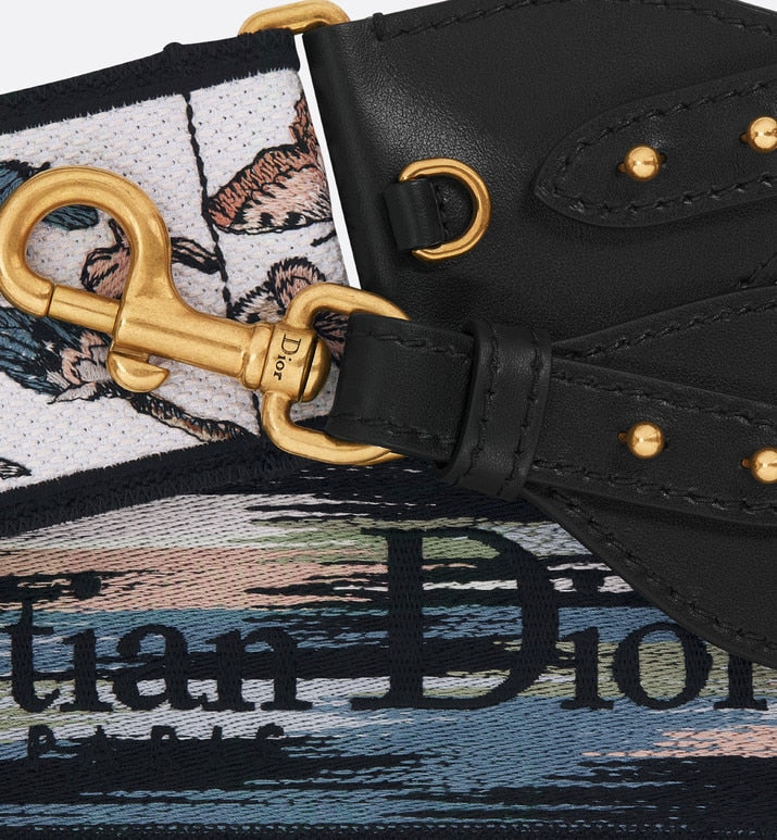 The embroidered shoulder strap is a unique accessory designed to customize select House bags and is available in an adjustable, wide style. Featuring black calfskin reinforced ends, the strap showcases the Toile de Jouy Mexico motif by Pietro Ruffo, displaying butterflies and traditional Mexican flowers in a concert of colors. Two antique gold-finish metal hooks attach the strap to the bag of choice, while the clever addition of a metal ring provides the option to carry small leather goods from the collection on the strap as well. The white multicolor shoulder strap may be worn over the shoulder or crossbody for a highly personalized look.