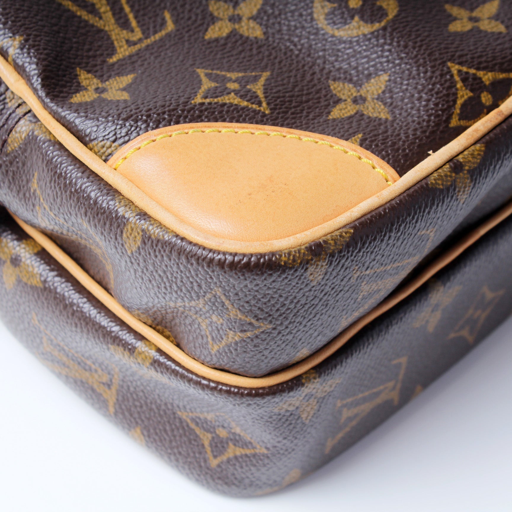 Exterior: The exterior coated canvas is free of any rips or cracks. The corners and leather details show minor signs of wear and water marks as pictured.