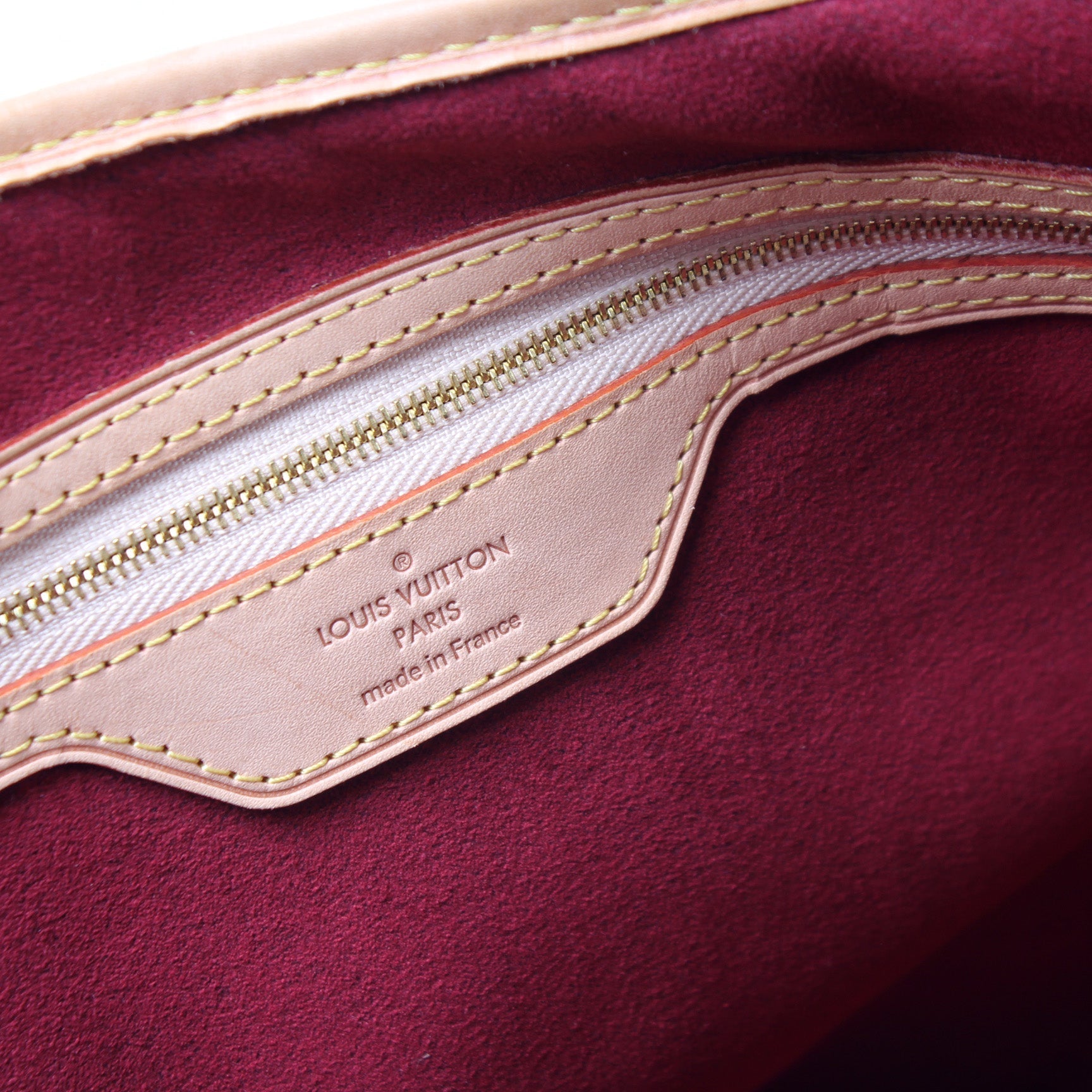 Exterior: The exterior coated canvas is free of any rips or cracks. The exterior features one open pocket. The leather details have minor scuffs.