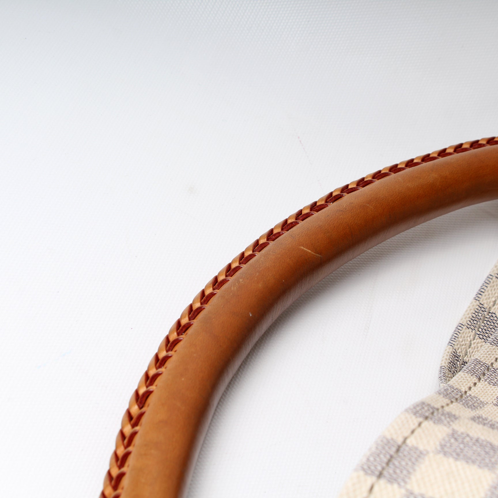 Handle: The leather handle shows major wear and discoloration,