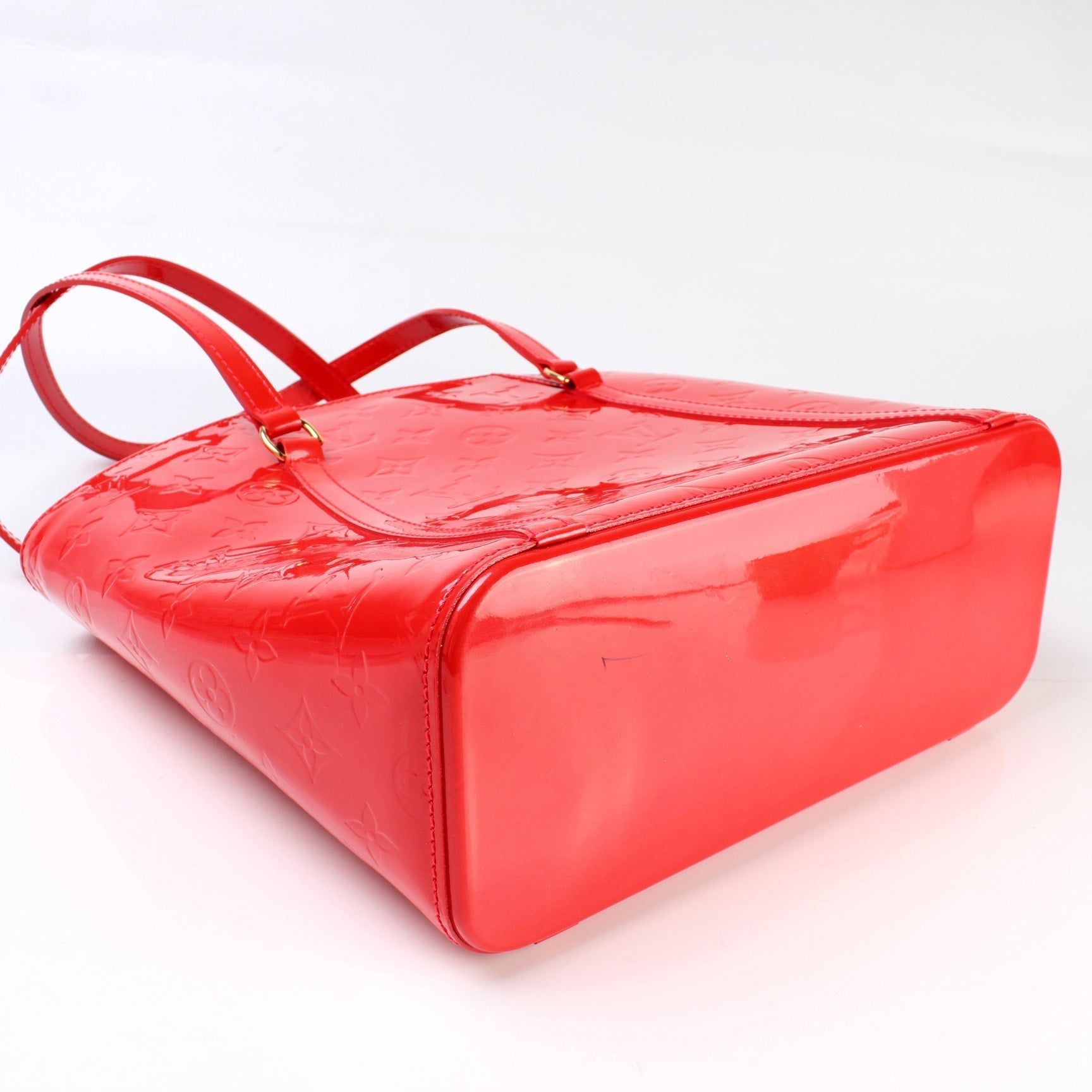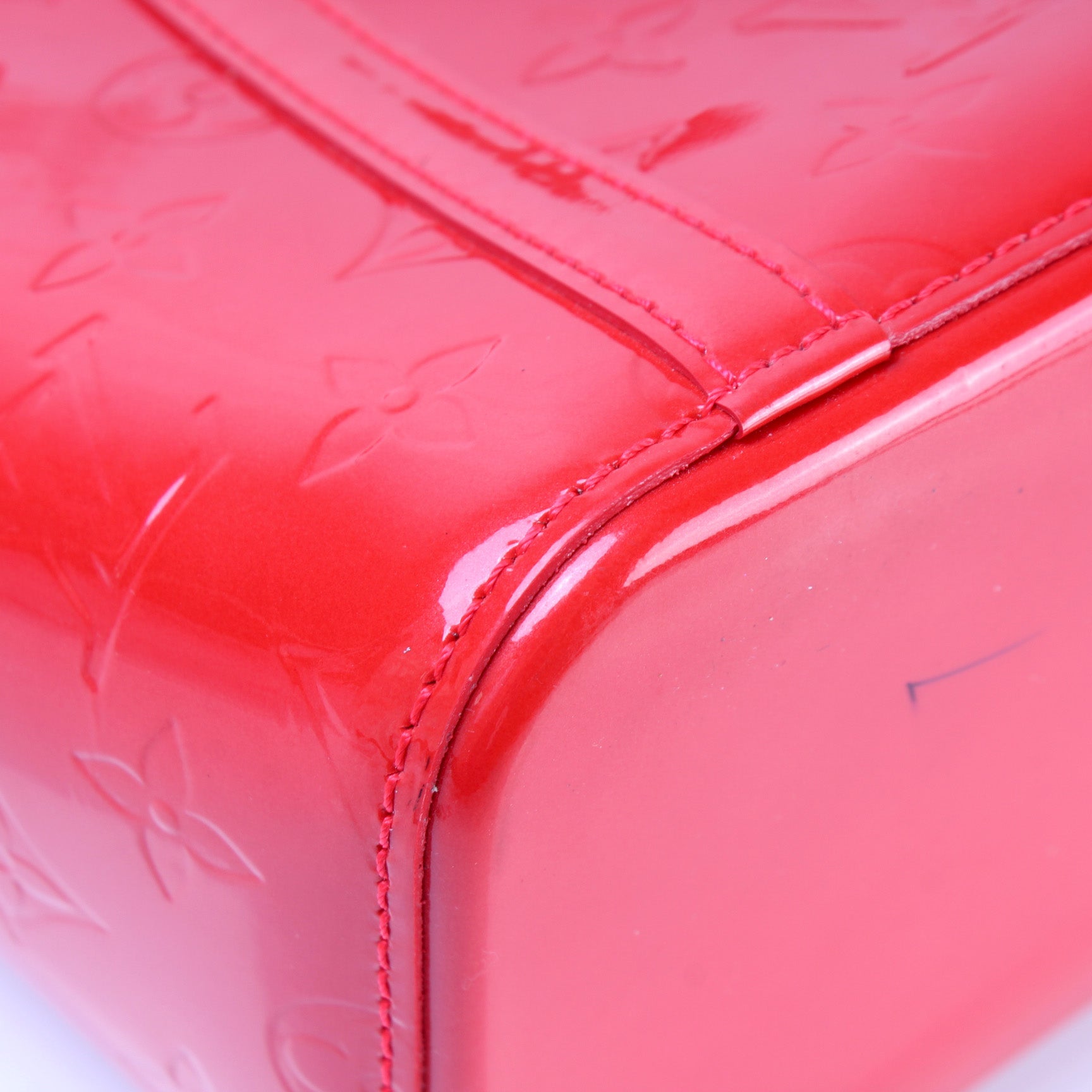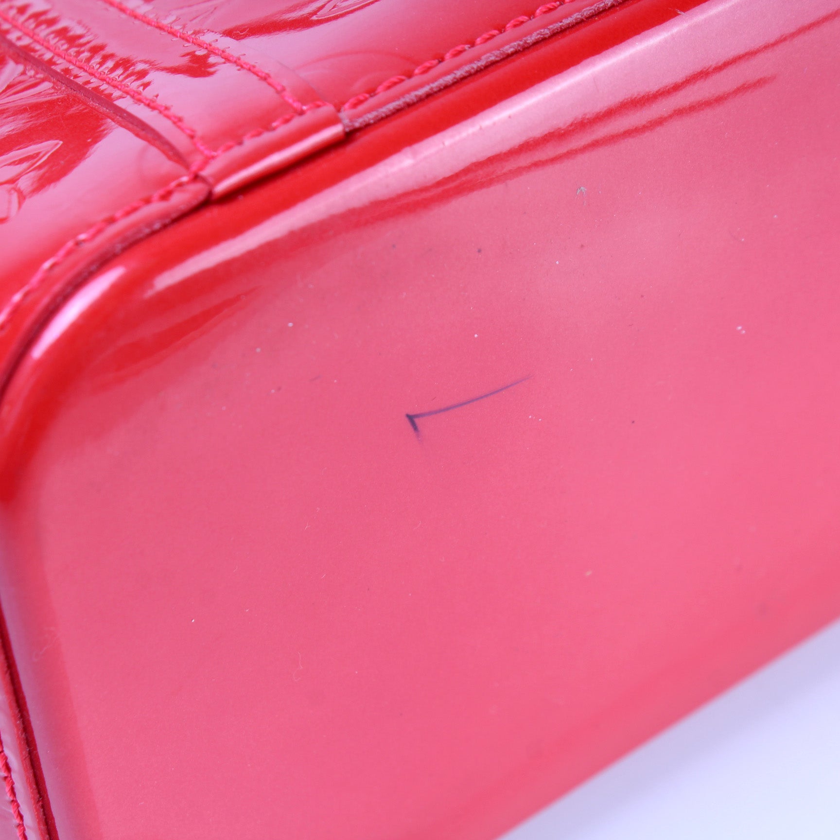 Exterior: The exterior vernis leather is free of any rips or cracks. The base and corners show minor wear and scuffs. There is a pen mark at the base of the bag.