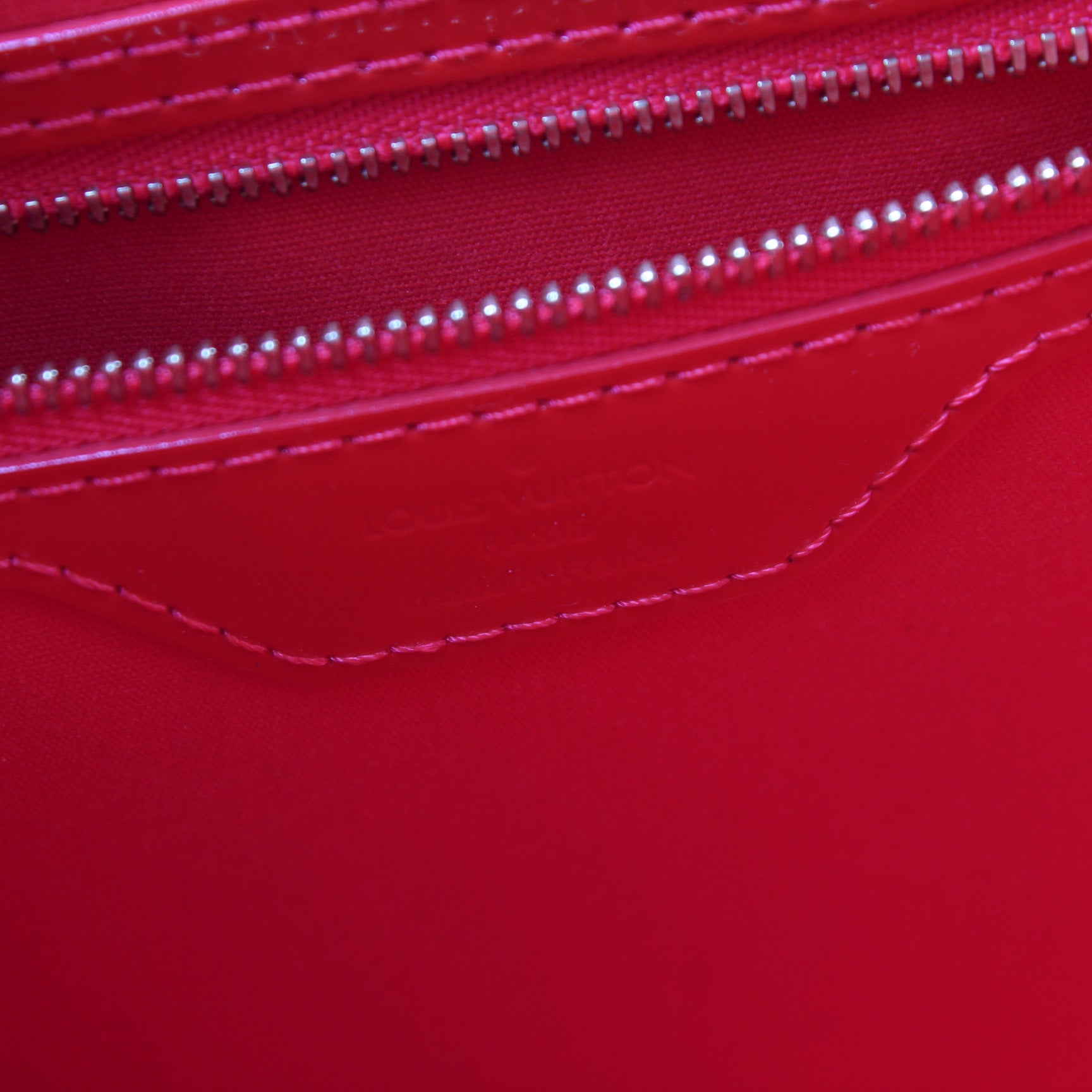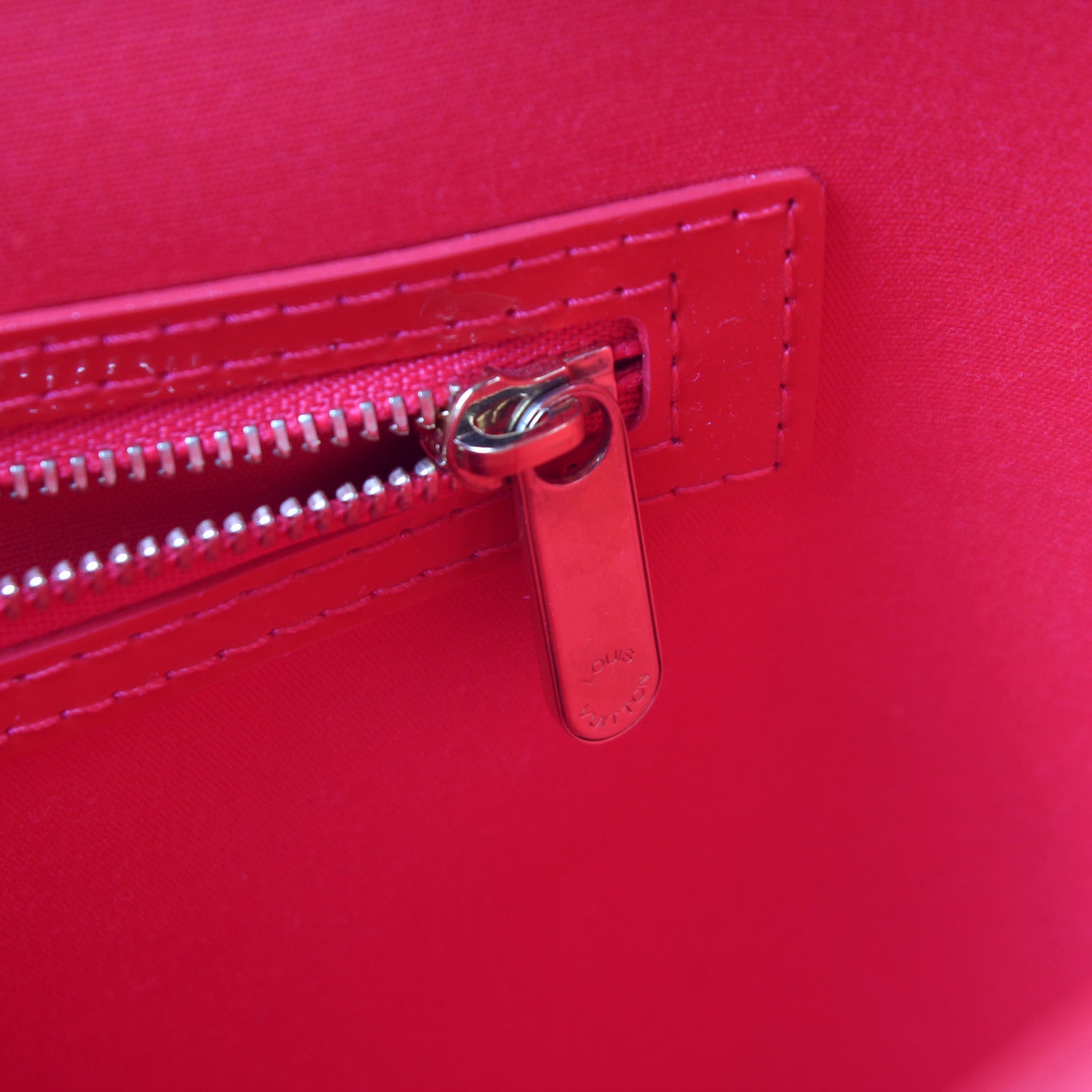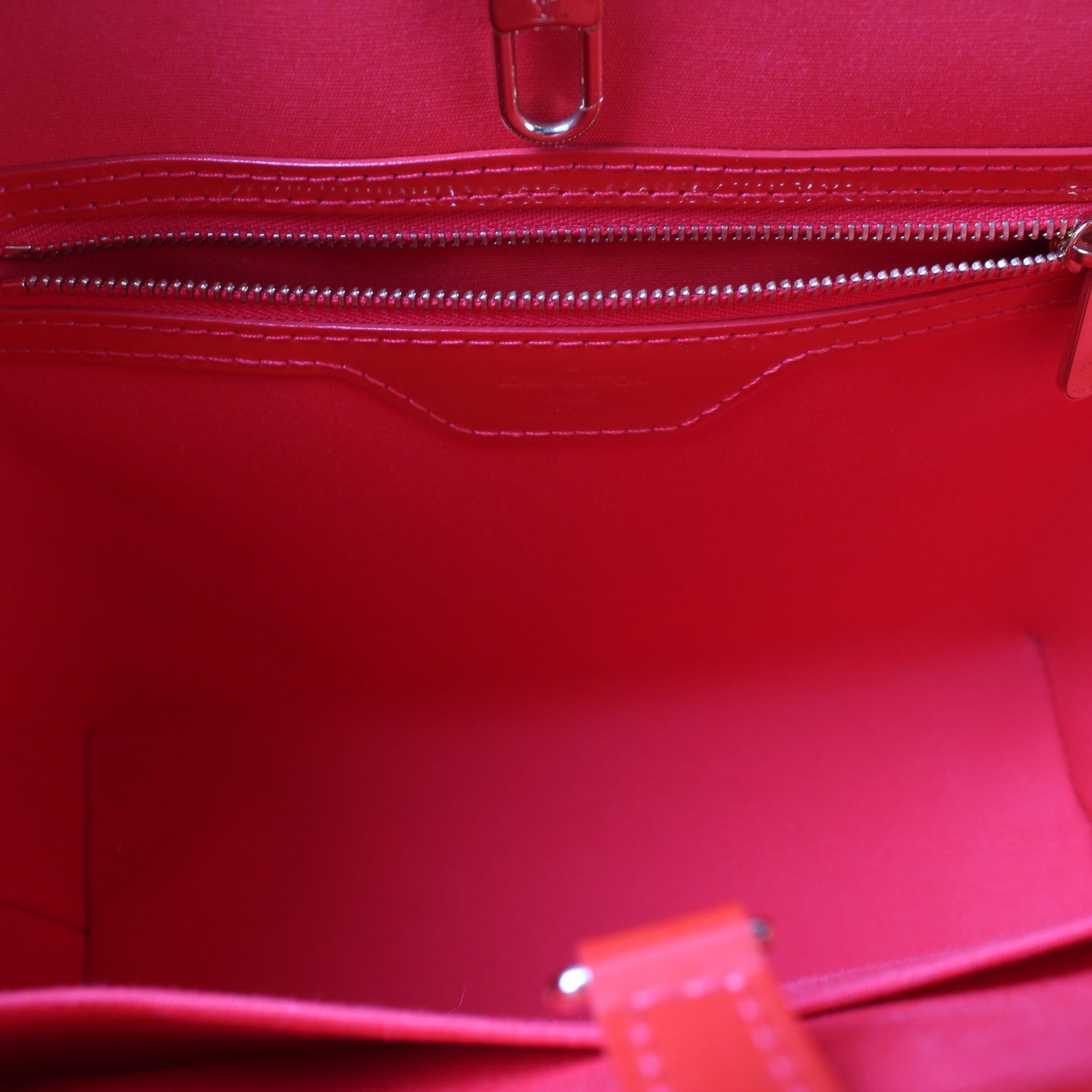 Exterior: The exterior vernis leather is free of any rips or cracks. The base and corners show minor wear and scuffs. There is a pen mark at the base of the bag.
