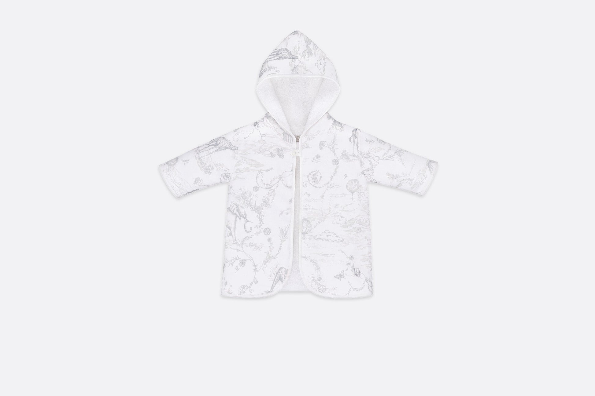 Hooded bathrobe in cotton satin with grey ‘Toile de Jouy’ print, lined with white terry cotton and embroidered with the ‘Dior Oblique’ in grey.