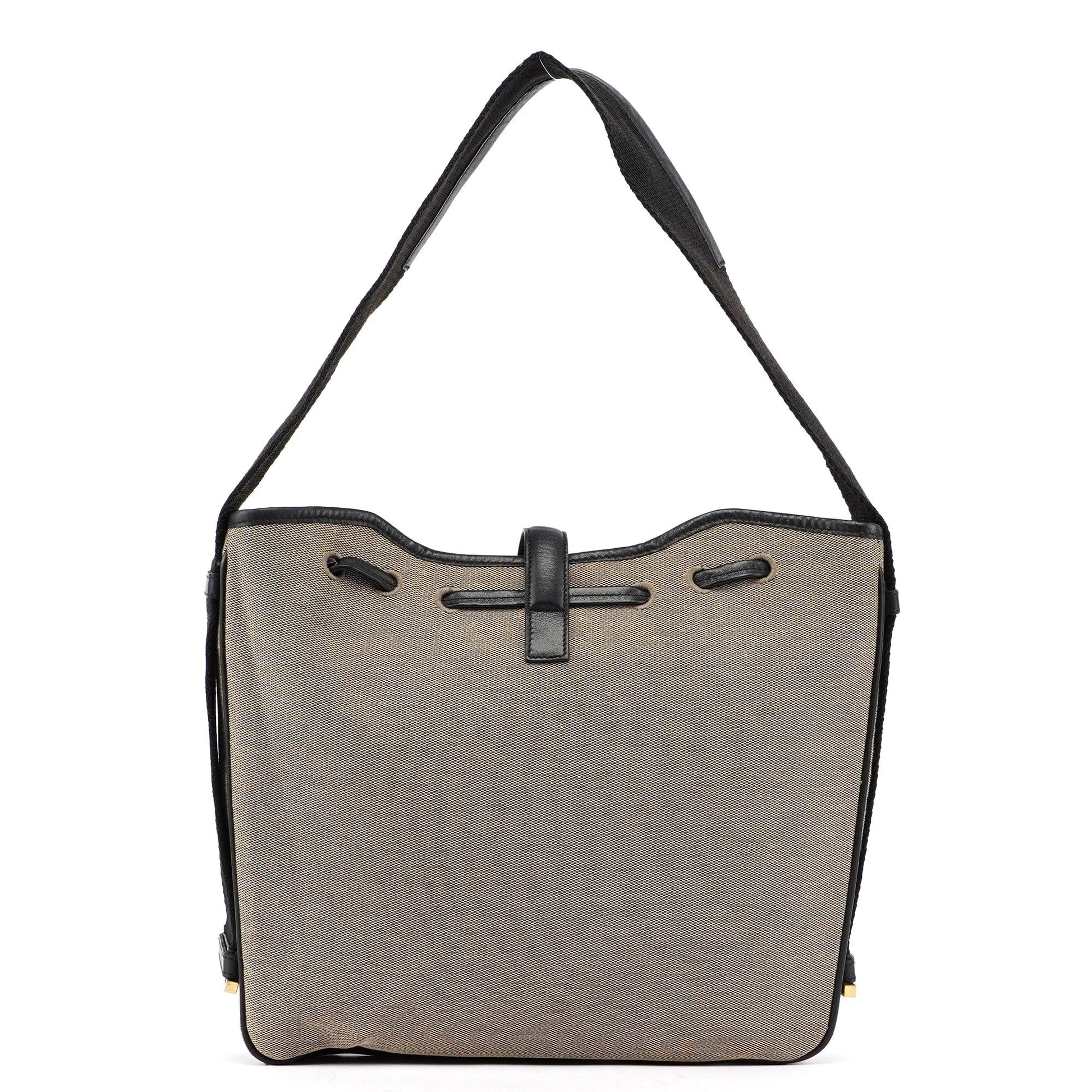 Designed by Tom Ford in the late 1990s, the Gucci Jackie shoulder bag exudes sophistication. Made from beige canvas, black leather trim and with gold-tone hardware engraved with the iconic Gucci logo, it features the signature Jackie clasp closure. Inside, the satin-lined interior offers practicality with a convenient interior zipper pocket.