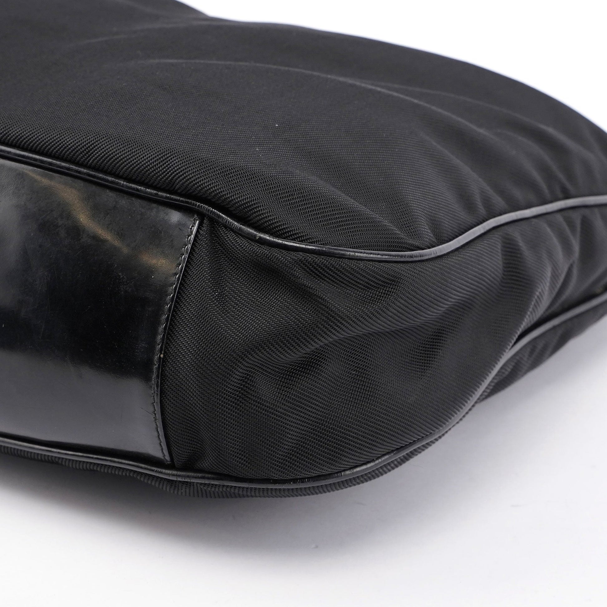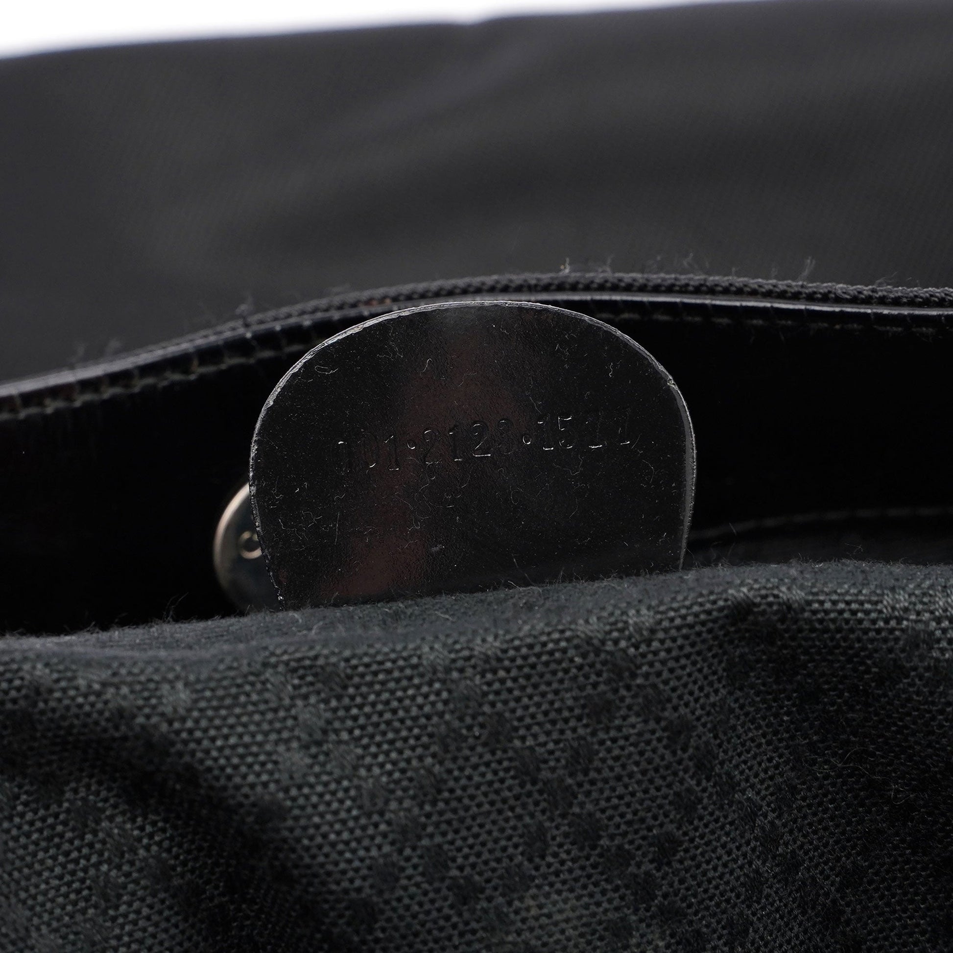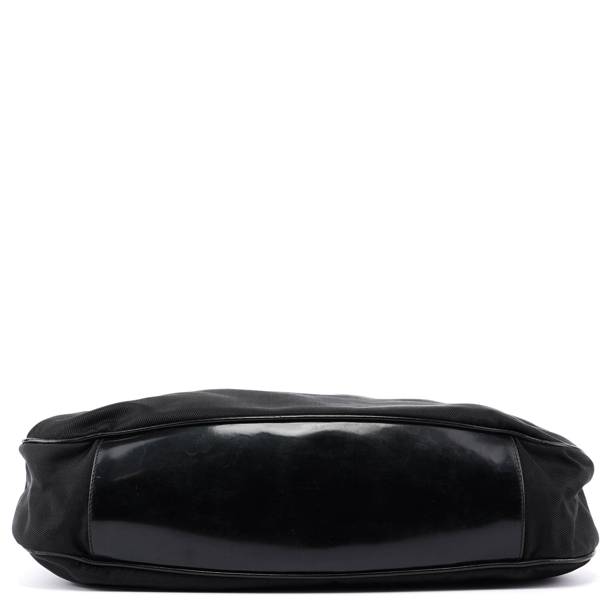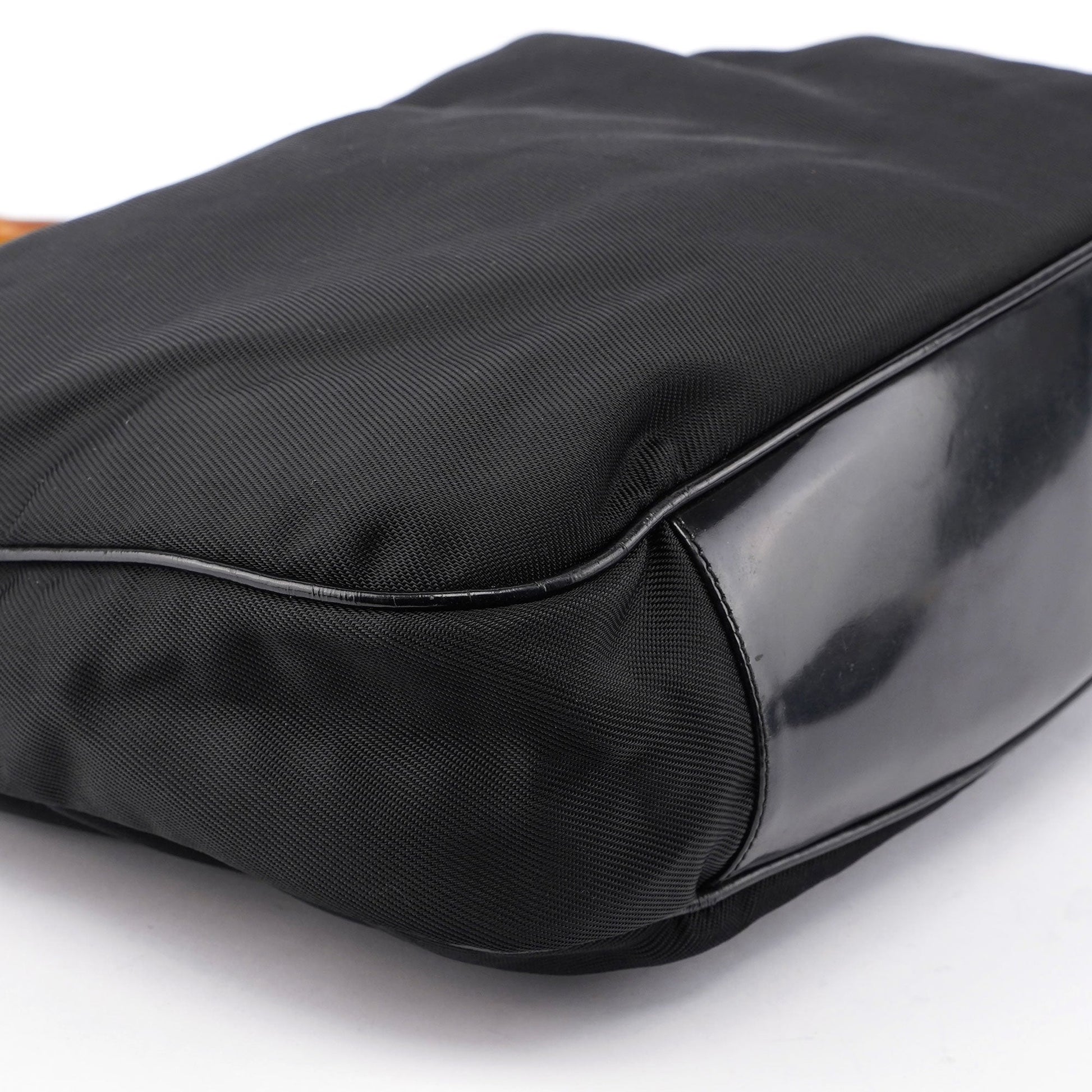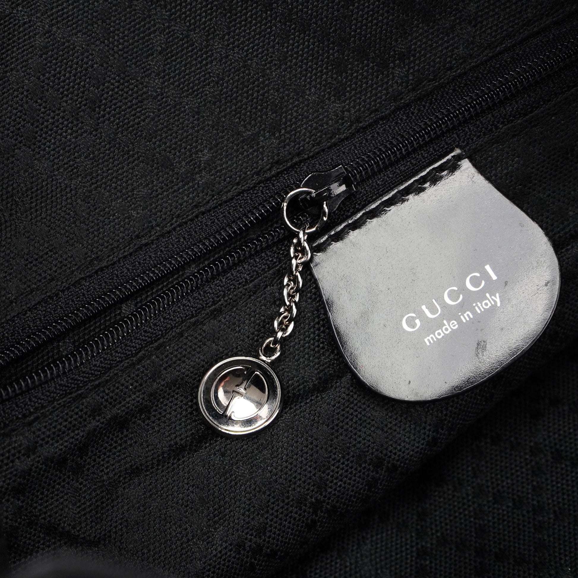 This Gucci Bamboo shoulder bag, is a timeless classic designed in the late 1990s by Tom Ford. The iconic bamboo handle adds a touch of sophistication to the bag, while the black canvas, silver-tone hardware, and tonal patent leather trim create a stunning visual contrast. The bag's spacious magnetic-closed compartment is lined with satin and includes an interior zipper pocket.