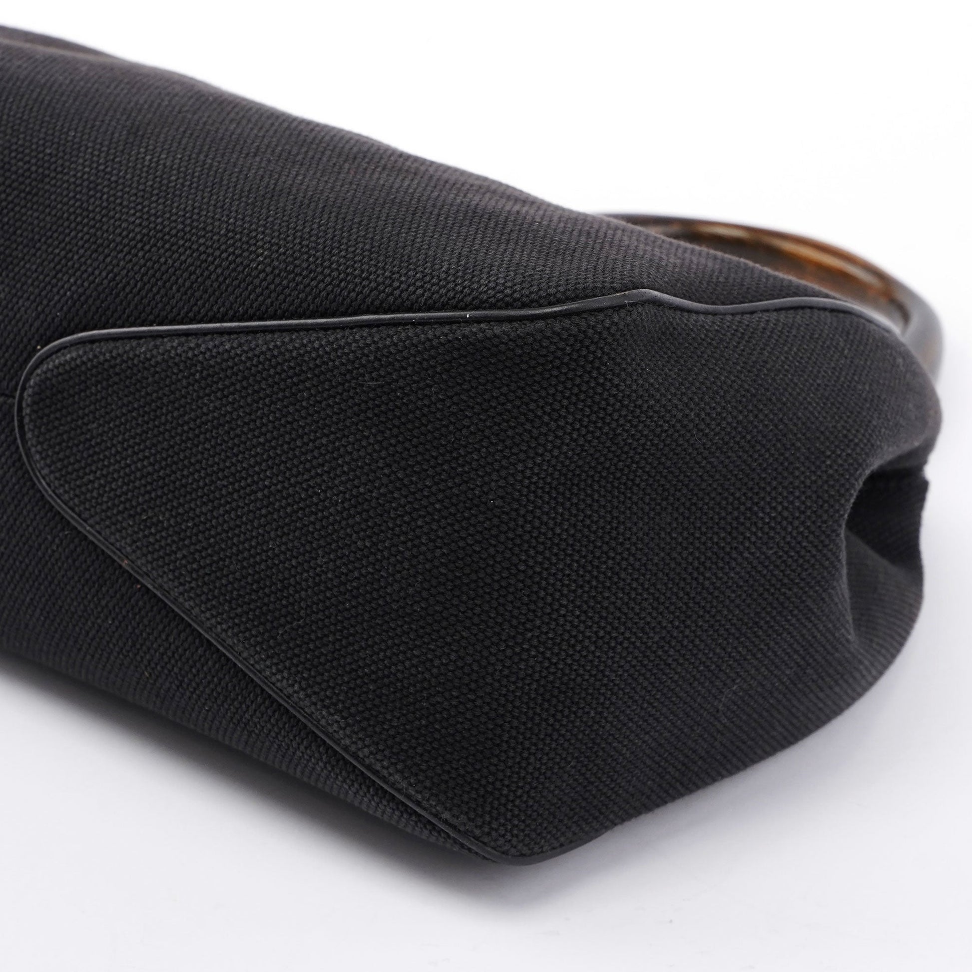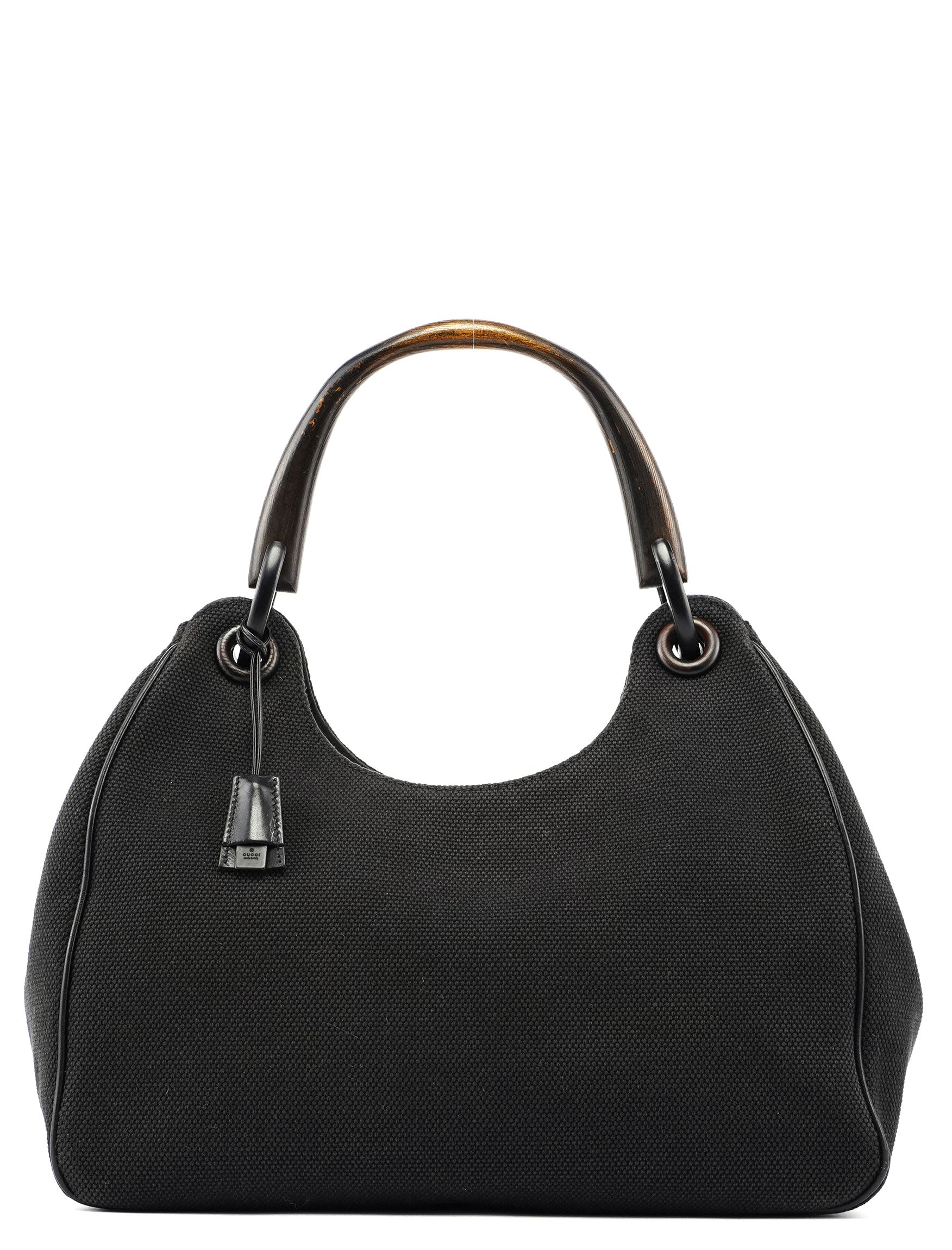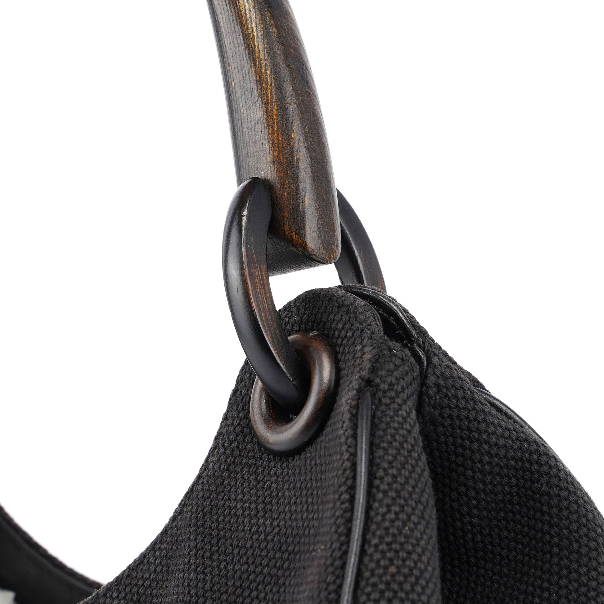 Designed by Tom Ford for the iconic 2003 collection, this Gucci top handle bag exudes sophistication. Handcrafted in black canvas, its distinctive handle curves elegantly in wood. The interior, lined in G monogram cotton, boasts a practical zipper pocket for essentials. A Gucci logo plate adorns the front, adding a signature touch of luxury.