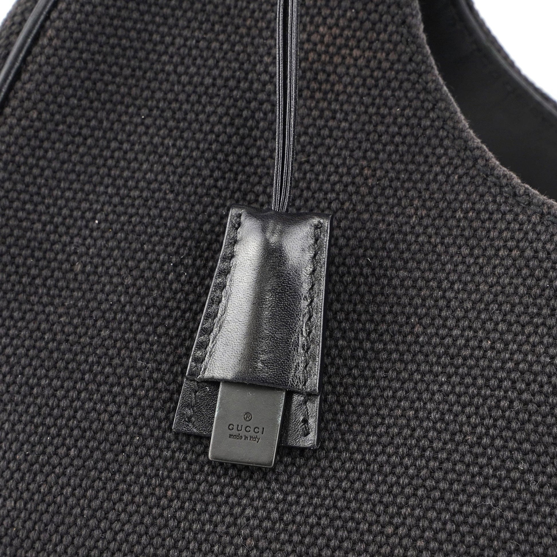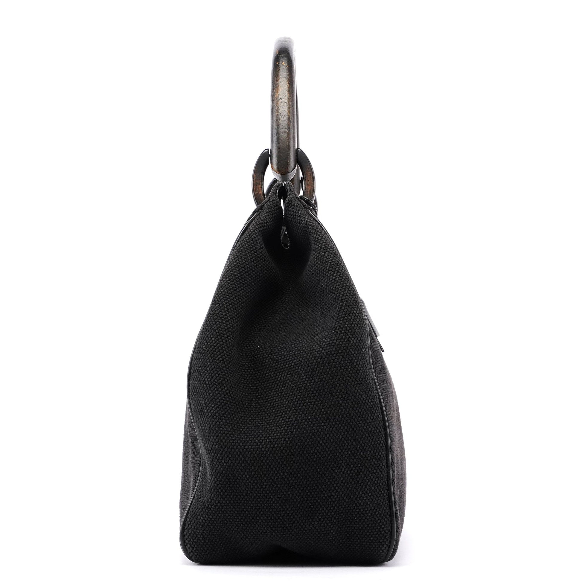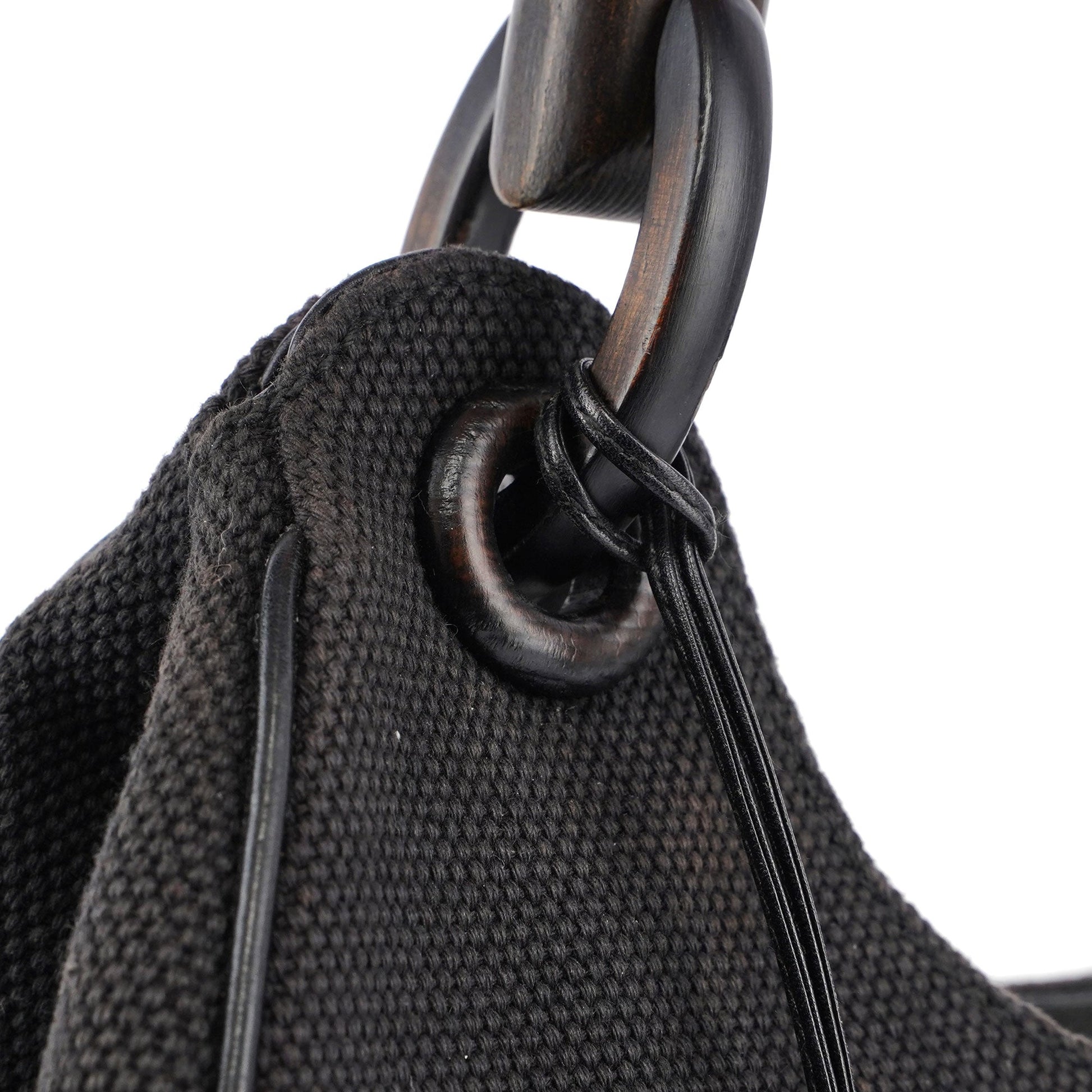 Designed by Tom Ford for the iconic 2003 collection, this Gucci top handle bag exudes sophistication. Handcrafted in black canvas, its distinctive handle curves elegantly in wood. The interior, lined in G monogram cotton, boasts a practical zipper pocket for essentials. A Gucci logo plate adorns the front, adding a signature touch of luxury.