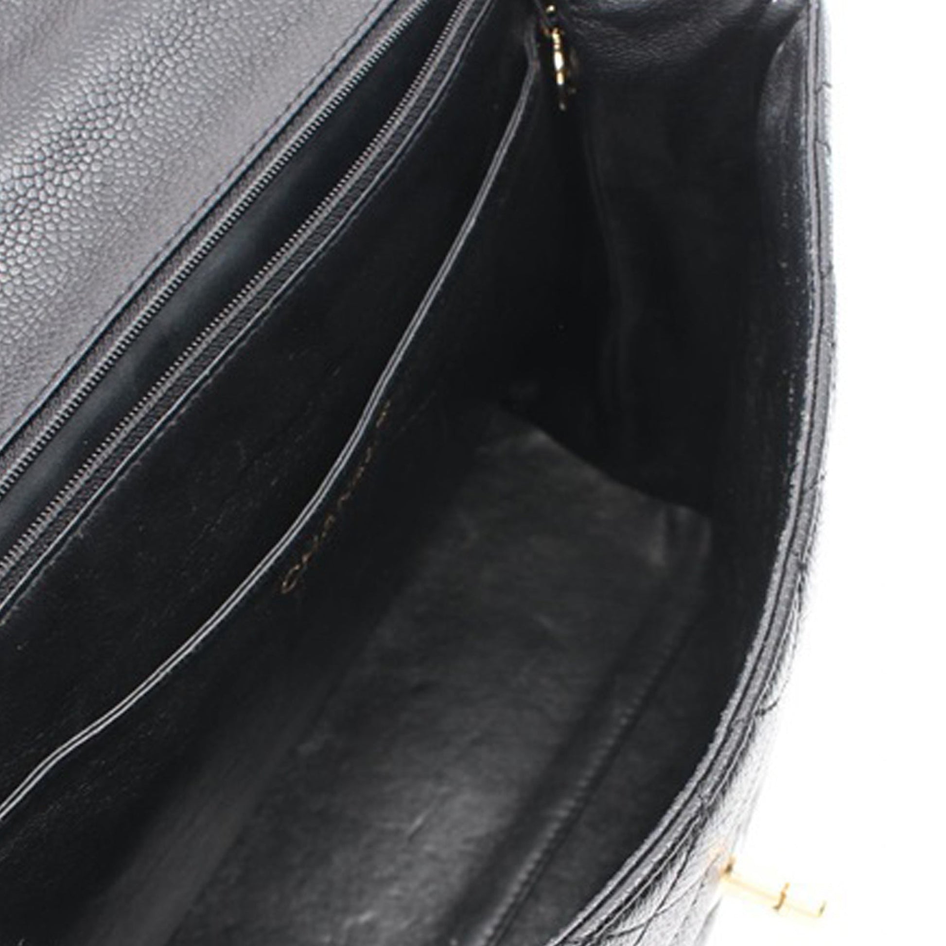Product Details: Black Chanel Caviar Kelly Top Handle Bag. The Kelly features a caviar leather body, rolled top handle, a top flap with CC turn lock closure, an exterior slip pocket, and interior zip and slip pockets. 9.4" L x 11.8" W x 4.3" D, 3.3" drop. Serial number 6376243.
