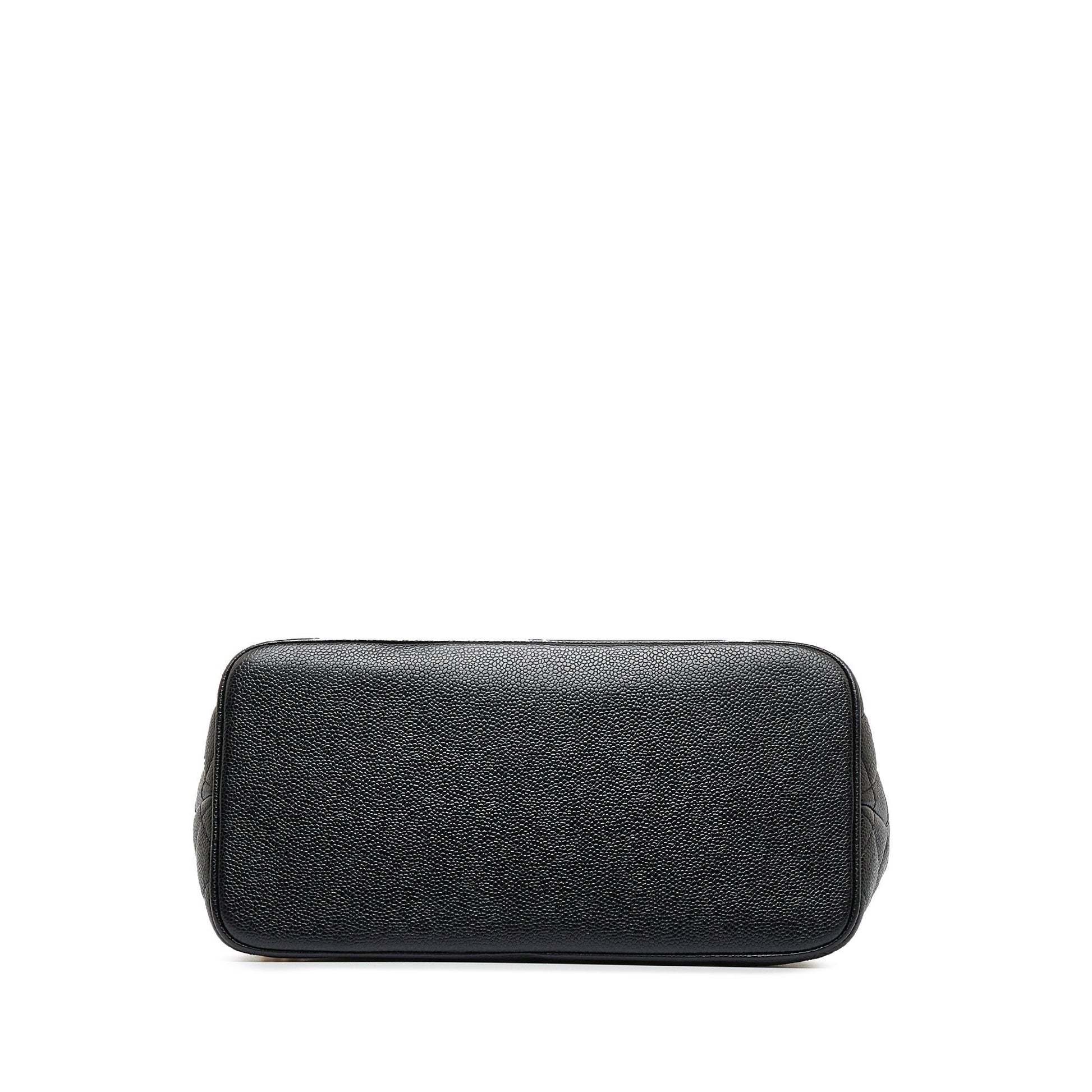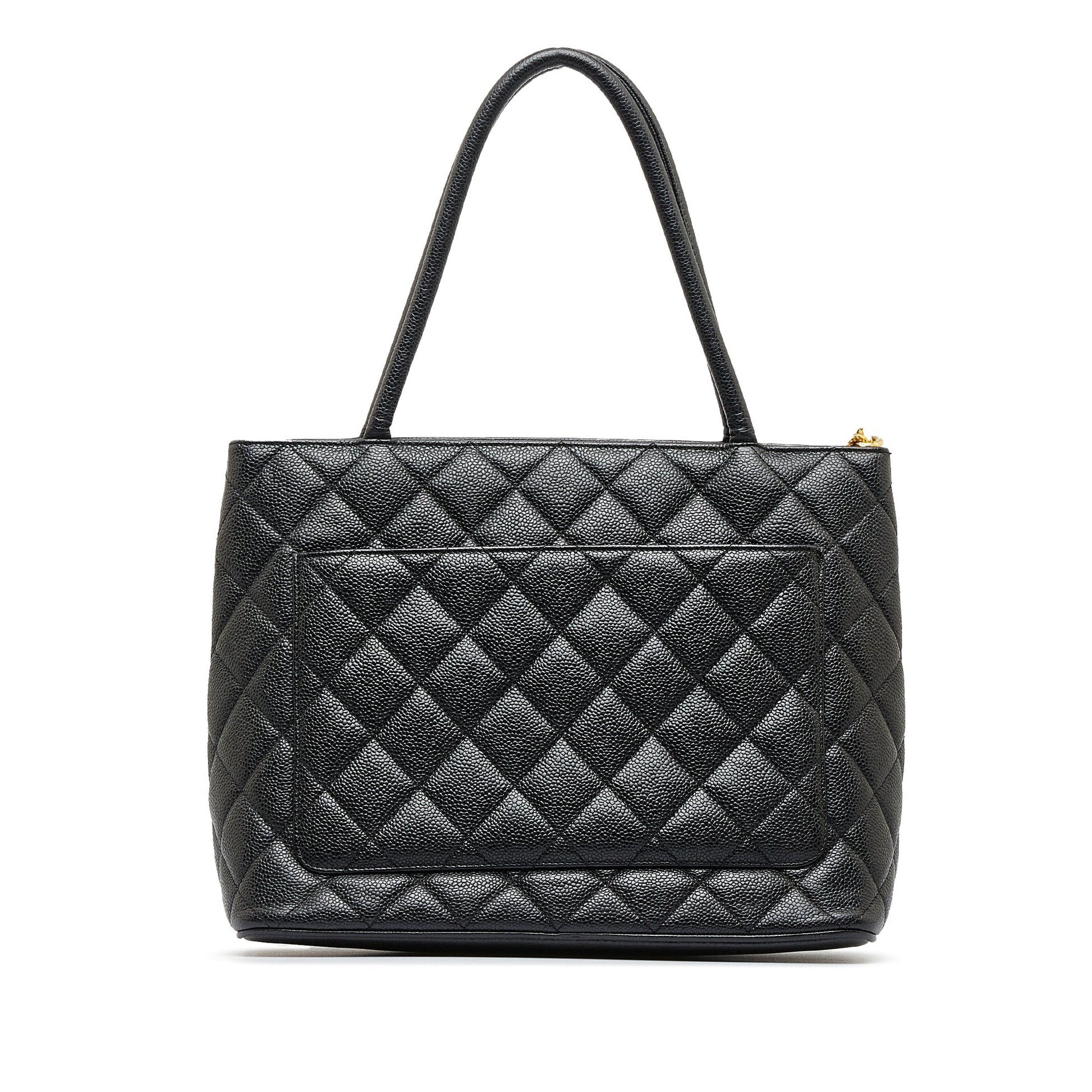Product Details: Black Chanel Caviar Medallion Tote Bag. The Medallion tote bag features a quilted caviar leather body, rolled leather handles, a top zip closure, an exterior back slip pocket, and interior zip and slip pockets. 9.1" L x 11" W x 5.5" D, 5.9" drop. Serial number 6289370.