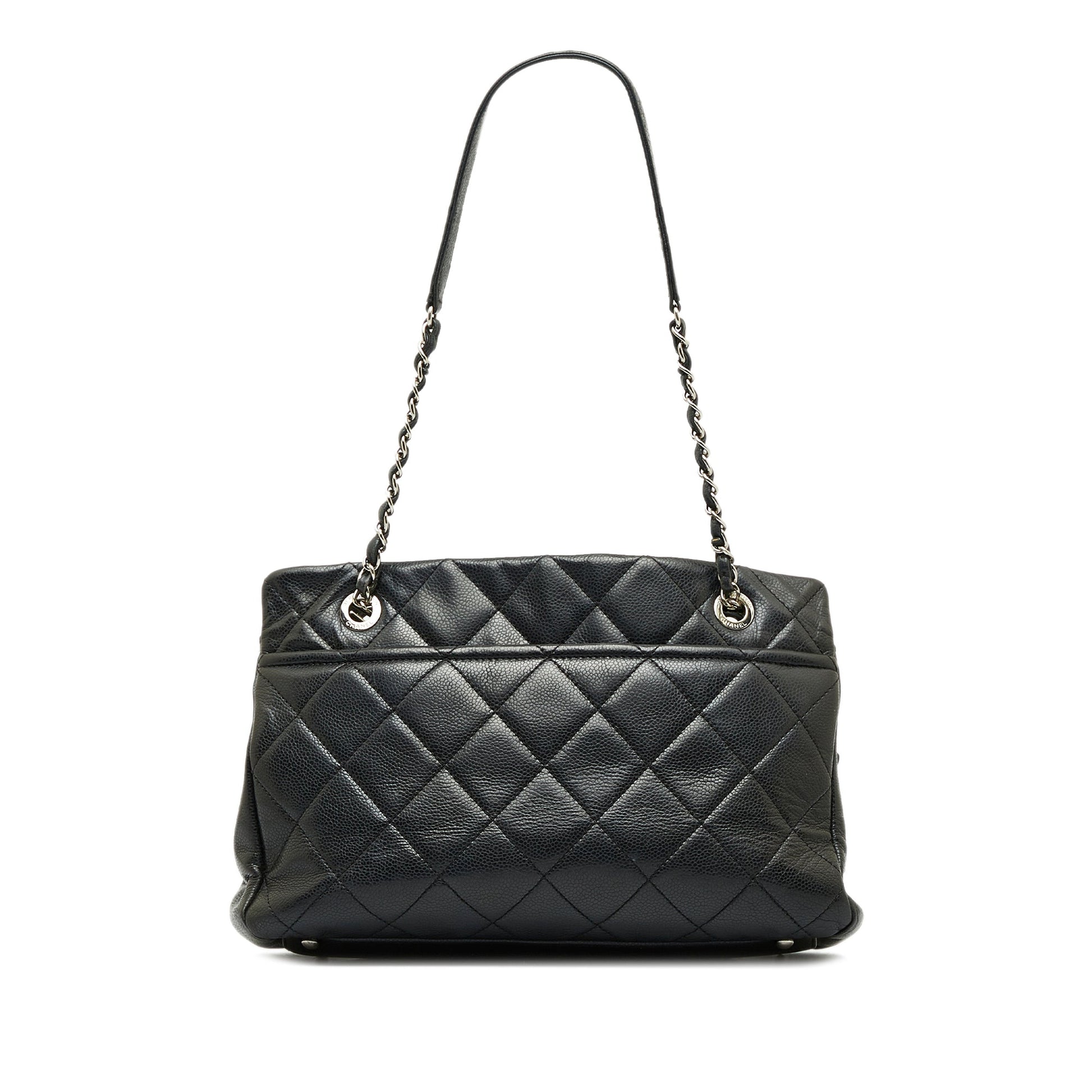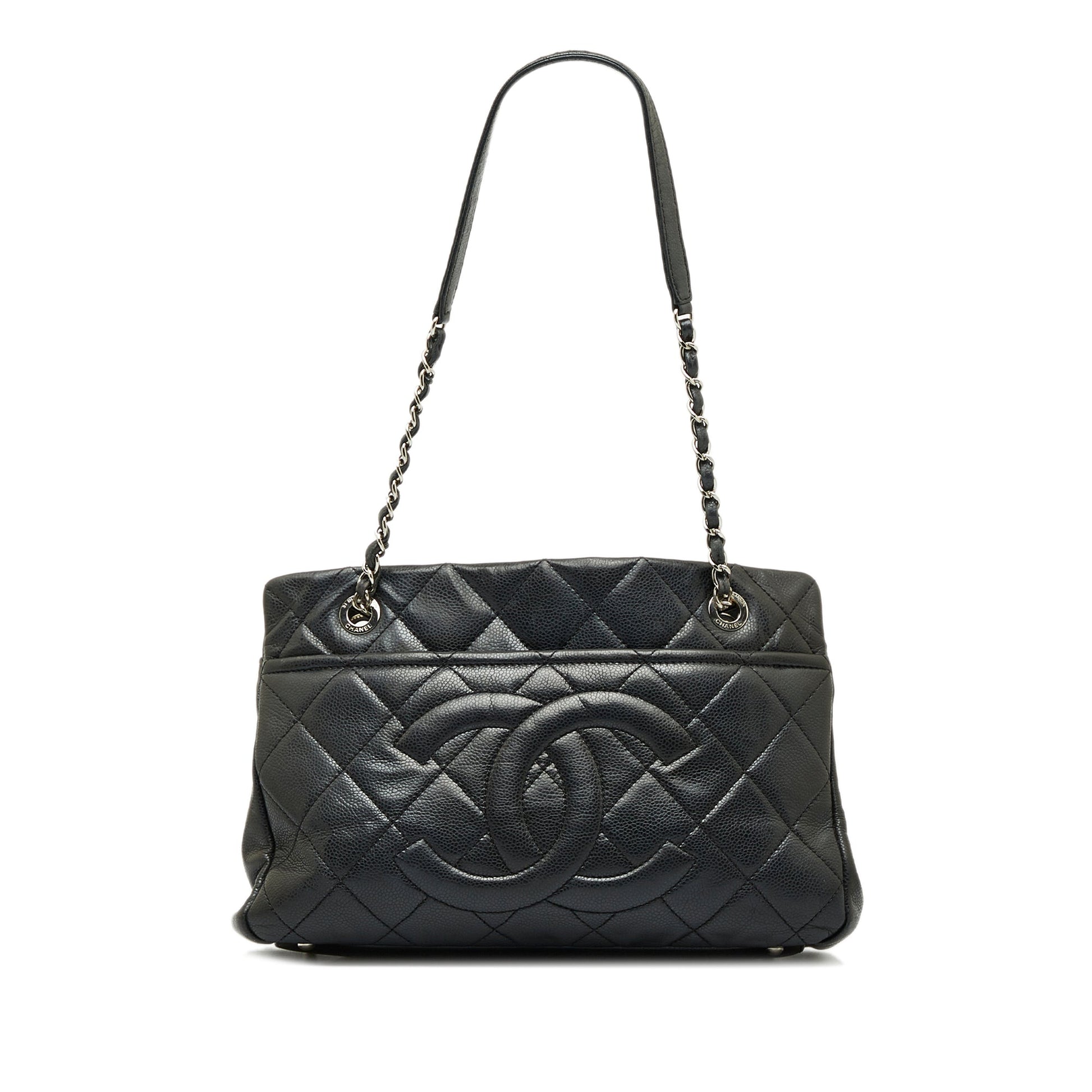 Product Details: Black Chanel CC Caviar Tote Bag. This tote bag features a quilted caviar leather body, leather woven chain straps, a top zip closure, an exterior slip pocket, and interior zip and slip pockets. 7.9" L x 13" W x 4.3" D, 11" drop. Serial number 18294568.
