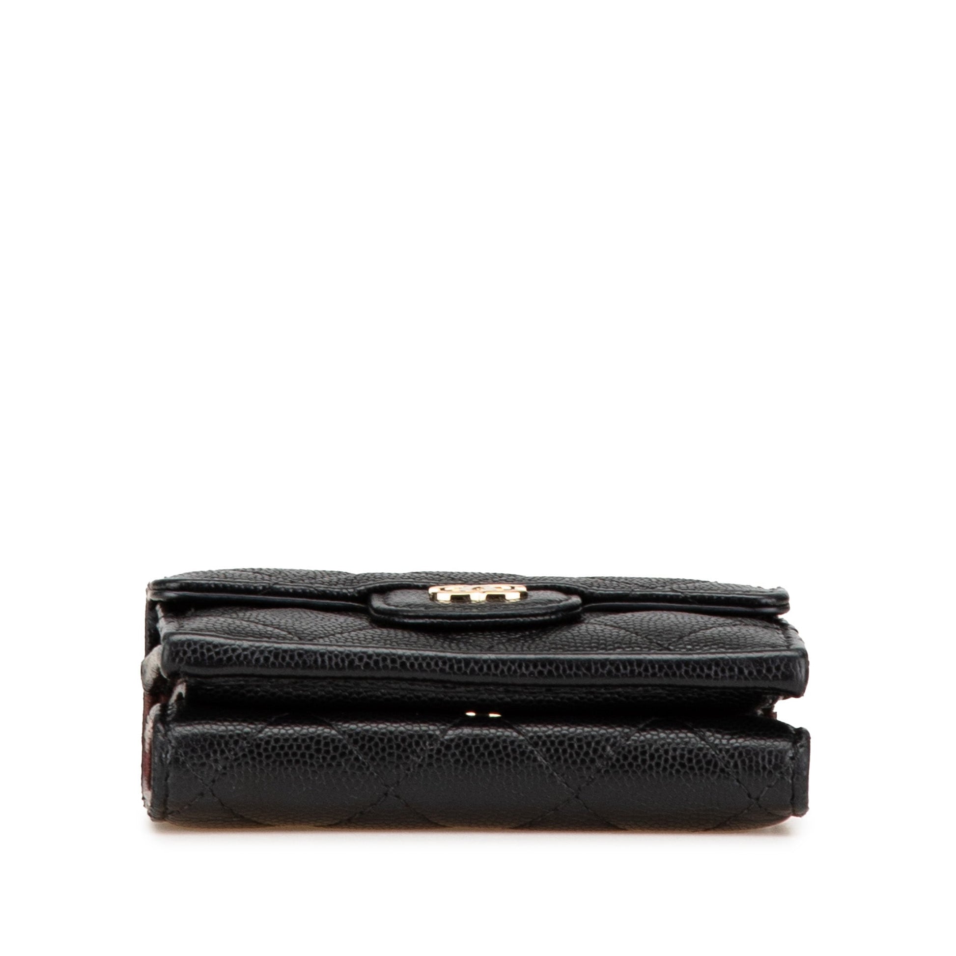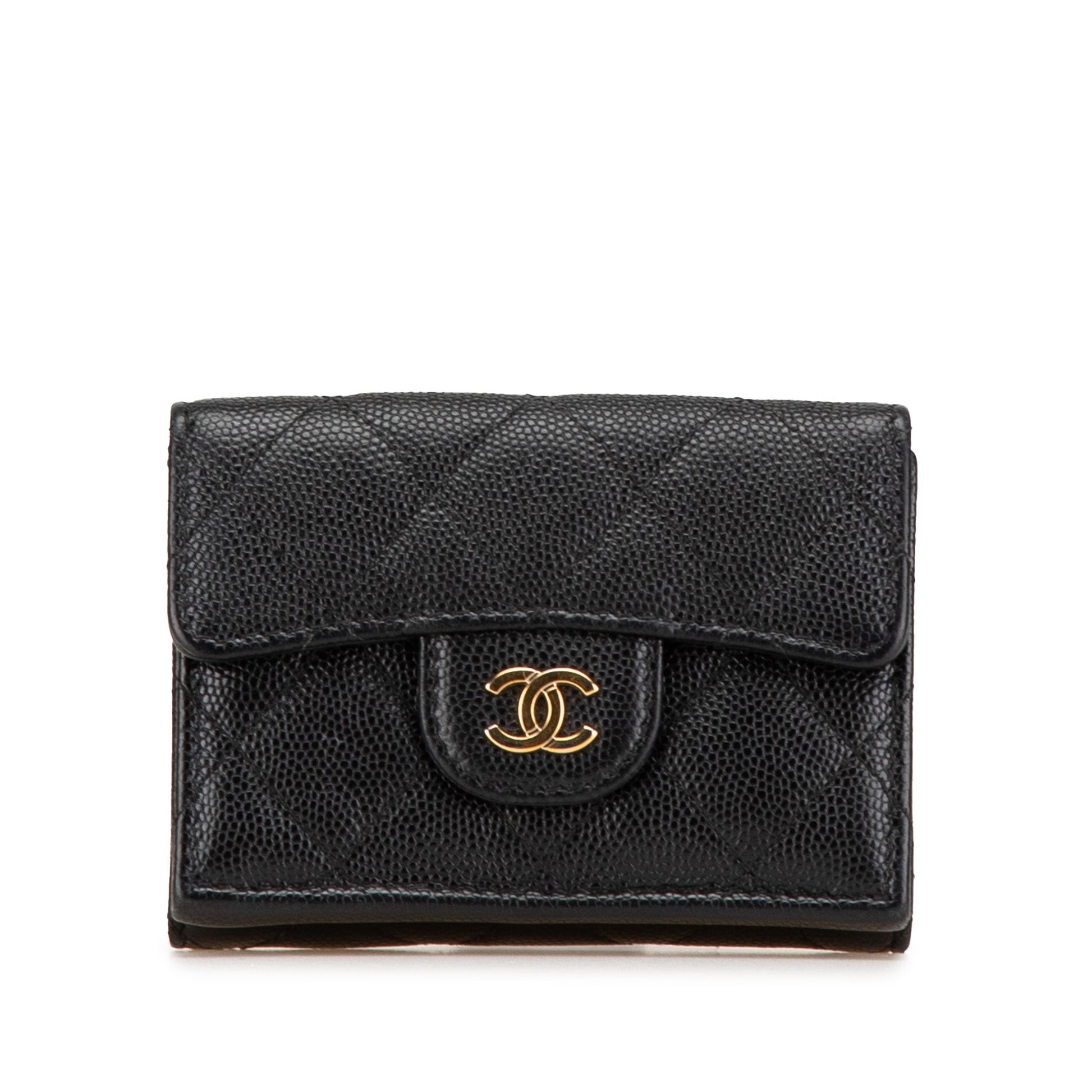 Product Details: Black Chanel CC Quilted Caviar Trifold Wallet. This wallet features a quilted caviar leather body, a snap button closure, an exterior flap compartment, and interior slip pockets. 2.8" L x 3.9" W x 1.4" D. Serial number 26774241.