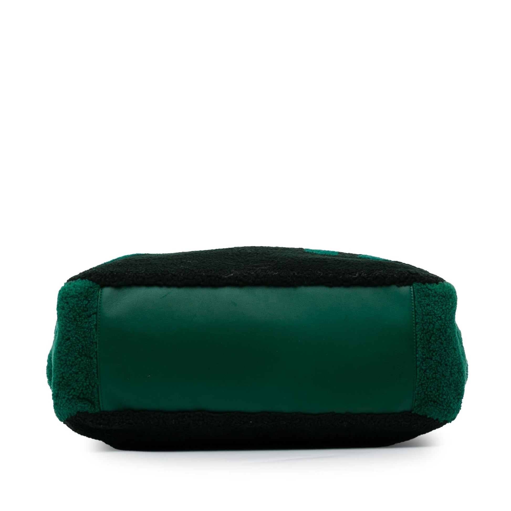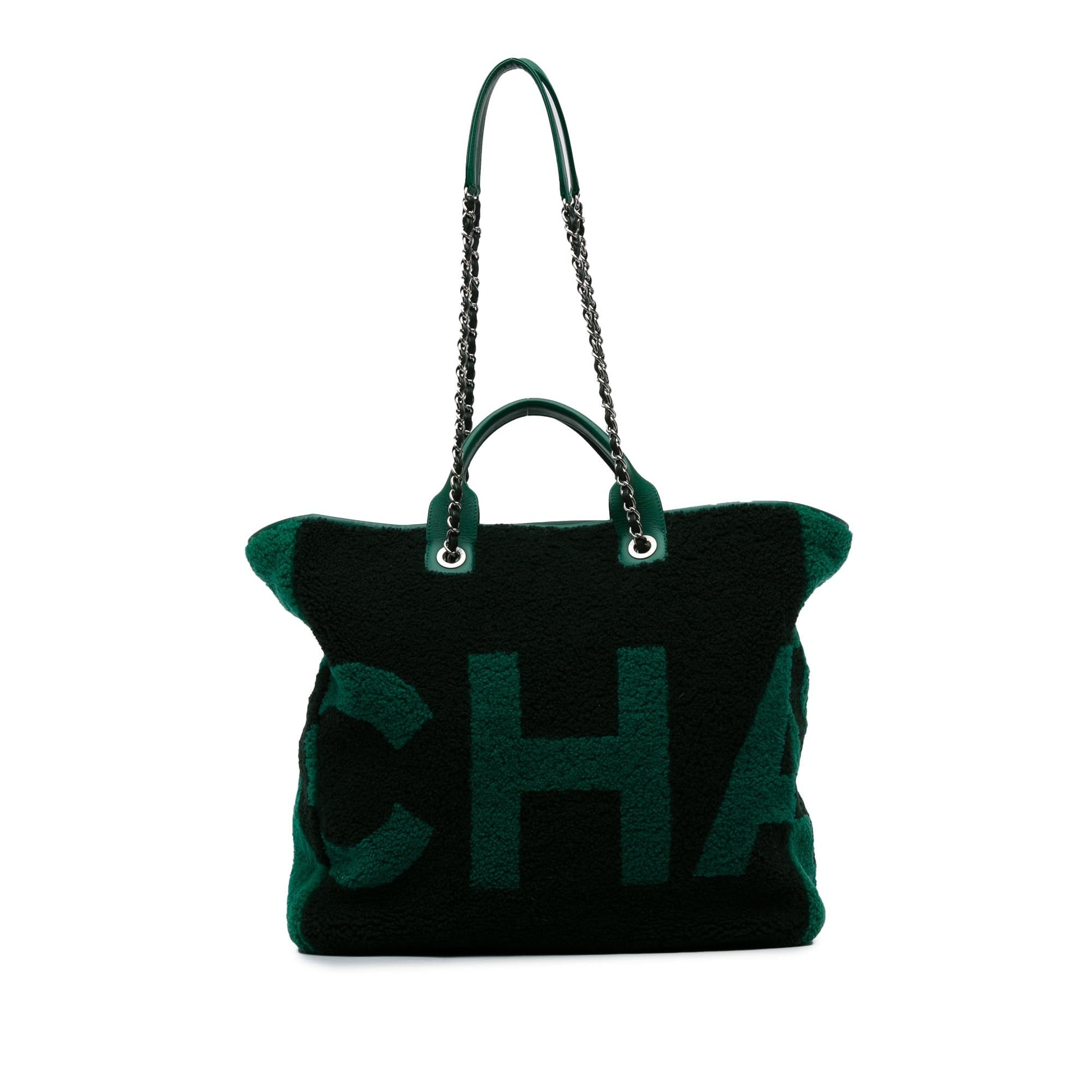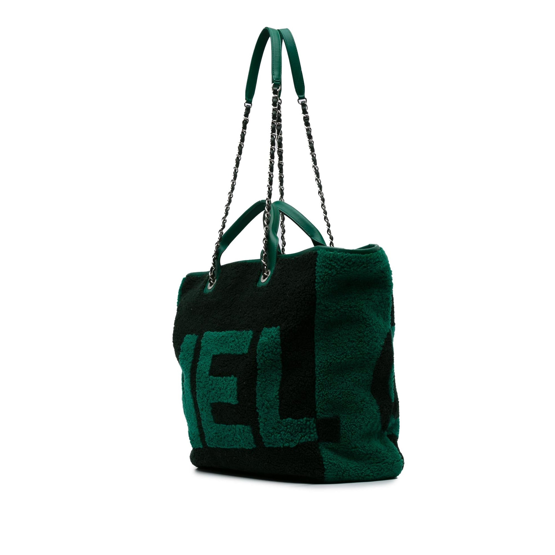 Product Details: Black Chanel Large Shearling and Calfskin Deauville Shopping Tote Satchel. This satchel features a shearling body, flat leather handles, leather woven chain straps, an open top with a magnetic closure, and interior zip pockets. 14.6" L x 15.4" W x 5.1" D, 3.9" drop. Serial number 26930039.