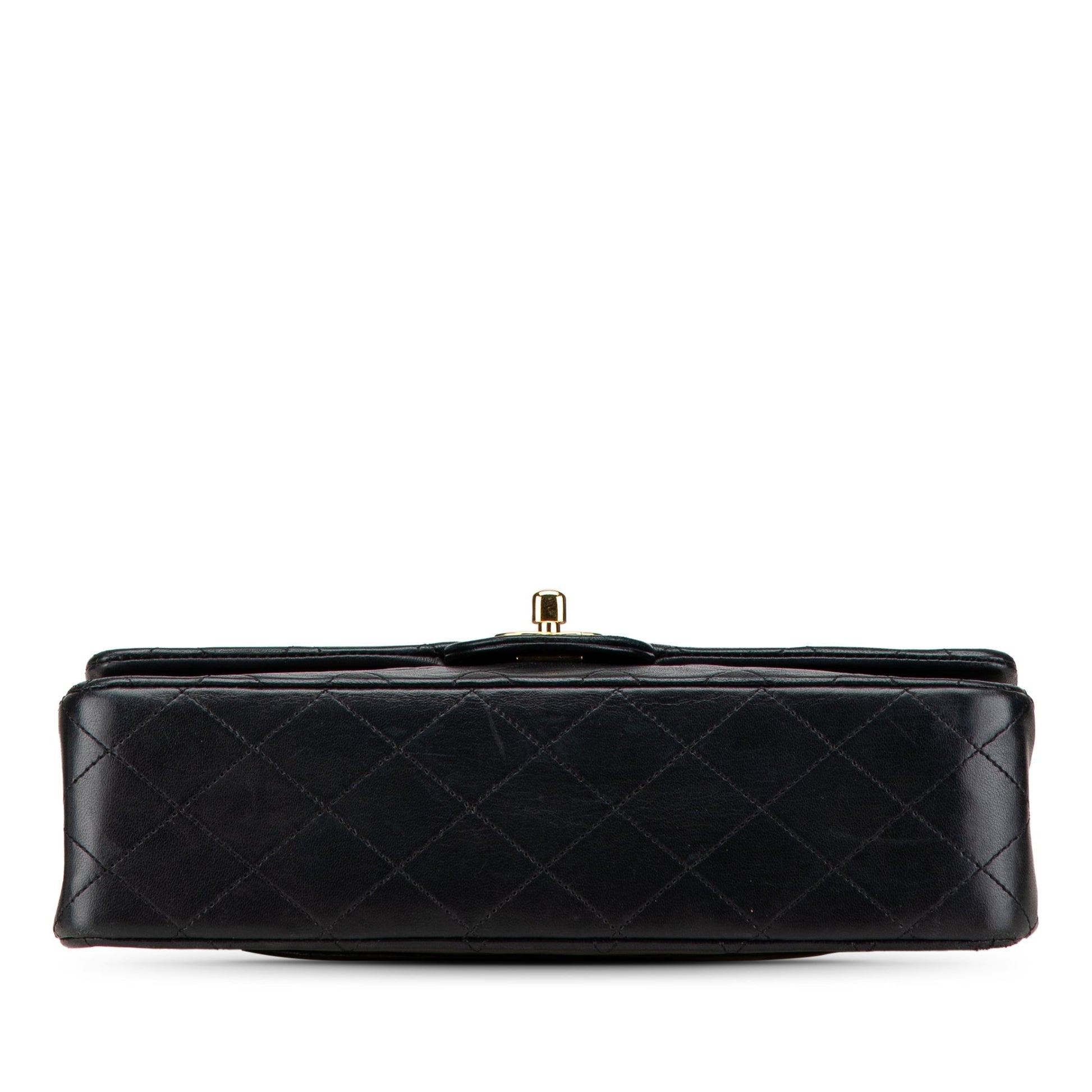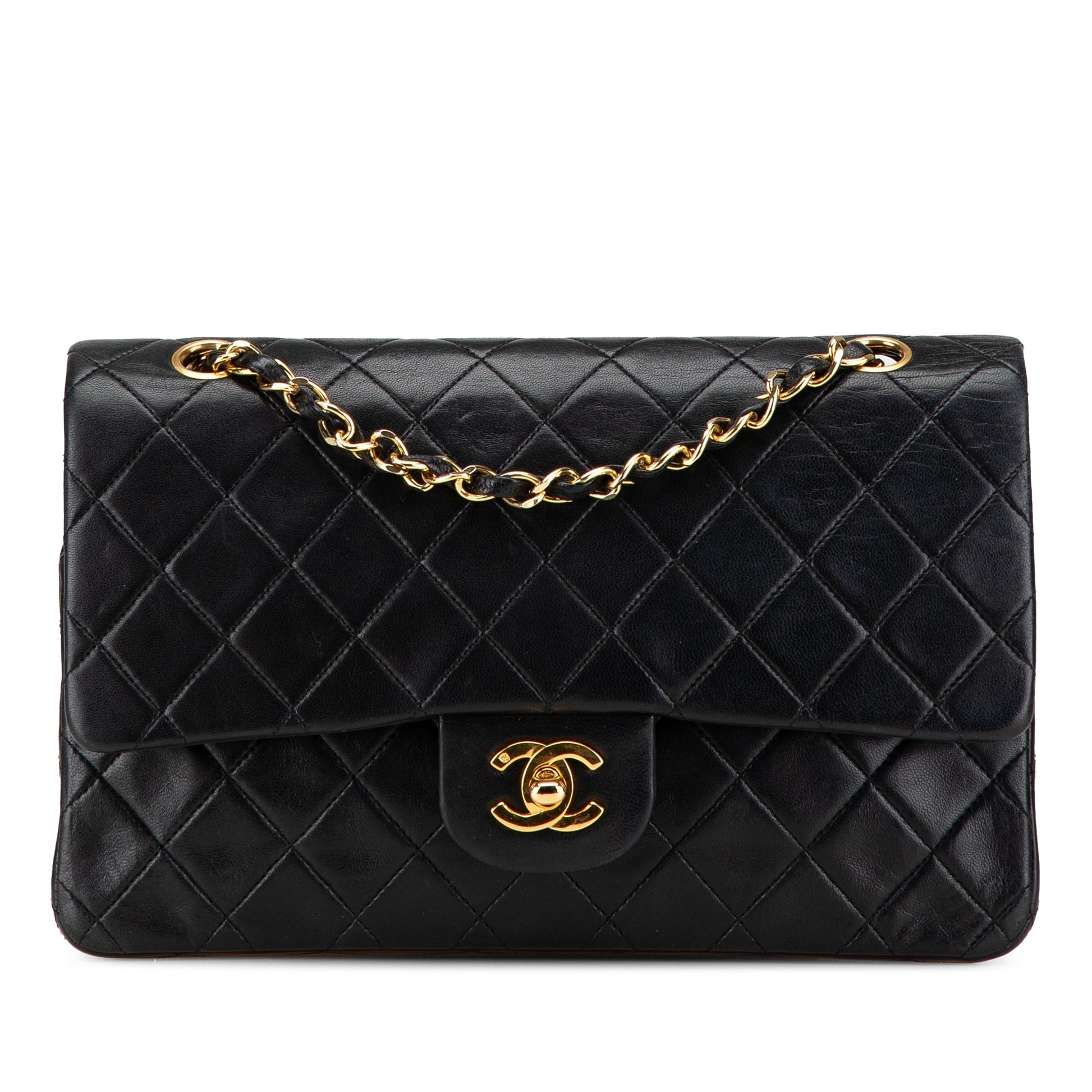 Product Details: Black Chanel Medium Classic Lambskin Double Flap Shoulder Bag. This shoulder bag features a quilted lambskin body, leather woven chain link straps, double front flaps with interlocking Cs and a twist lock closure, an exterior back slip pocket, and interior zip and slip pockets. 5.9" L x 10.2" W x 2.8" D, 9.1" drop. Serial number 1xxxxxx.