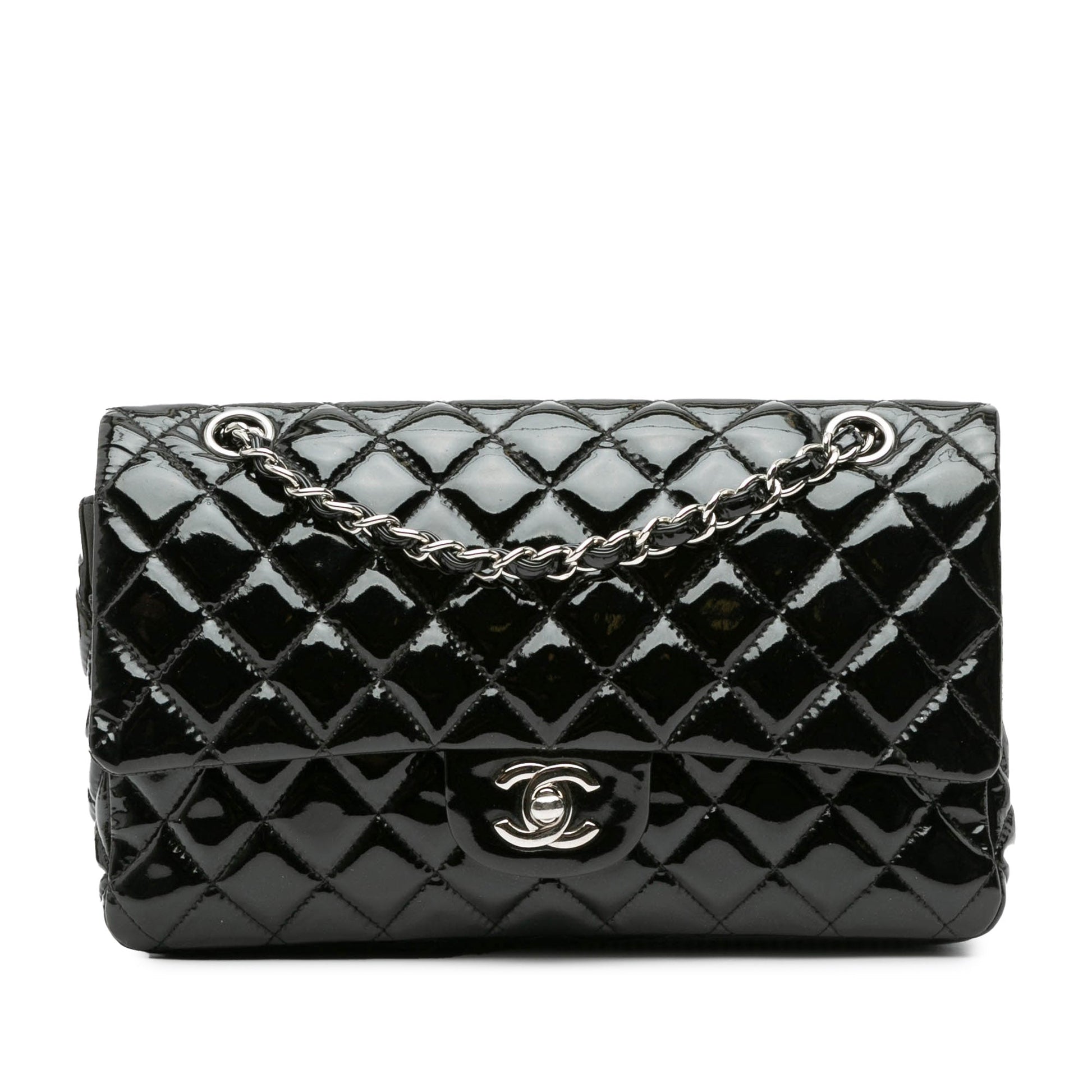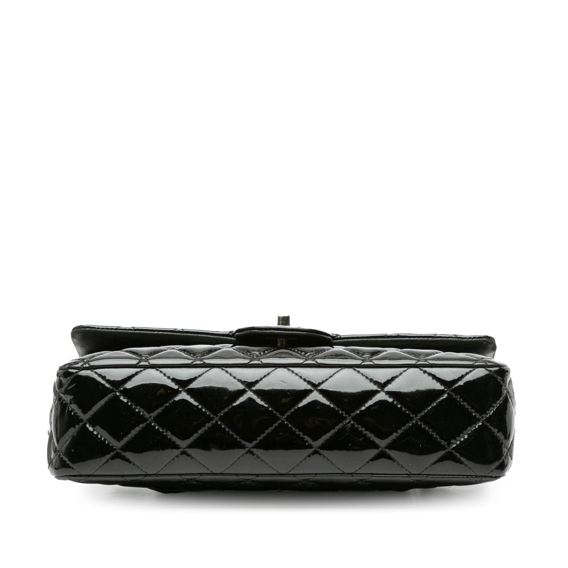 Product Details: Black Chanel Medium Classic Patent Double Flap Shoulder Bag. This shoulder bag features a quilted patent leather body, leather woven chain shoulder straps, double front flaps with CC turn-lock closure, an exterior back slip pocket, and interior slip pockets. 6.3" L x 9.8" W x 2.4" D, 9.4" drop. Serial number 15429192.