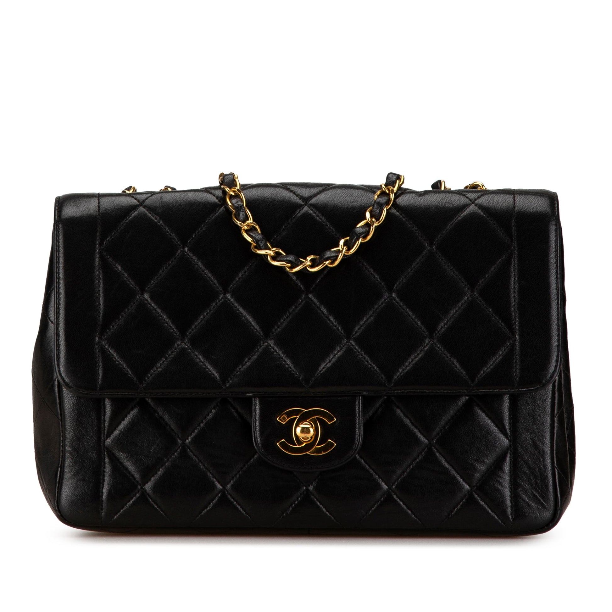 Product Details: Black Chanel Medium Quilted Lambskin Border Single Flap Shoulder Bag. This shoulder bag features a quilted lambskin leather body, a leather woven chain strap, a front flap with CC turnlock closure, and interior zip and slip pockets. 6.9" L x 9.8" W x 2.6" D. Serial number 3486848.