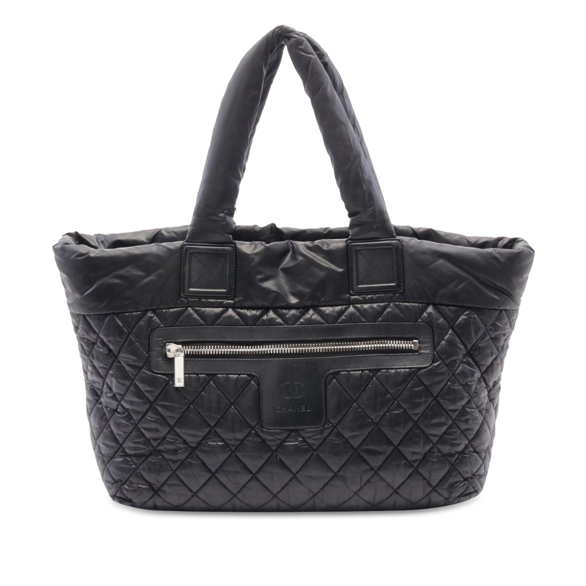 Product Details: Black Chanel Nylon Coco Cocoon Tote. The Coco Cocoon features a quilted nylon body, rolled handles, a top zip closure, an exterior front zip pocket, and an interior zip pocket. 11.4" L x 15" W x 7.1" D, 7.1" drop. Serial number 18464176.