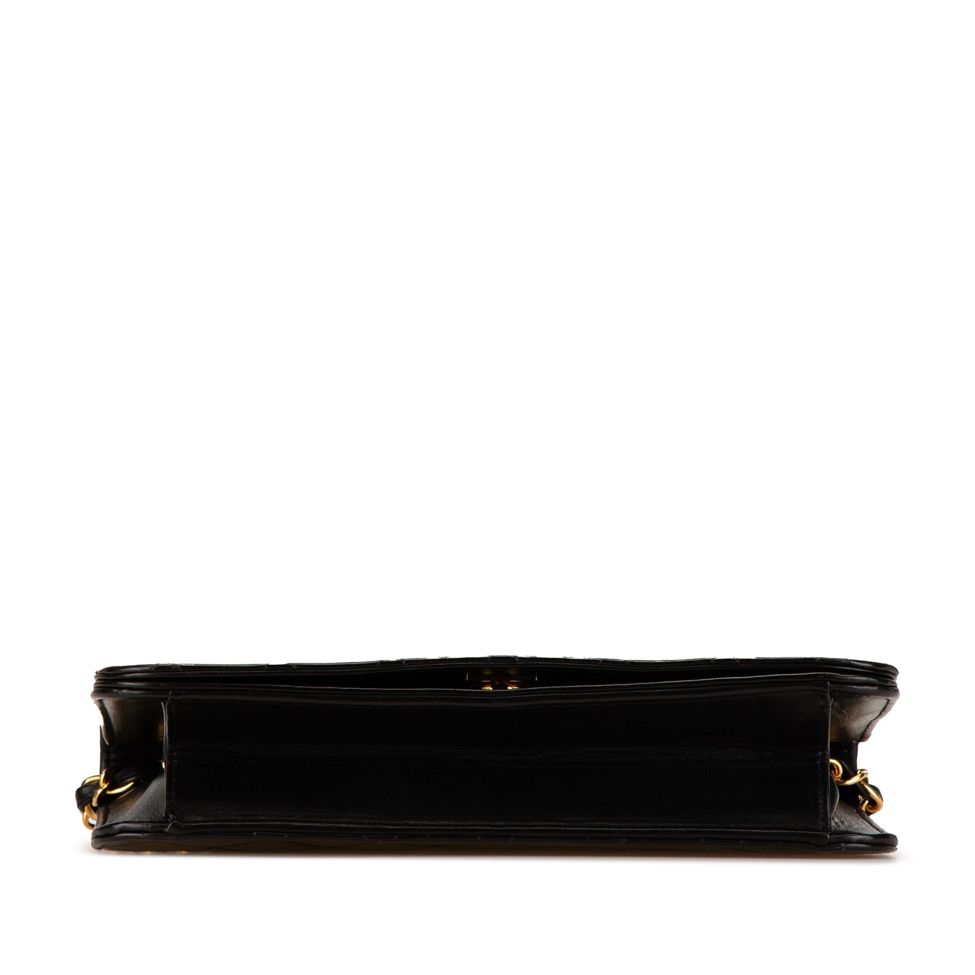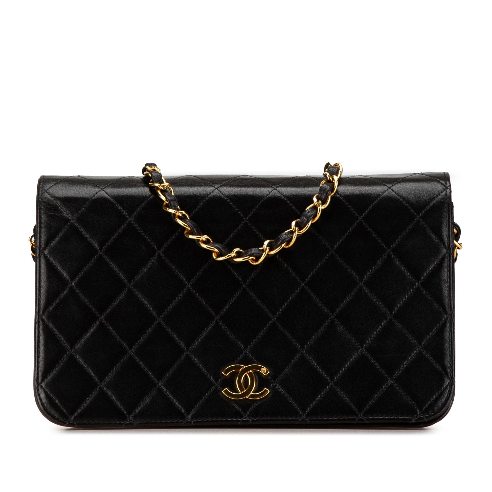 Product Details: Black Chanel Quilted Lambskin CC Full Single Flap Crossbody Bag. This crossbody bag features a quilted lambskin leather body, a leather woven chain link strap, a front flap with CC, and an interior slip pocket. 5.9" L x 9.3" W x 1.8" D. Serial number 3675402.