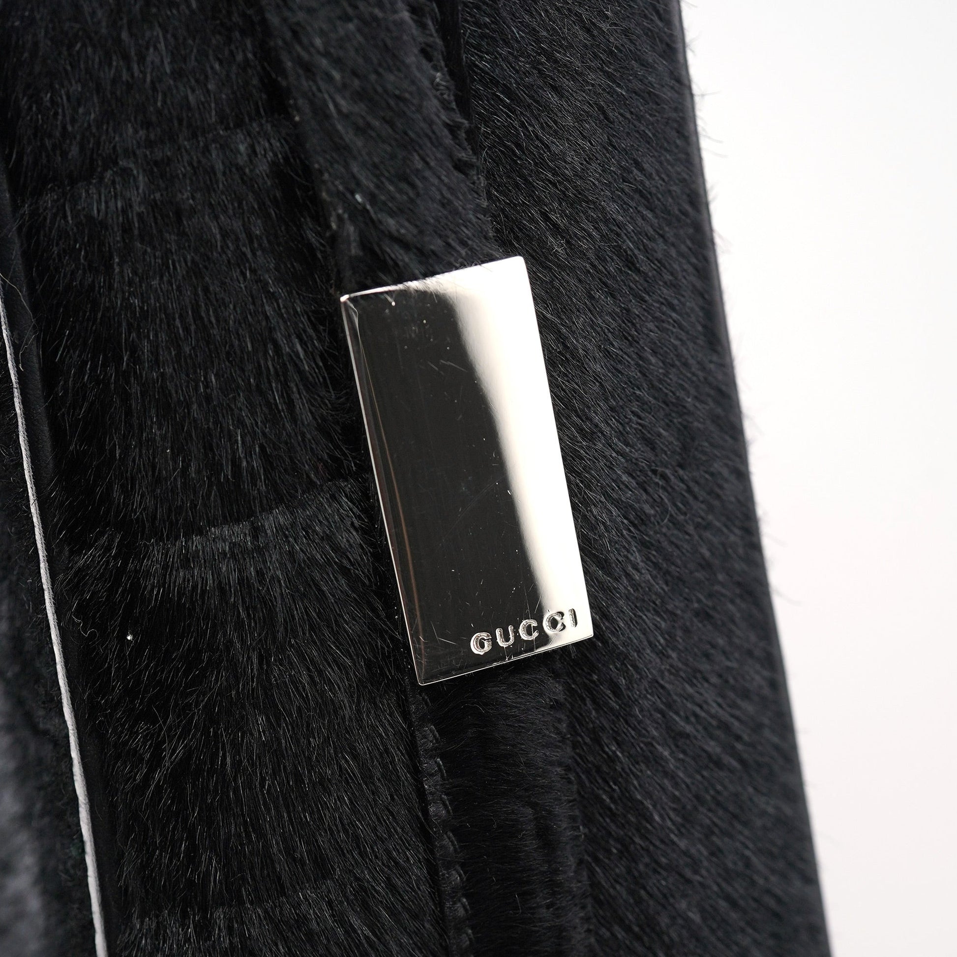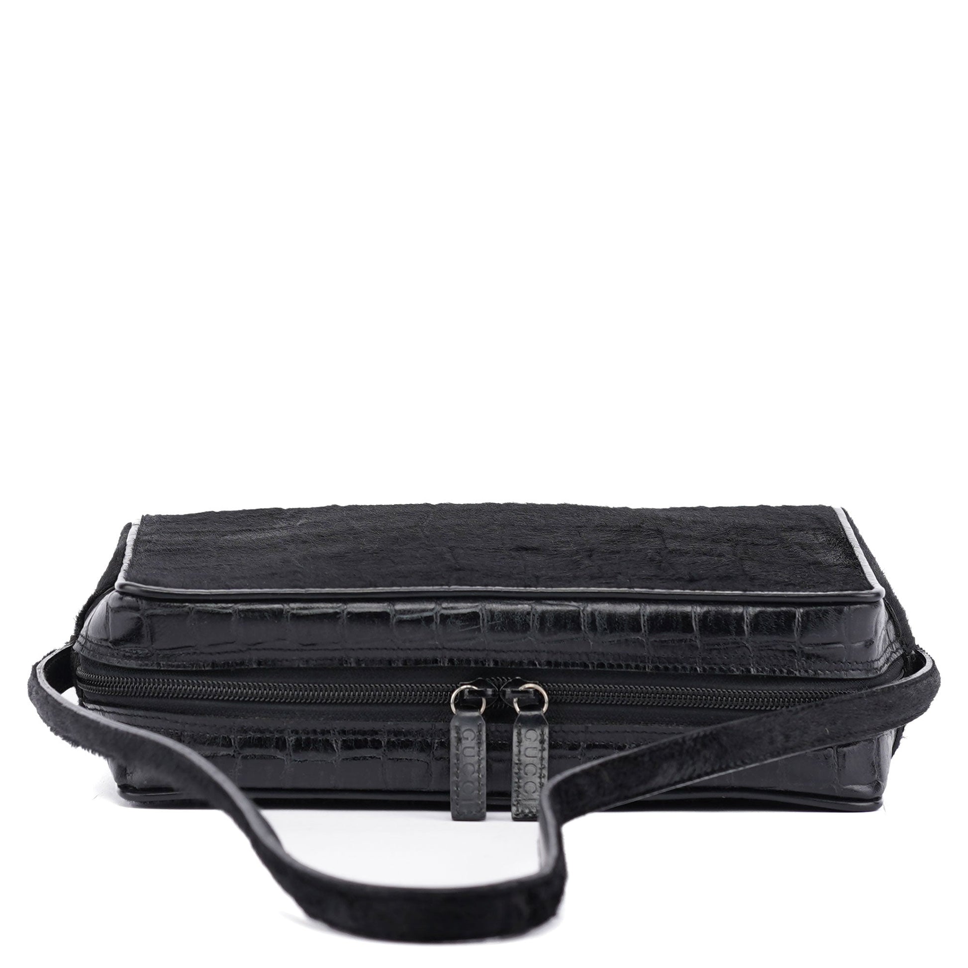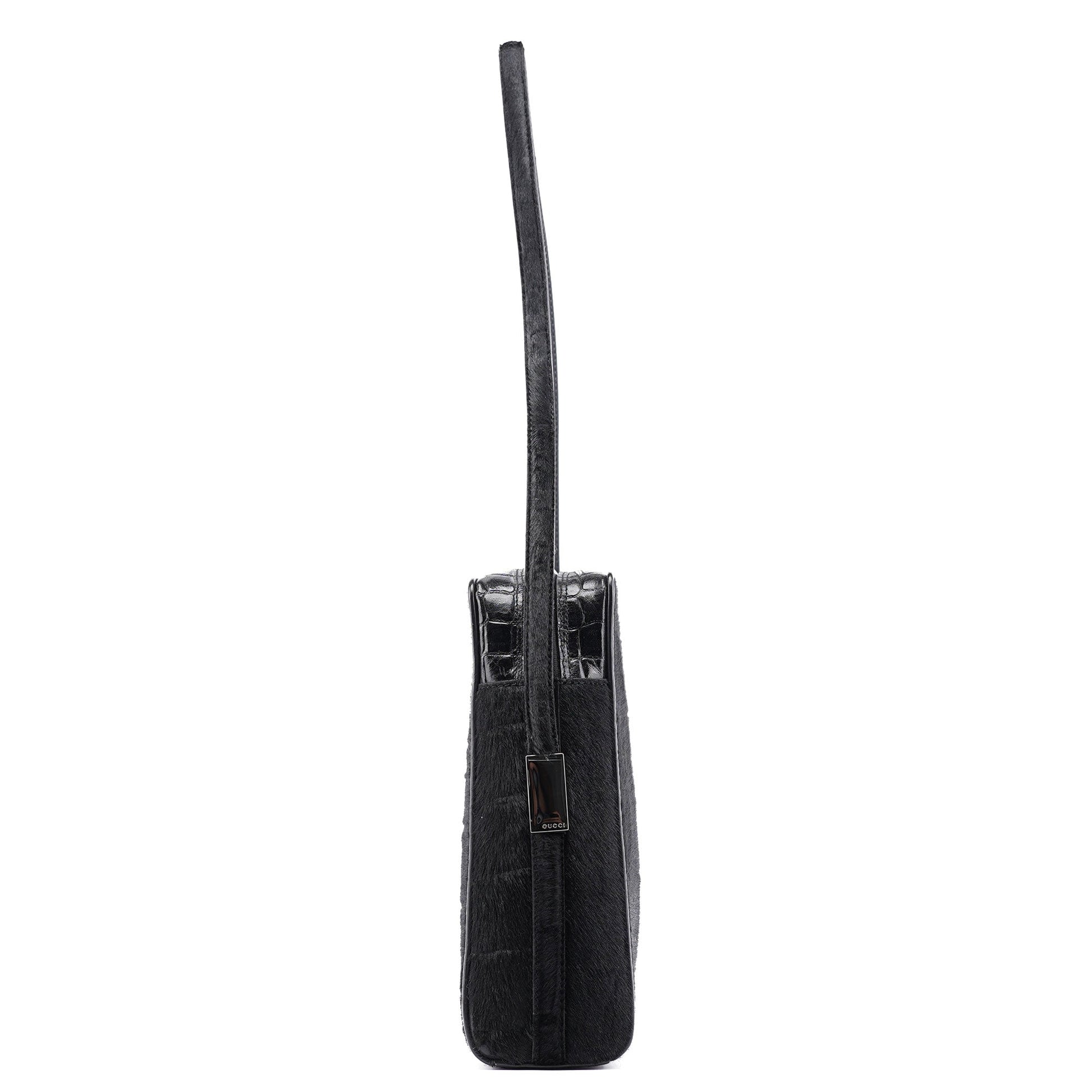 Designed by Tom Ford in the late 1990s, this Gucci shoulder bag with a zipper closure is a true statement of luxury. Handcrafted from black ponyhair with croc embossing and tonal calfskin leather, it exudes opulence. Silver-tone hardware engraved with the Gucci logo adds a refined touch. The interior, lined in supple calfskin leather, seamlessly combines elegance and functionality.