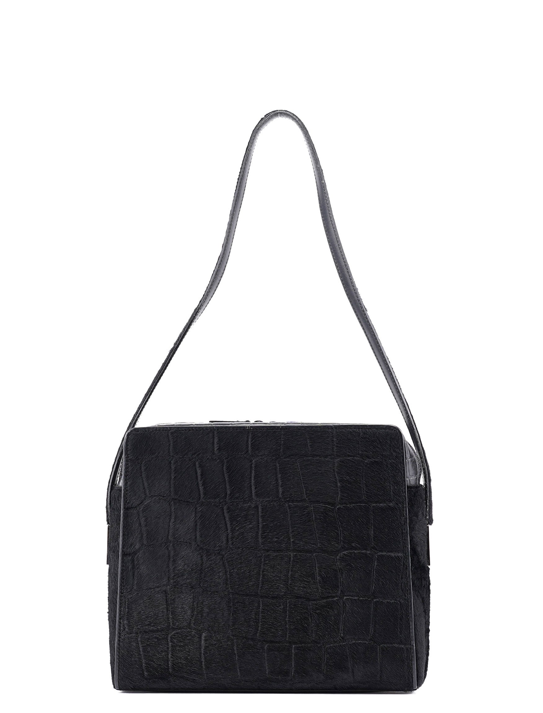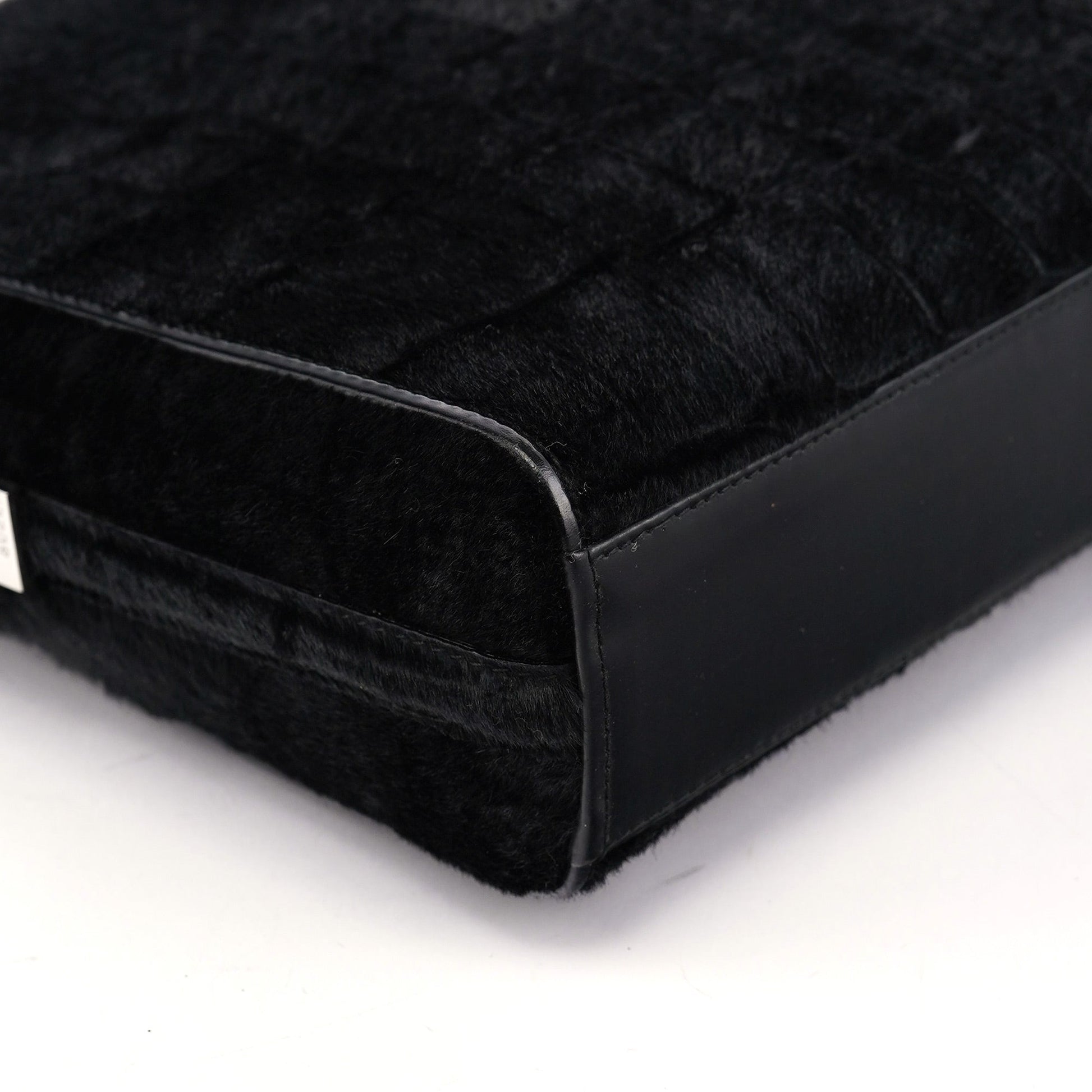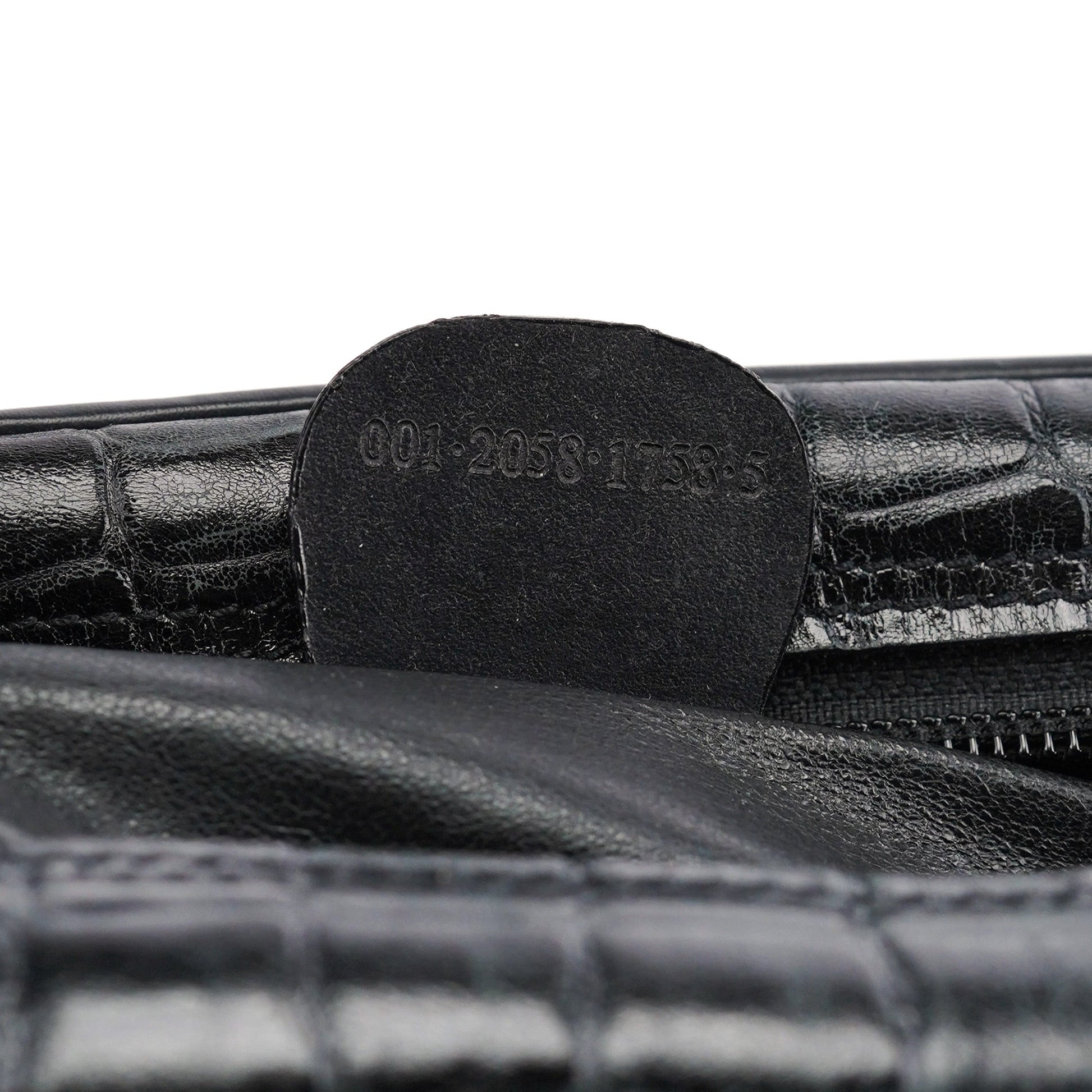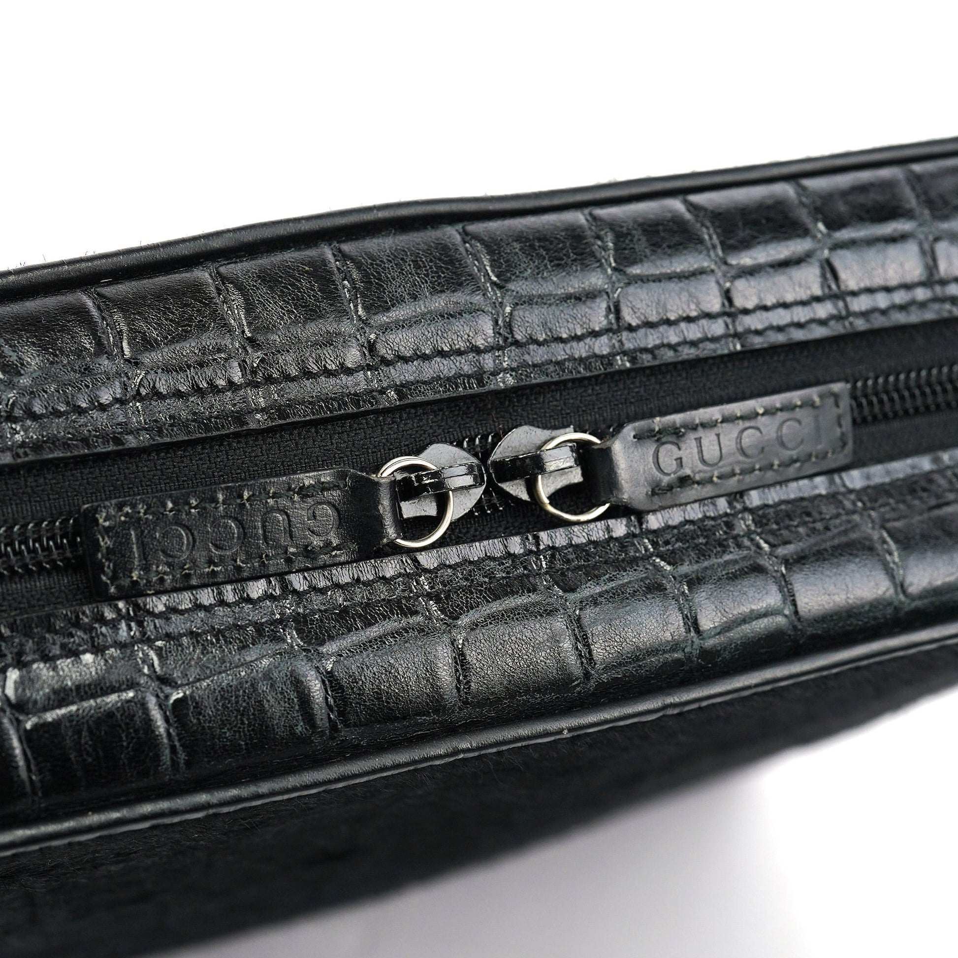 Designed by Tom Ford in the late 1990s, this Gucci shoulder bag with a zipper closure is a true statement of luxury. Handcrafted from black ponyhair with croc embossing and tonal calfskin leather, it exudes opulence. Silver-tone hardware engraved with the Gucci logo adds a refined touch. The interior, lined in supple calfskin leather, seamlessly combines elegance and functionality.