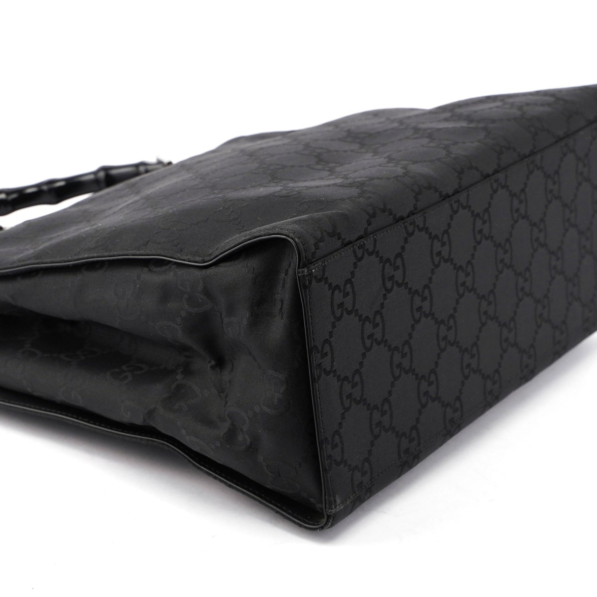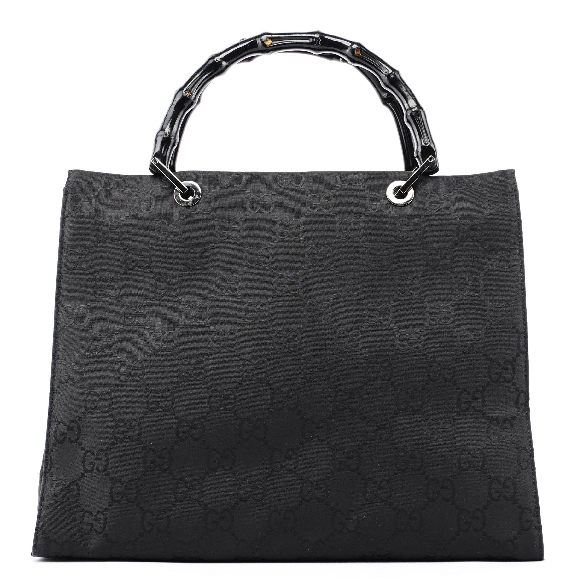 Designed by Tom Ford in the late 1990s, this Gucci Bamboo GG tote bag features two elegant black bamboo handles and silver-tone hardware. Crafted with the iconic GG monogram canvas, it offers three interior compartments lined with satin, including an interior zipper pocket for organized storage, blending luxurious design with practical functionality.