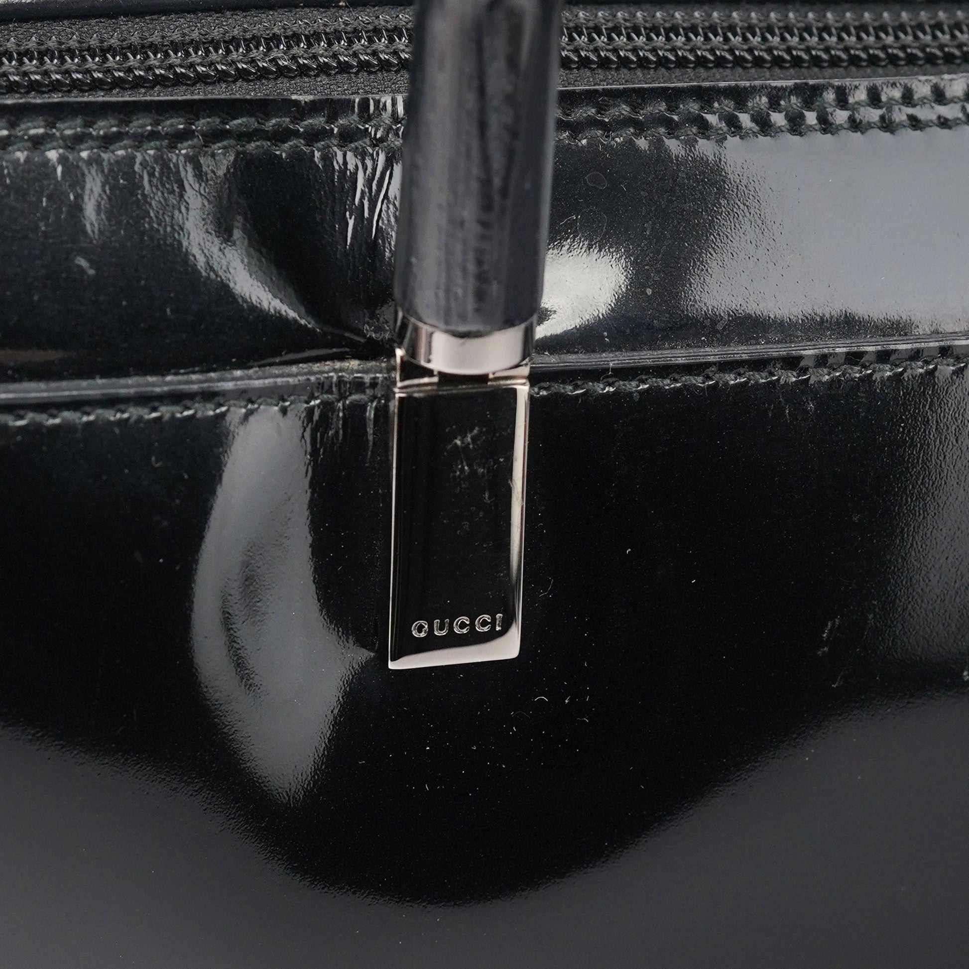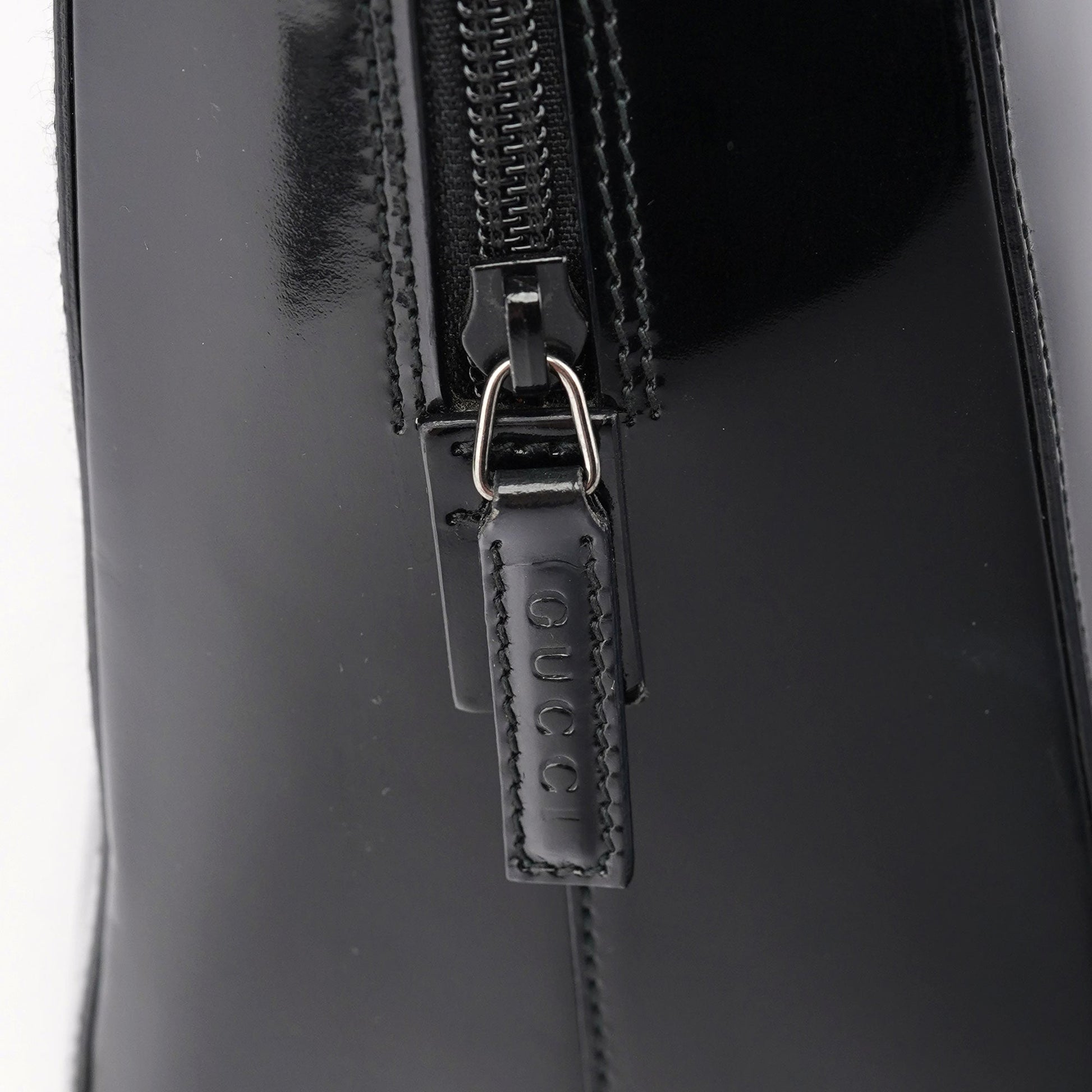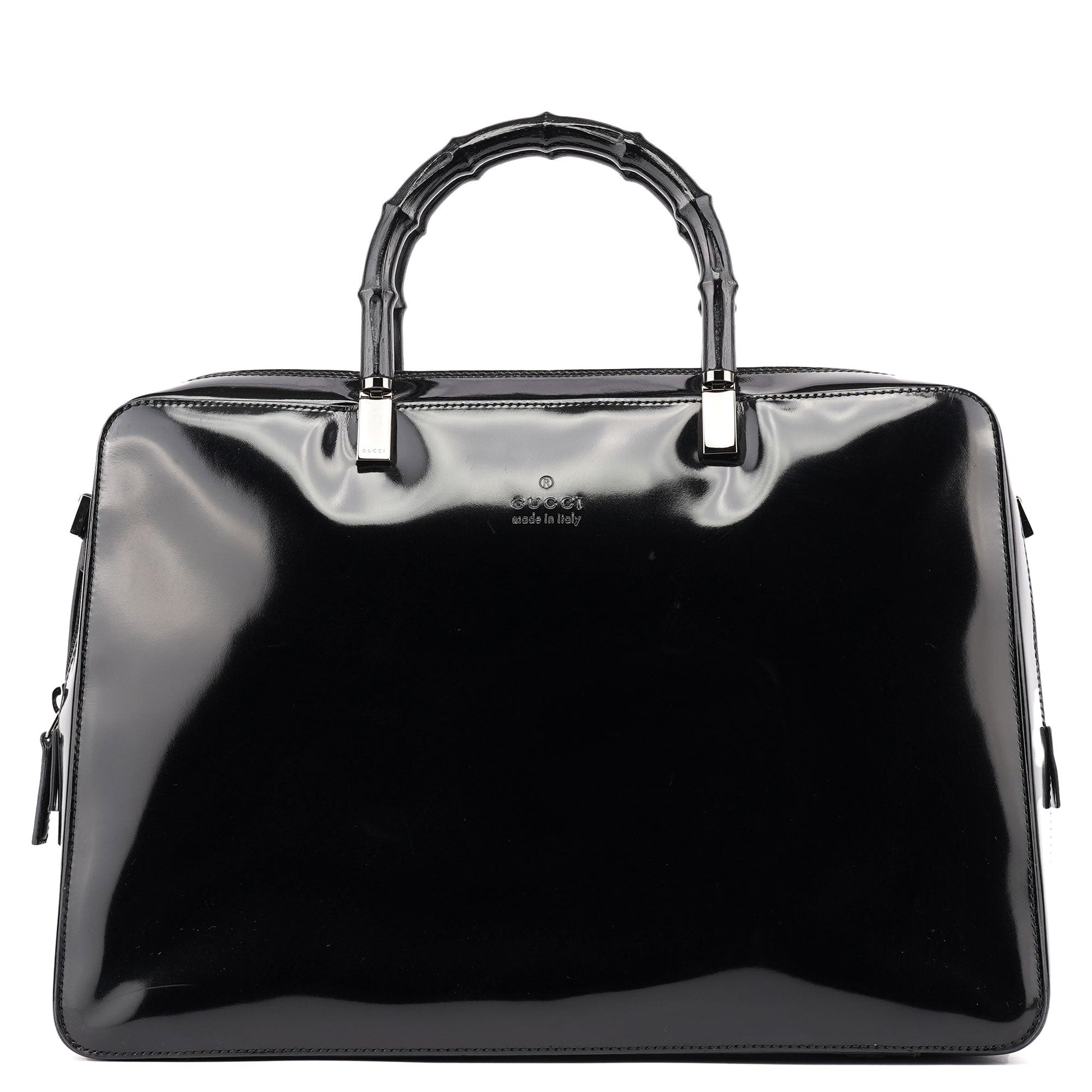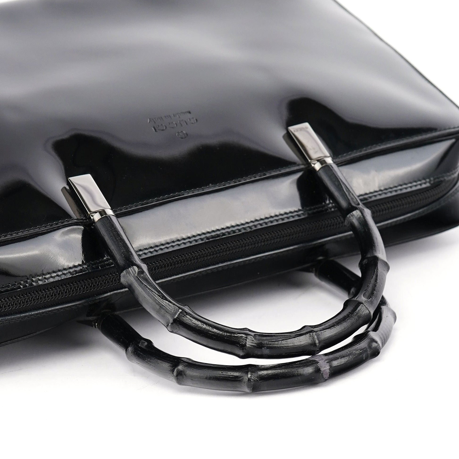 Handcrafted from black patent leather, this Gucci Bamboo tote by Tom Ford from the late 1990s features silver-tone hardware, two gloss black bamboo handles, provisions to add a shoulder strap and a zipper closure. The interior is lined in satin with an interior zipper pocket, and the Gucci logo is embossed at the front, showcasing timeless elegance.