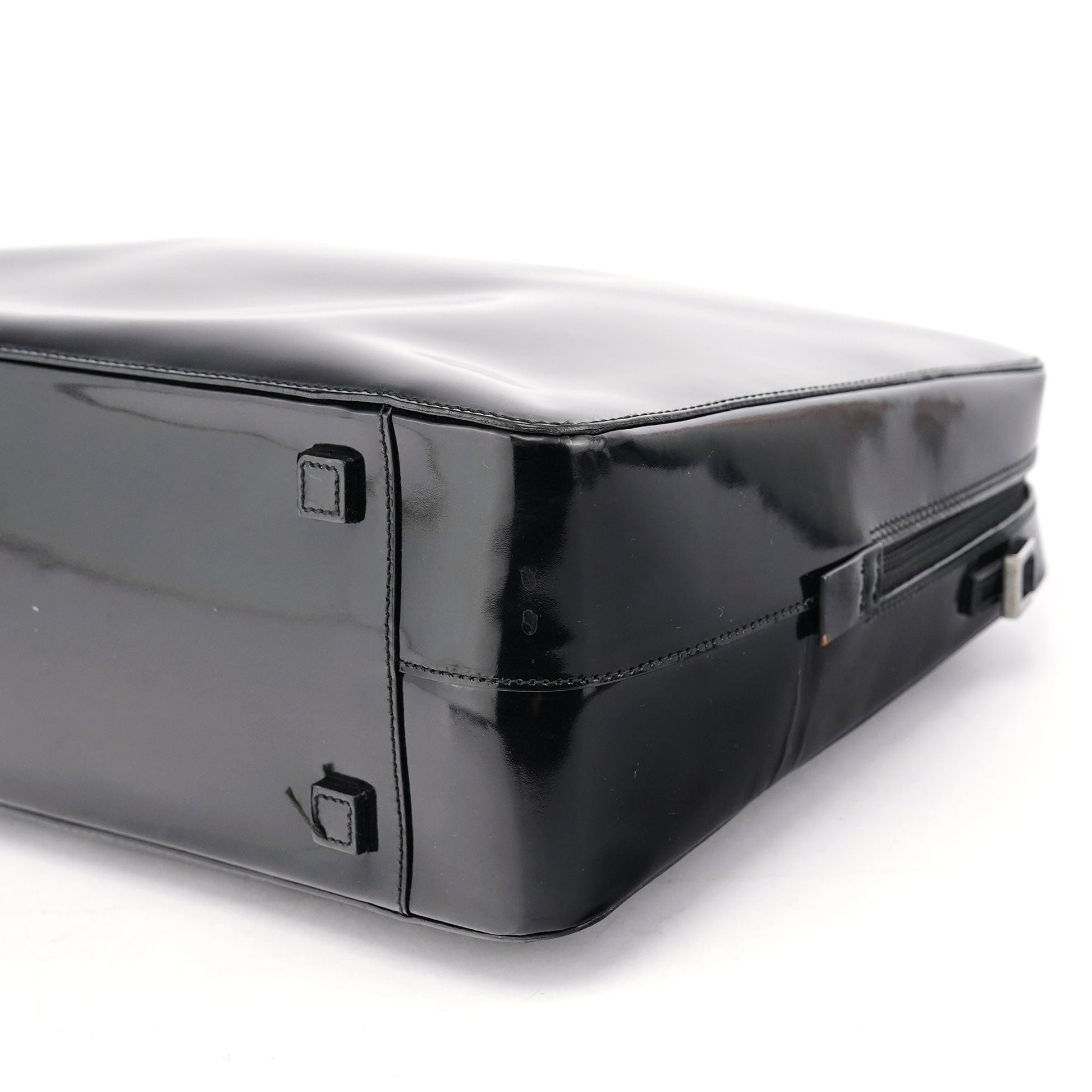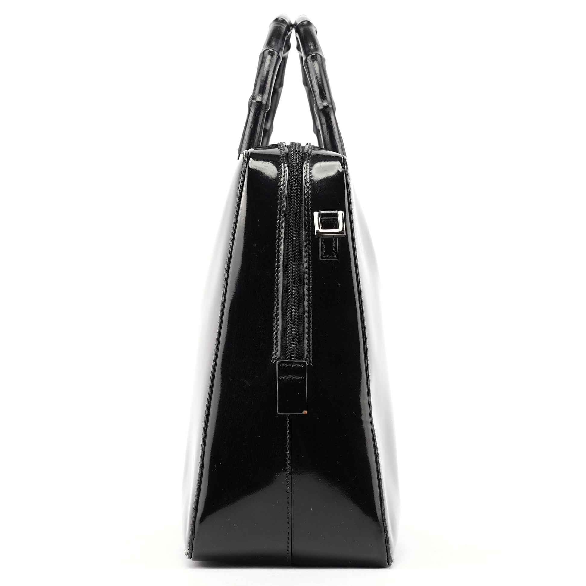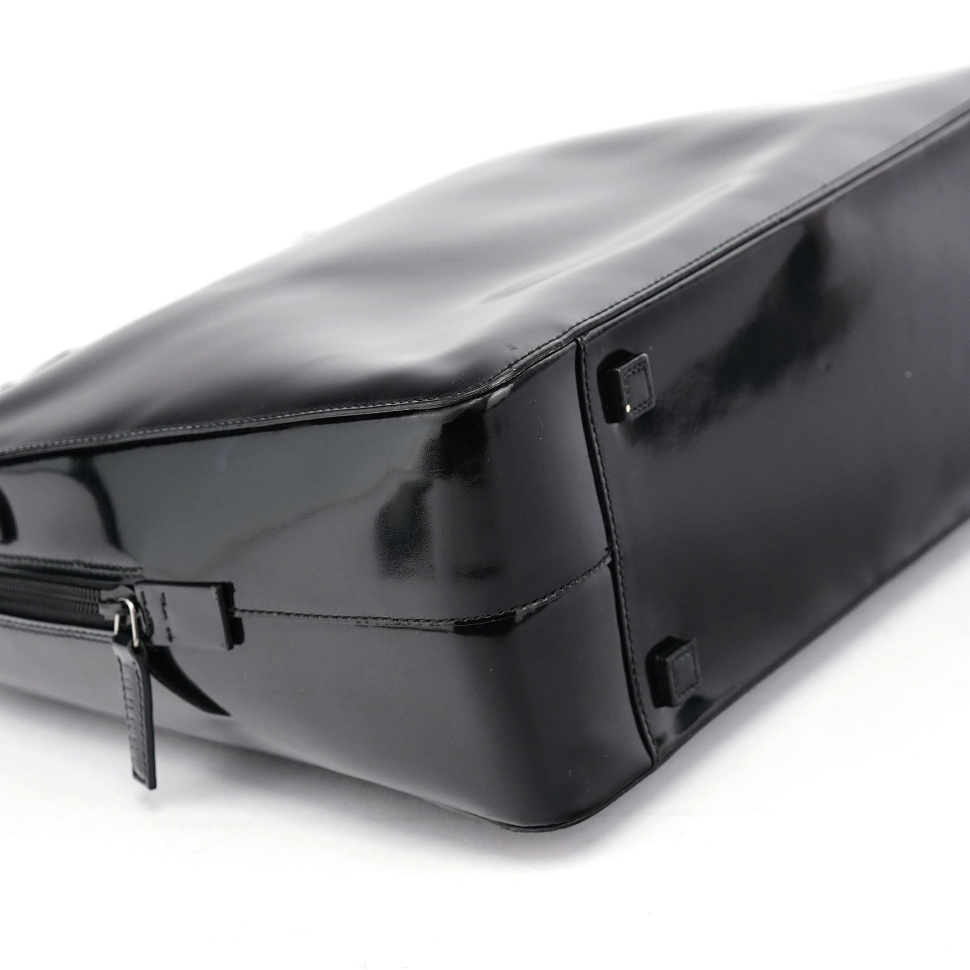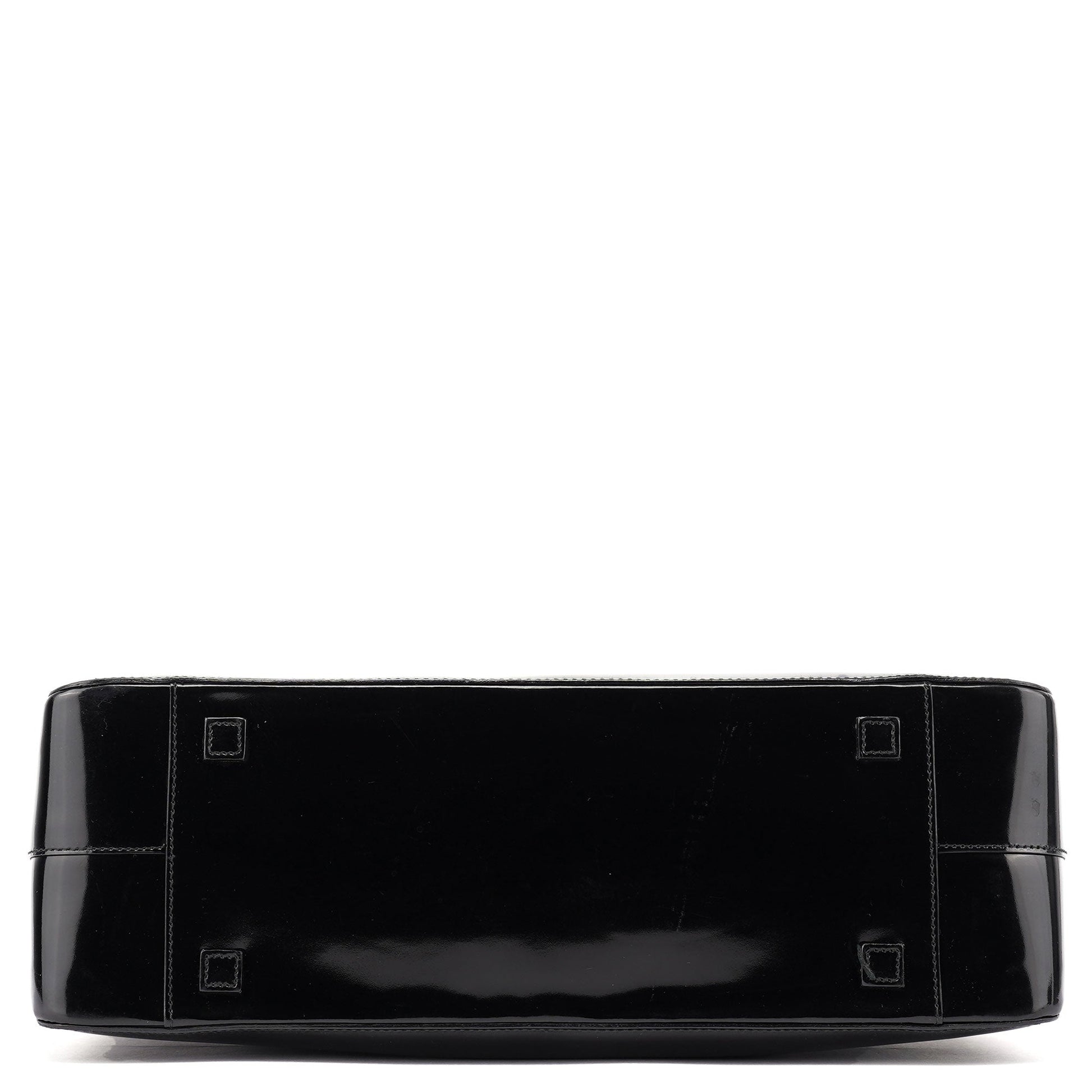 Handcrafted from black patent leather, this Gucci Bamboo tote by Tom Ford from the late 1990s features silver-tone hardware, two gloss black bamboo handles, provisions to add a shoulder strap and a zipper closure. The interior is lined in satin with an interior zipper pocket, and the Gucci logo is embossed at the front, showcasing timeless elegance.