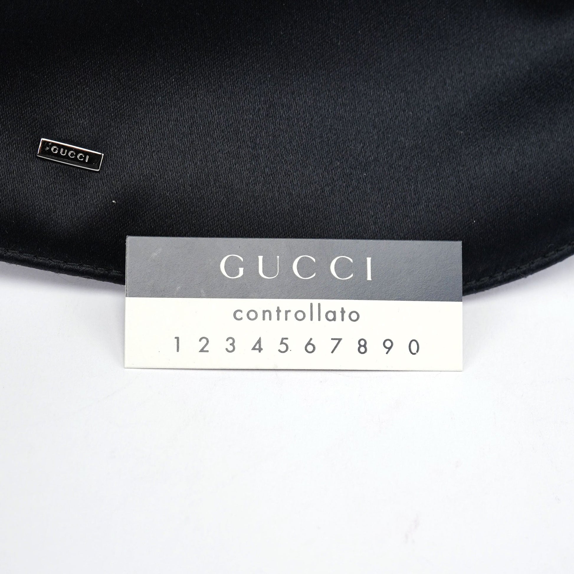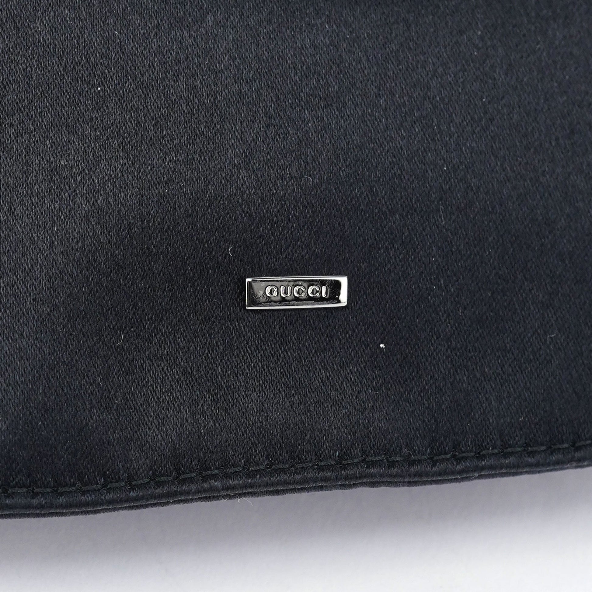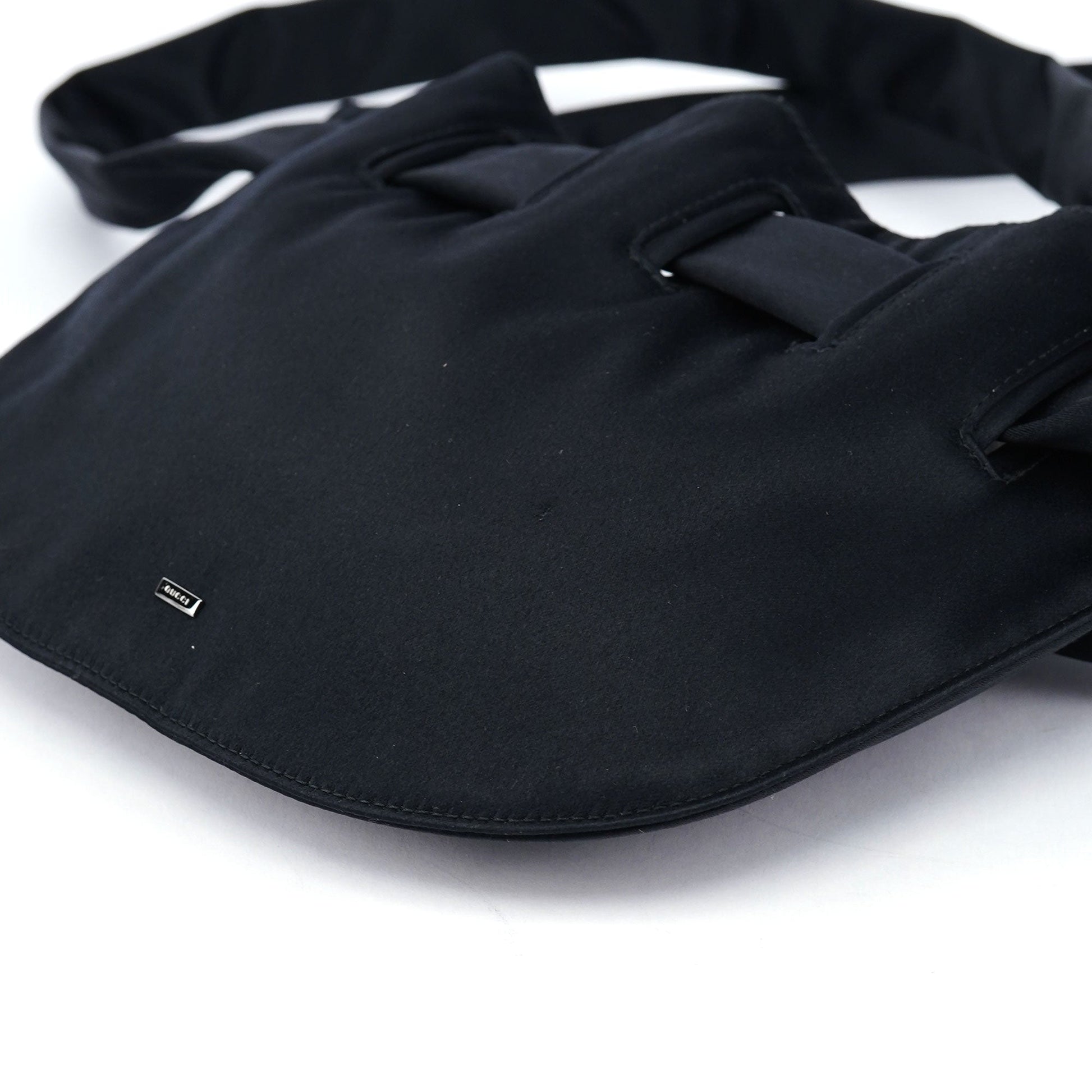 Designed by Tom Ford in the late 1990s, this Gucci shoulder bag is crafted from luxurious black satin and features a dual-handle design that fastens the closure. The front is adorned with the iconic Gucci logo, while the interior is lined in black calfskin leather, embodying refined sophistication.
