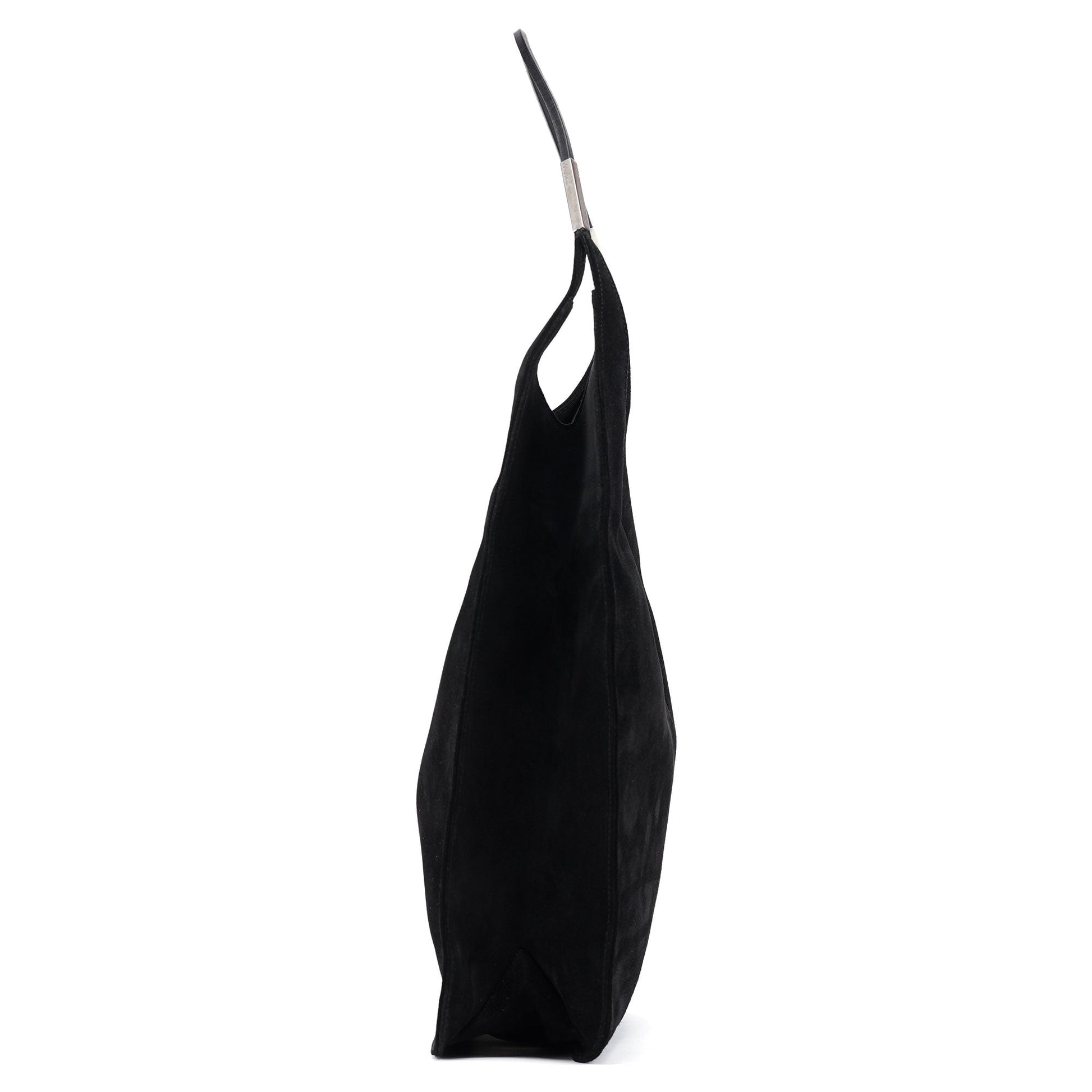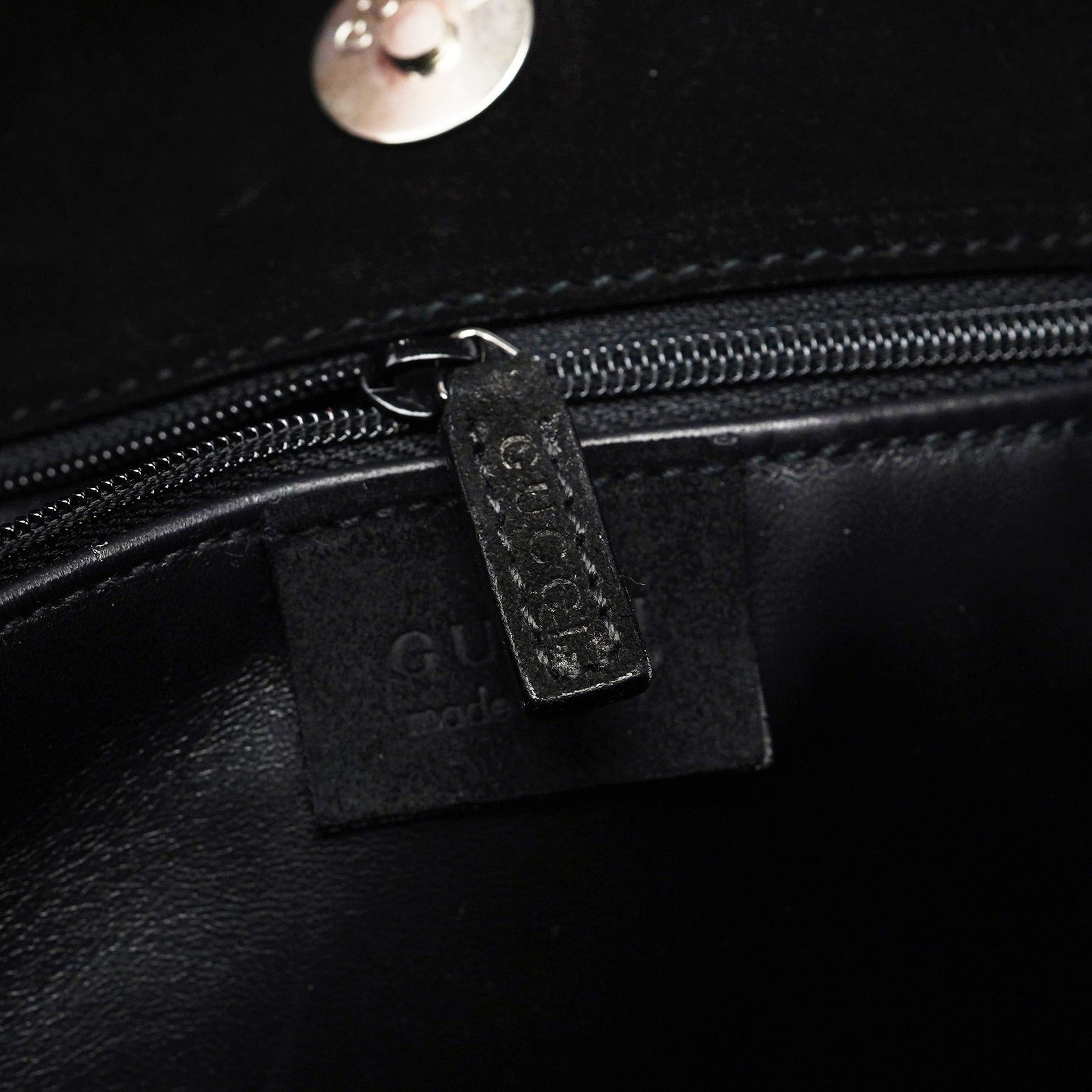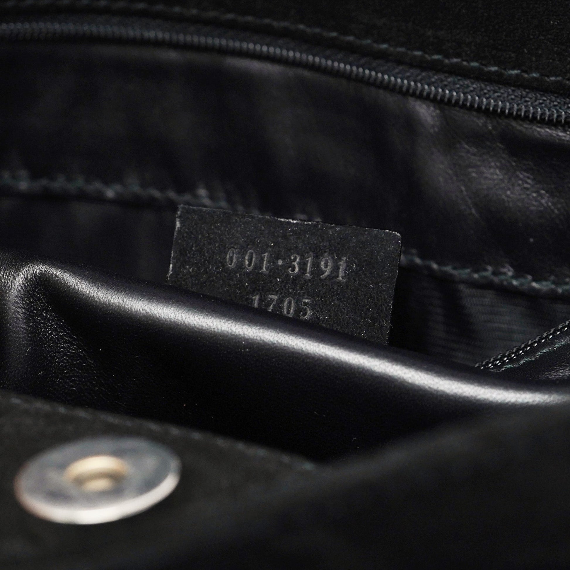 Designed by Tom Ford in the late 1990s, the Gucci Scamosciato shoulder bag is handcrafted from black suede and tonal calfskin leather. It features silver-tone hardware with Gucci logo engraving, a magnetic closure, and a suede-lined interior with a zipper pocket. The Gucci logo is embossed at the front, adding a signature touch.