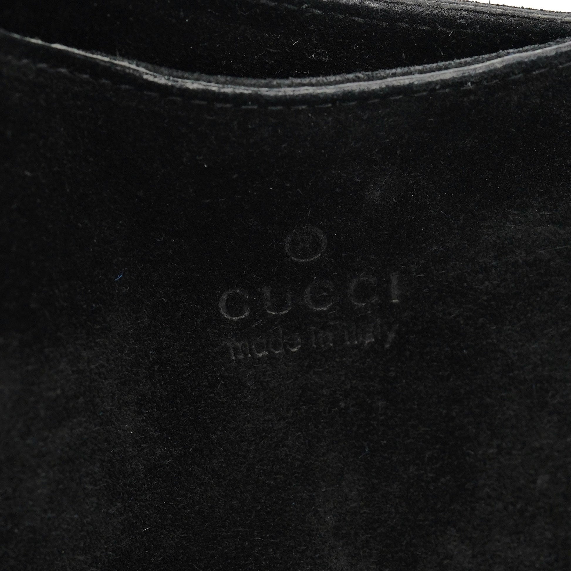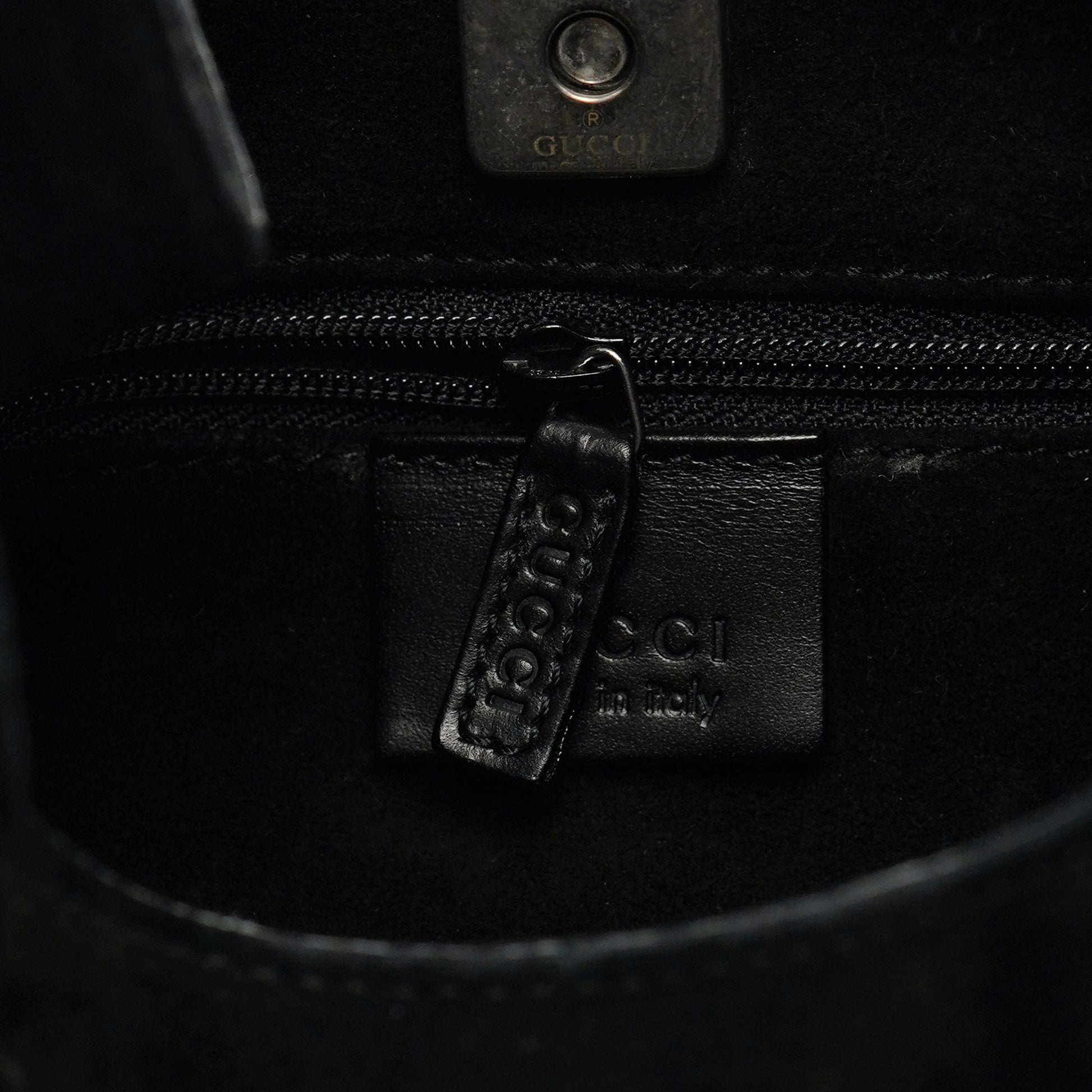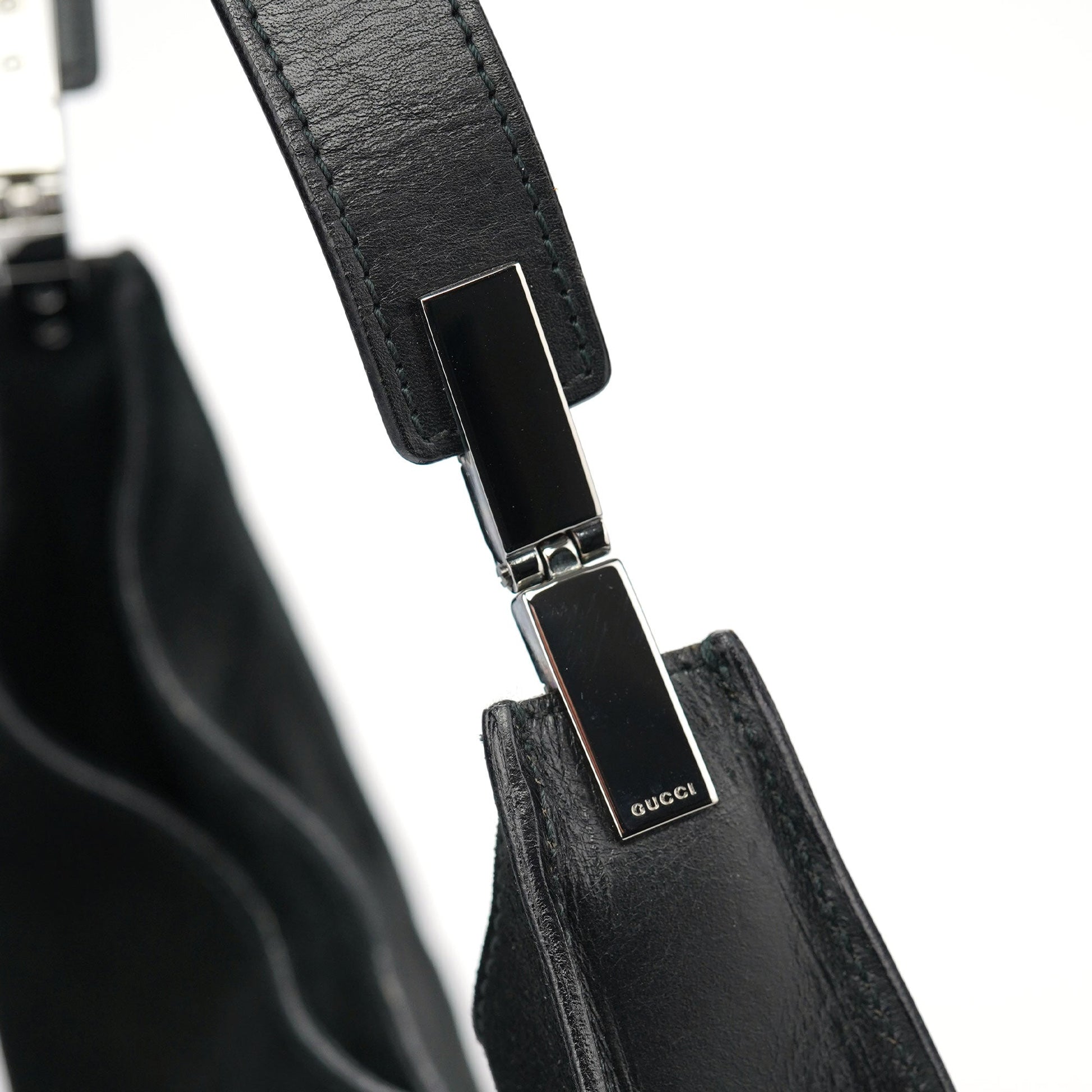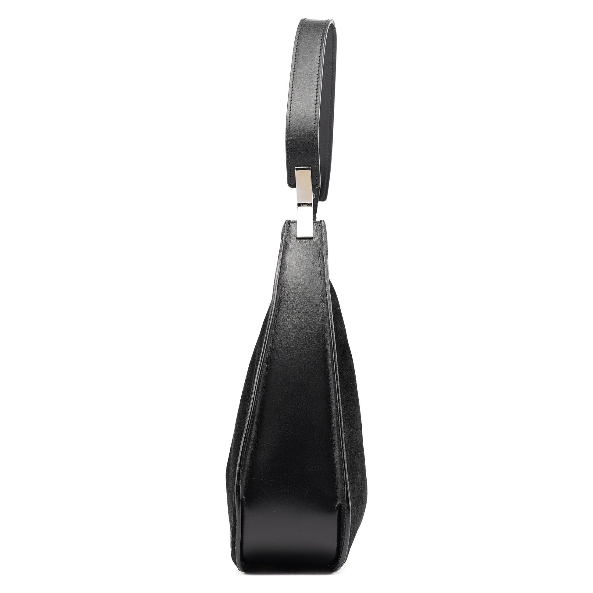 Designed by Tom Ford in the late 1990s, the Gucci Scamosciato shoulder bag is handcrafted from black suede and tonal calfskin leather. It features silver-tone hardware with Gucci logo engraving, a magnetic closure, and a suede-lined interior with a zipper pocket. The Gucci logo is embossed at the front, adding a signature touch.