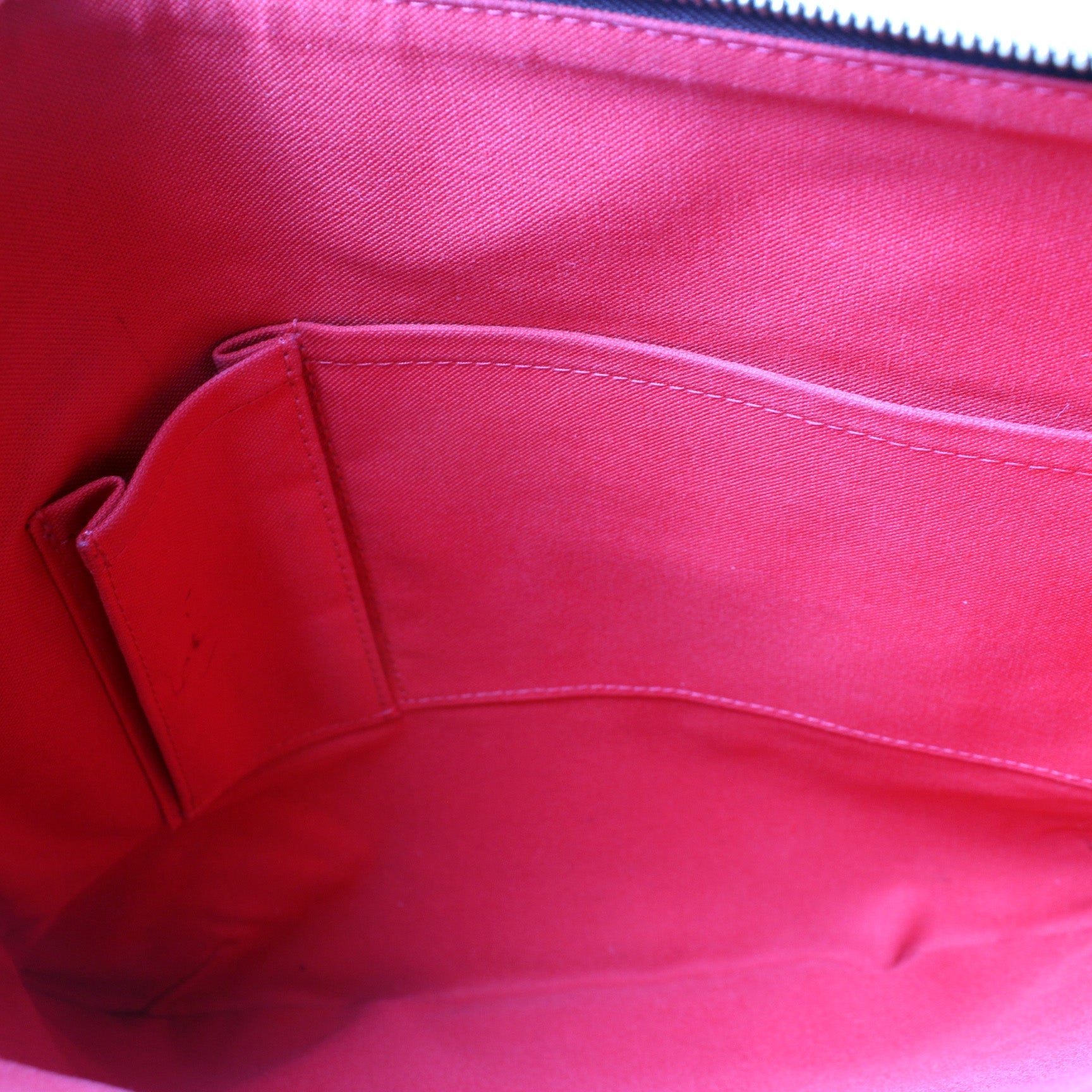 Exterior: The exterior coated canvas is free of any rips or cracks. The exterior features one zip closure pocket as pictured. The corners show signs of wear as pictured.